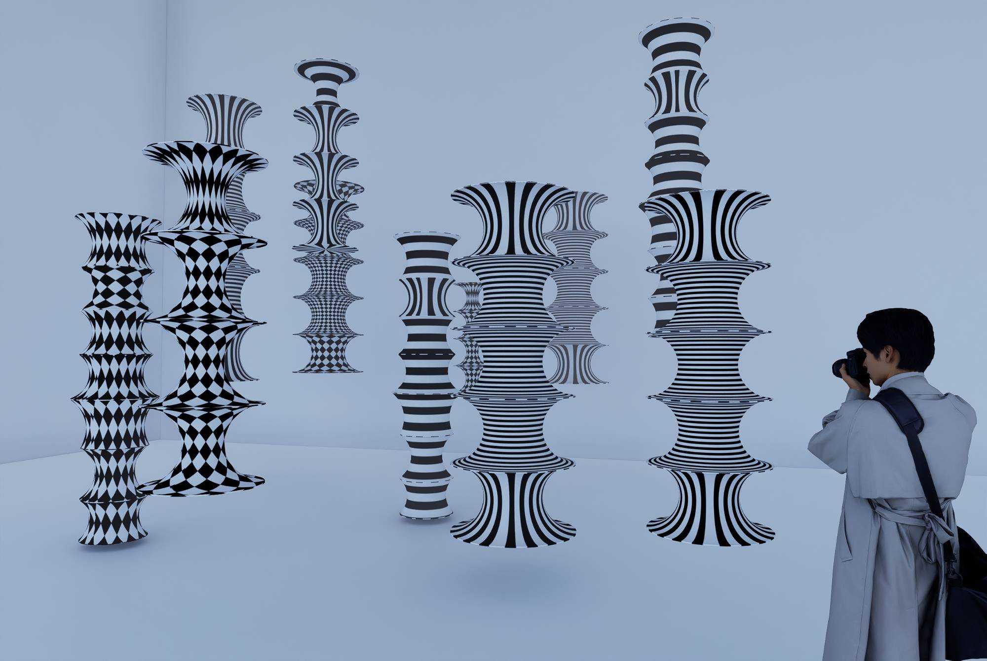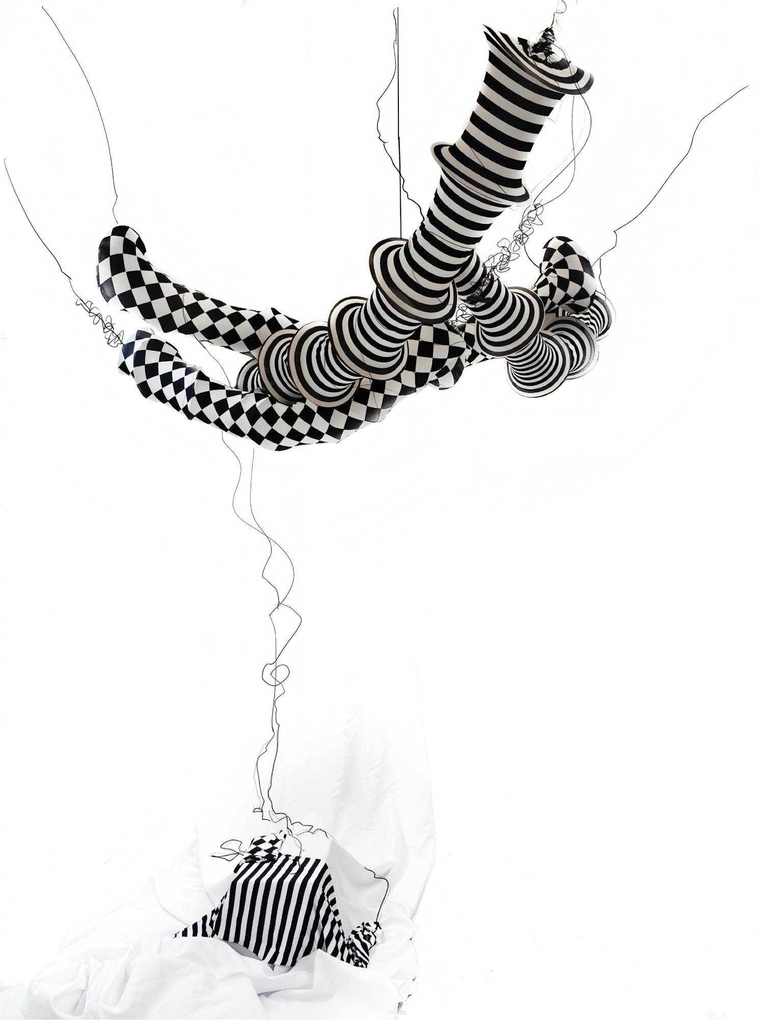 | 韵骨——从柔软的面料到硬朗的形态转变——创造思路借鉴“外柔内刚”的感受切入。通过面料和内置骨架由平面到立体的转译需要不断打磨推敲形成新的物体,外形得到很大的改变和提升,但它的本质仍然不变。用柔软的面料转化成一节节如“骨节”般的立体装置,利用面料弹性的特质展现了它不同的形态,结合黑色软铁丝的缠绕与连接让不同形态的“骨节”形成骨韵的缠绕以诠释“韵骨”。 | |||