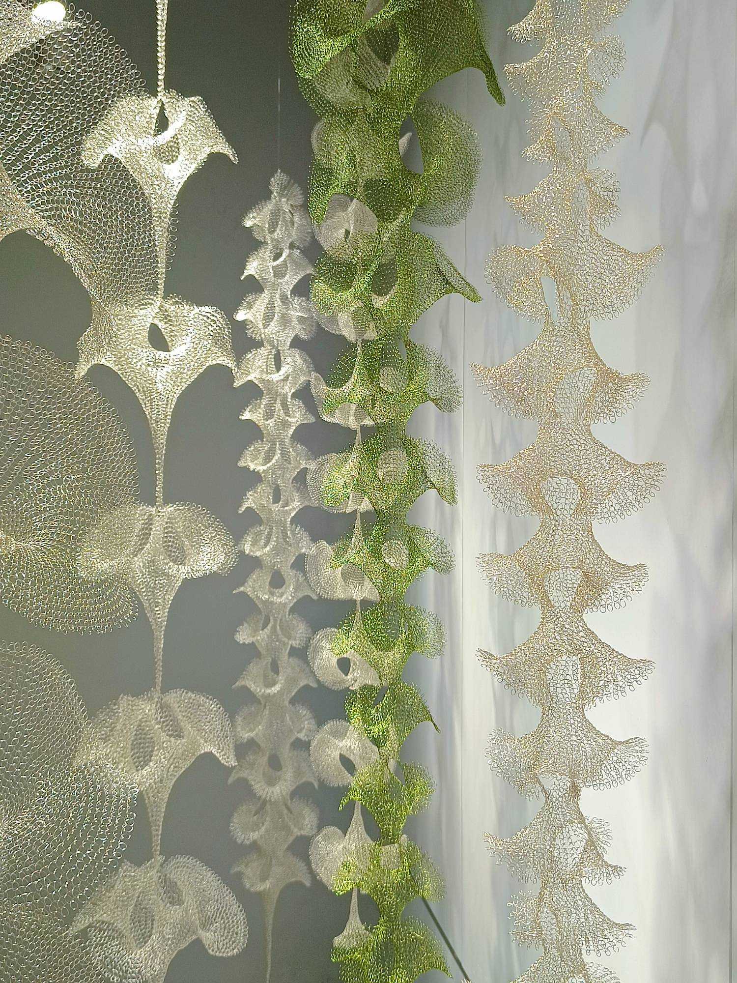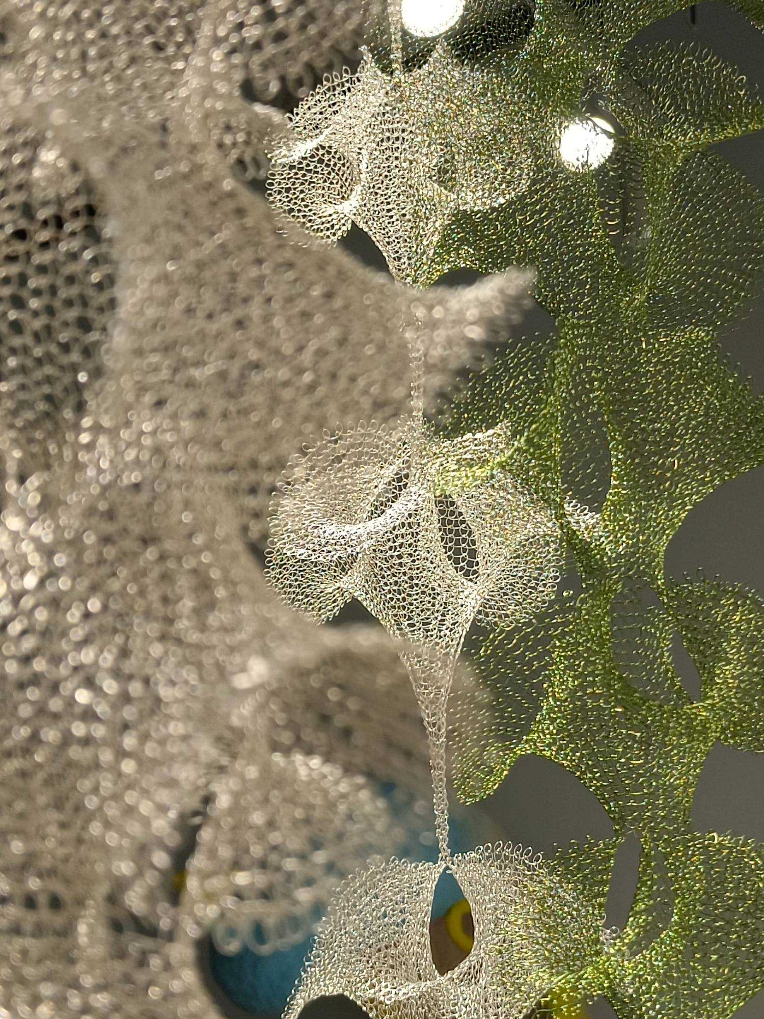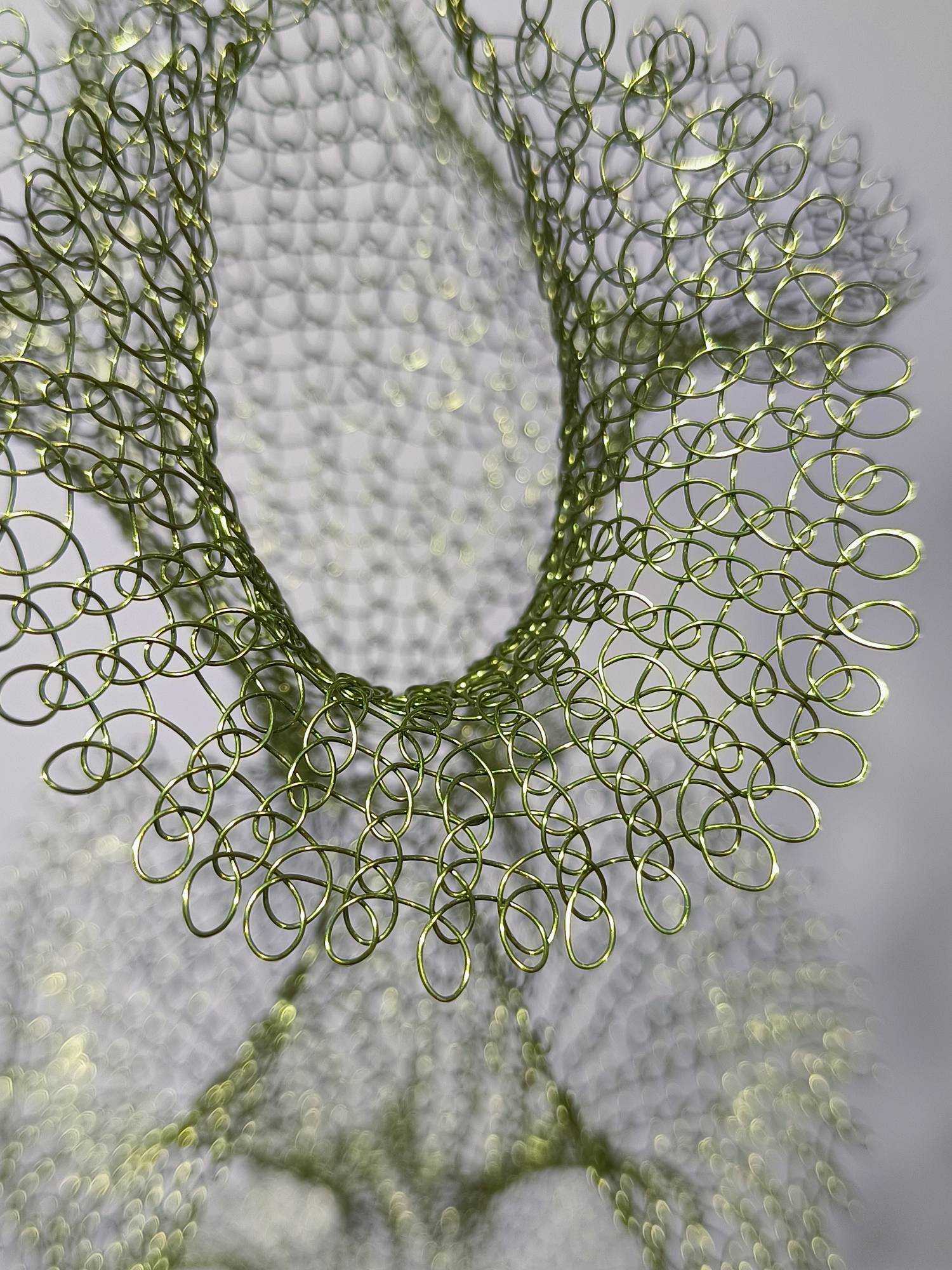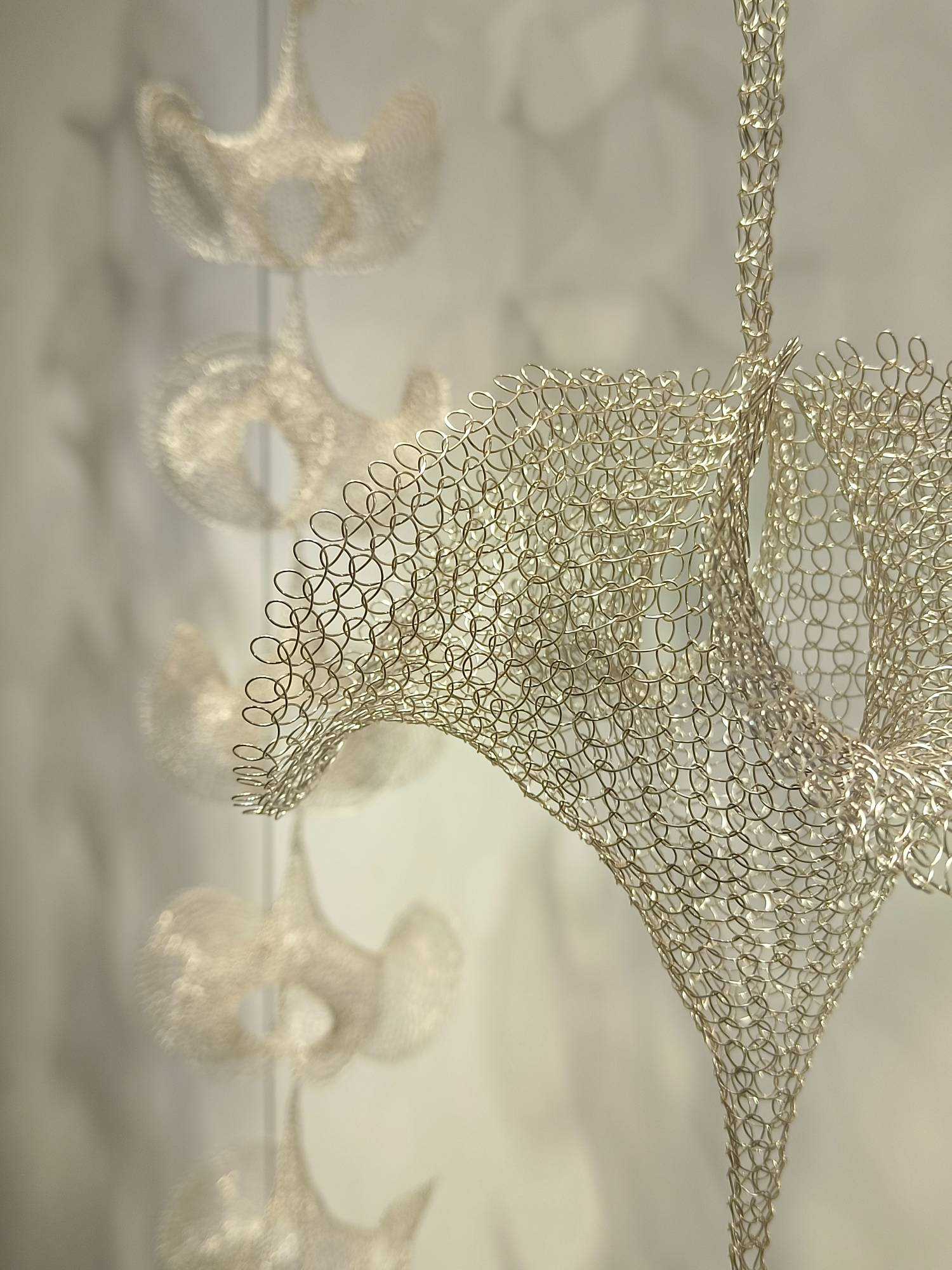 | “在风的空隙里,它悄悄垂下,一根根,织成不被打扰的心绪。” 本艺术装置以金属丝线编织为主要手法,该装置为可自动旋转的动态装置。形态上,汲取自然植物藤蔓元素,通过流畅曲线与起伏造型,营造出灵动飘逸之感。色彩上,以金属本色为主,搭配少量淡绿,既展现金属冷冽质感,又融入自然生机。在空间布局上,悬挂与落地结合,错落有致,观众可穿梭其间在。光影作用下,投射出层次丰富的影子,增强空间立体感与艺术氛围。 | |||