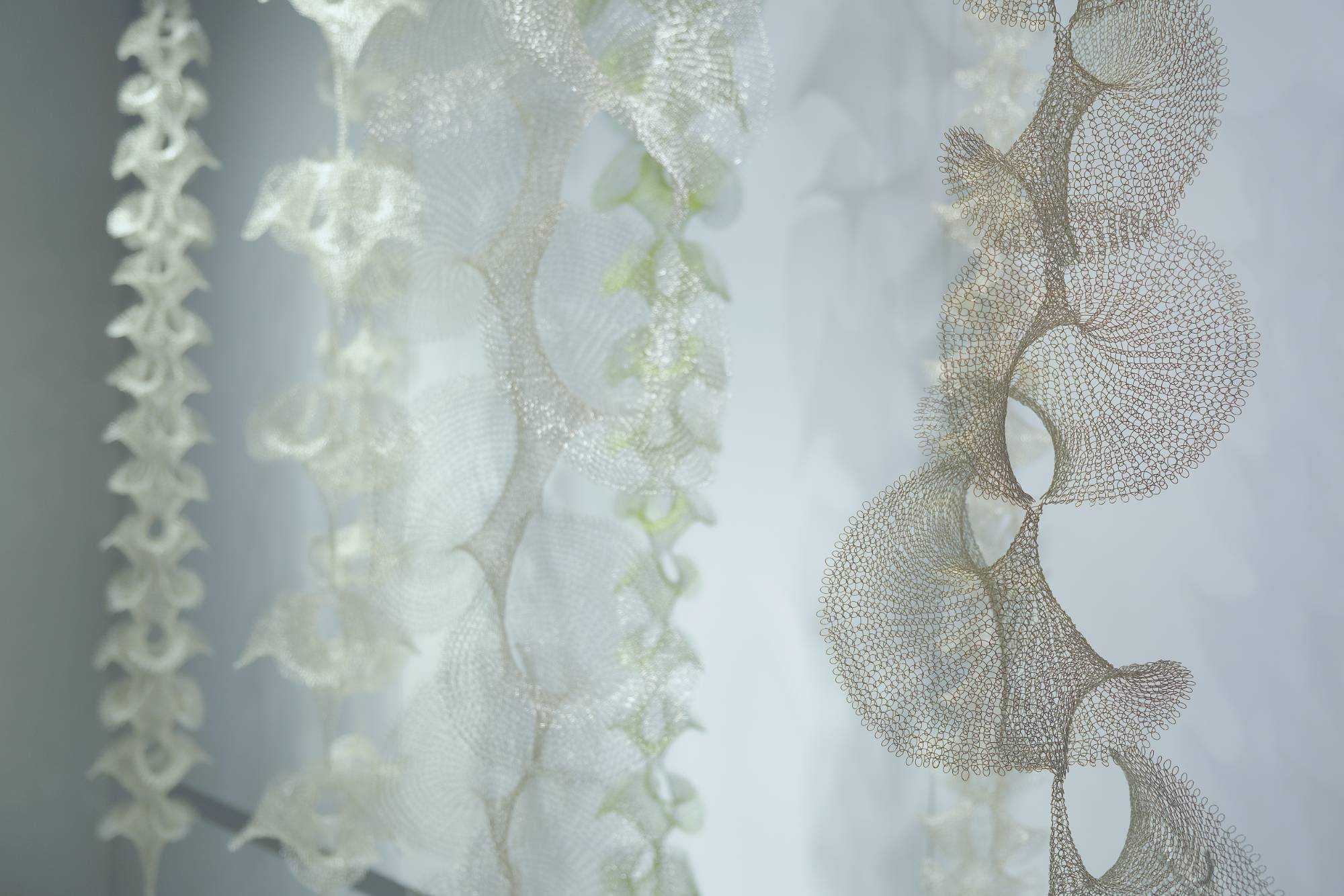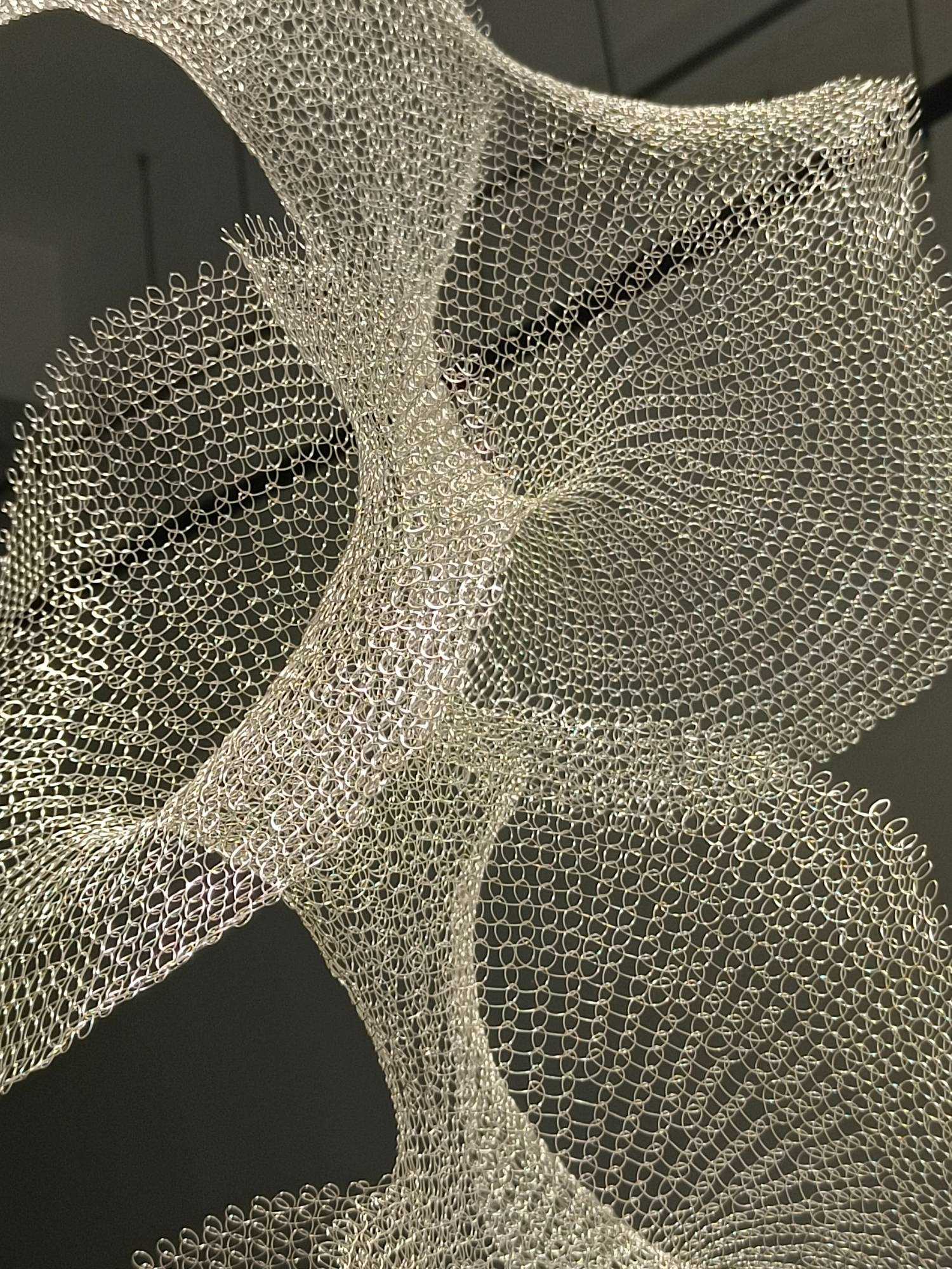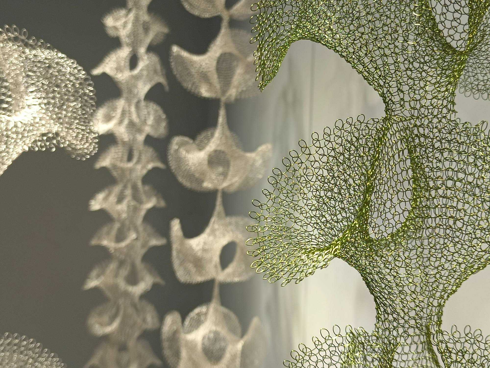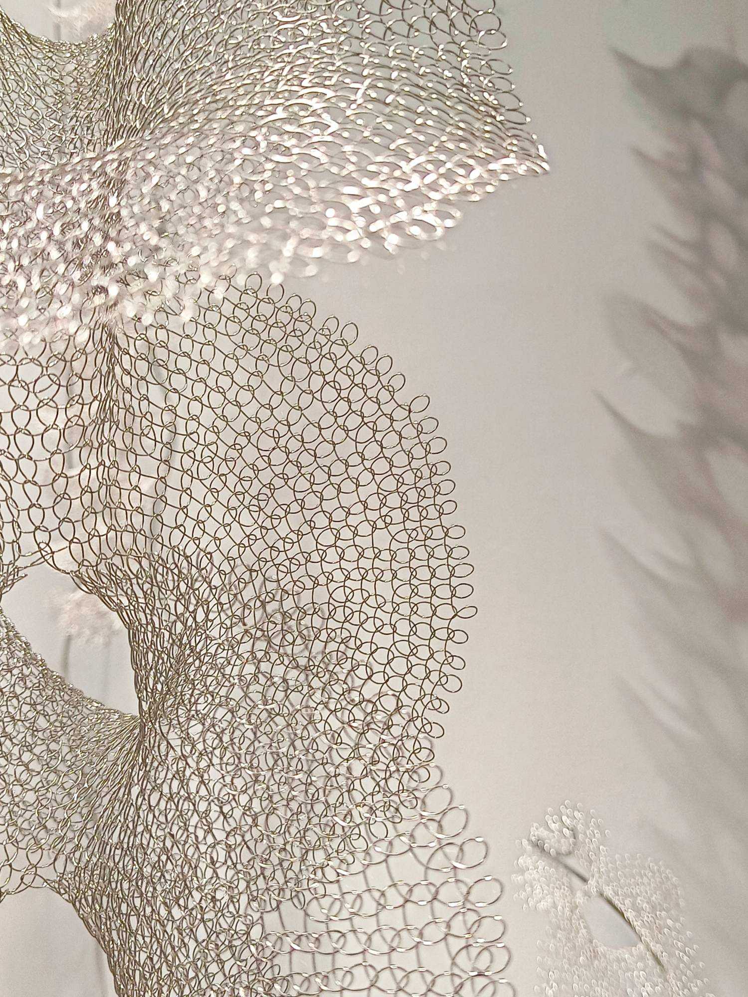 | “在风的空隙里,它悄悄垂下,一根根,织成不被打扰的心绪。” 本艺术装置以金属丝线编织为主要手法,该装置为可自动旋转的动态装置。形态上,汲取自然植物藤蔓元素,通过流畅曲线与起伏造型,营造出灵动飘逸之感。色彩上,以金属本色为主,搭配少量淡绿,既展现金属冷冽质感,又融入自然生机。在空间布局上,悬挂与落地结合,错落有致,观众可穿梭其间在。光影作用下,投射出层次丰富的影子,增强空间立体感与艺术氛围。 | |||