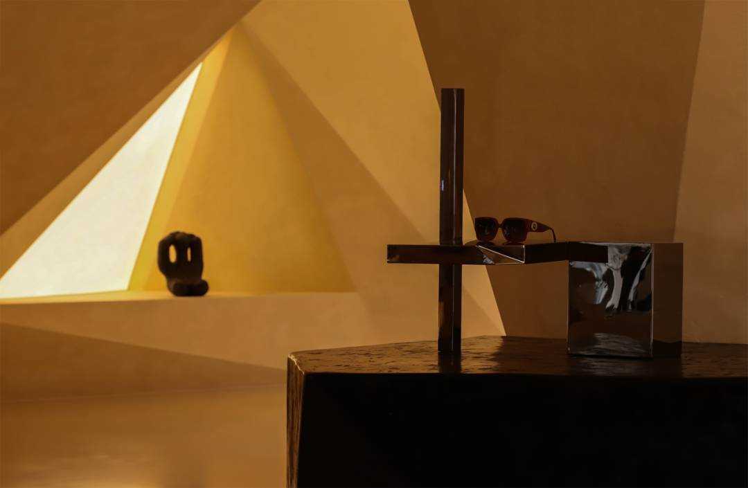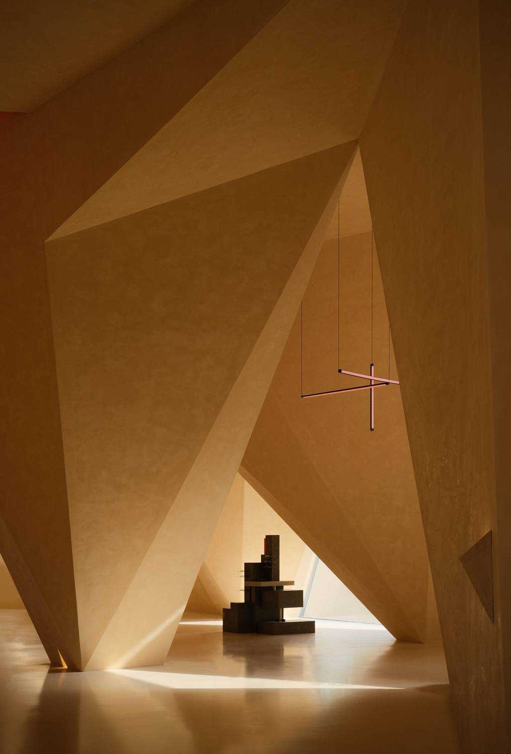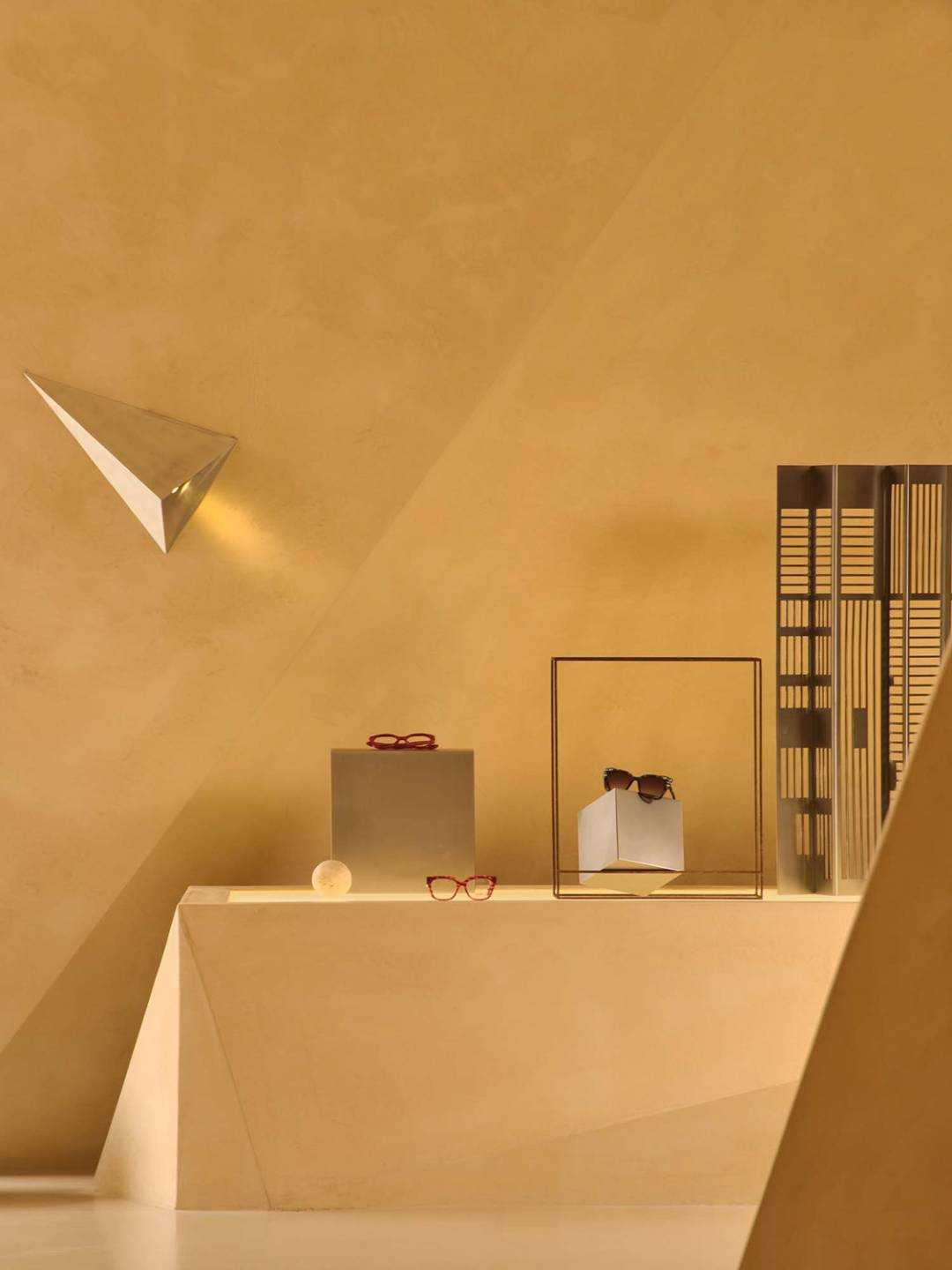 | 这是一次全新策略的商业更新设计 是立足于城市文化基因的革新探寻 以凌驾于商业建筑体之上的目光 柔软地落地在人文的逻辑思考背后 艺术地标式商业思维 浙江温州,一座以眼镜工业著称的城镇里,诞生自1992年的方氏眼镜在经济退行的时代背景下,决定以全新的眼镜艺术展厅为新的转折点,思考商业与文化的碰撞逻辑,重启企业发展之路。 立足于城市更新背景,通过变革传统商业展厅的方式,将方氏眼镜的全新展厅视为立足于城市发展进程中的一座艺术地标,当商业目的被掩盖,存在于我们眼前的是一座具有时代创新风格的解构式艺术展厅,设计的目光早已超越了简单的功能主义空间维度,旨在探索商业空间在工业城市中的有机转型与新的存在模式。 光线为引,形状再生 在天文光学中起源的三角学说,其形态的几何性秩序,意味着未来,象征精神属性的创造。 设计自此概念中提取45°光线作为视线的索引,形成自然的三角几何关系。从眼镜展厅的复杂元素中,抽取“目光”这一概念,作为贯穿空间始终的脉络,把玩着视觉与场景间的互动体验关系,室内照明以软膜灯光为主,隐藏在几何错落间的缝隙里,适量红色灯影调和整体大地色的温暖感,被置于向上凹进的天花内,随目光的靠近而愈发明晰。阳光作为应邀而来的观众,自由地穿梭于场景的结构之间,通过立面的折转,形成束状的光线错觉,并随着时间的游移而不断变换,场景间的明暗层级关系反复交错,创造起戏剧性的沉浸式商业空间体验。 流动的共生空间形态 室内空间打破常规的静态分区模式,以流动共生的空间逻辑作为组织原则,在敞开式的场景内,以光线的走势为脉络,在保持视觉和空间连续性的同时,有机串联空间的功能分区,将装置展厅、咖啡空间与艺术书局三大功能体块进行有机交融与重构。 入口接待为始,脉络依次向内延伸,穿过中庭巨大的展陈空间,光与影在几何结构下交错呼应,不断回应“几何光场”这一命名主题。 于此同时,愈行愈烈的咖啡香气引起人们对空间向内的好奇,穿过几何形体的切分,终于到达预料之外又意象之中的咖啡主题区域,而作为书局存在的阅读空间需要走上楼梯,在相对静谧的状态下,引起场景平面与立面间互动的话题。 这种连贯的,以视觉、嗅觉与直觉为主导的动线路径,将展陈打碎糅合进不同板块之间,使其成为场域间的“连接件”,重新定义商业空间的城市角色。 如此一来,场景在商业组成的前提下,植入新的可成长基因,这是一次对传统零售空间的思维重构,将传统眼镜展厅转译成一座活化地域的城市艺术地标,以此赋予空间更多属性的存在形式,给予更多值得人们踏入并驻足的理由,重新定义商业空间在城市有机体中的角色——不再单一的承担销售与展陈功能,更代表城市基因的一个部分,以传达具有在地属性的精神内核,代表城市的某个具象缩影。 柱体被几何化重塑,光线穿梭其中,形成犹如舞台布景般的层次感。 空间整体采用新型环保艺术漆,为顶面、立面、地面三面打造一体的视觉感受,场景如同一个完整而连续的雕塑,带来错综的迷途般的路径感受,复杂又简单,紧密且疏离。 室外空间作为内场地的序言,摒弃传统园林式的繁复设计,以后现代美学主义意象的几何体块呼应场地的元素精神,高低折转的地面与透明玻璃的窗景,打破边界,视线城市建筑的呼吸共振,从而创造出一个完整的城市建筑艺术设计。 | |||