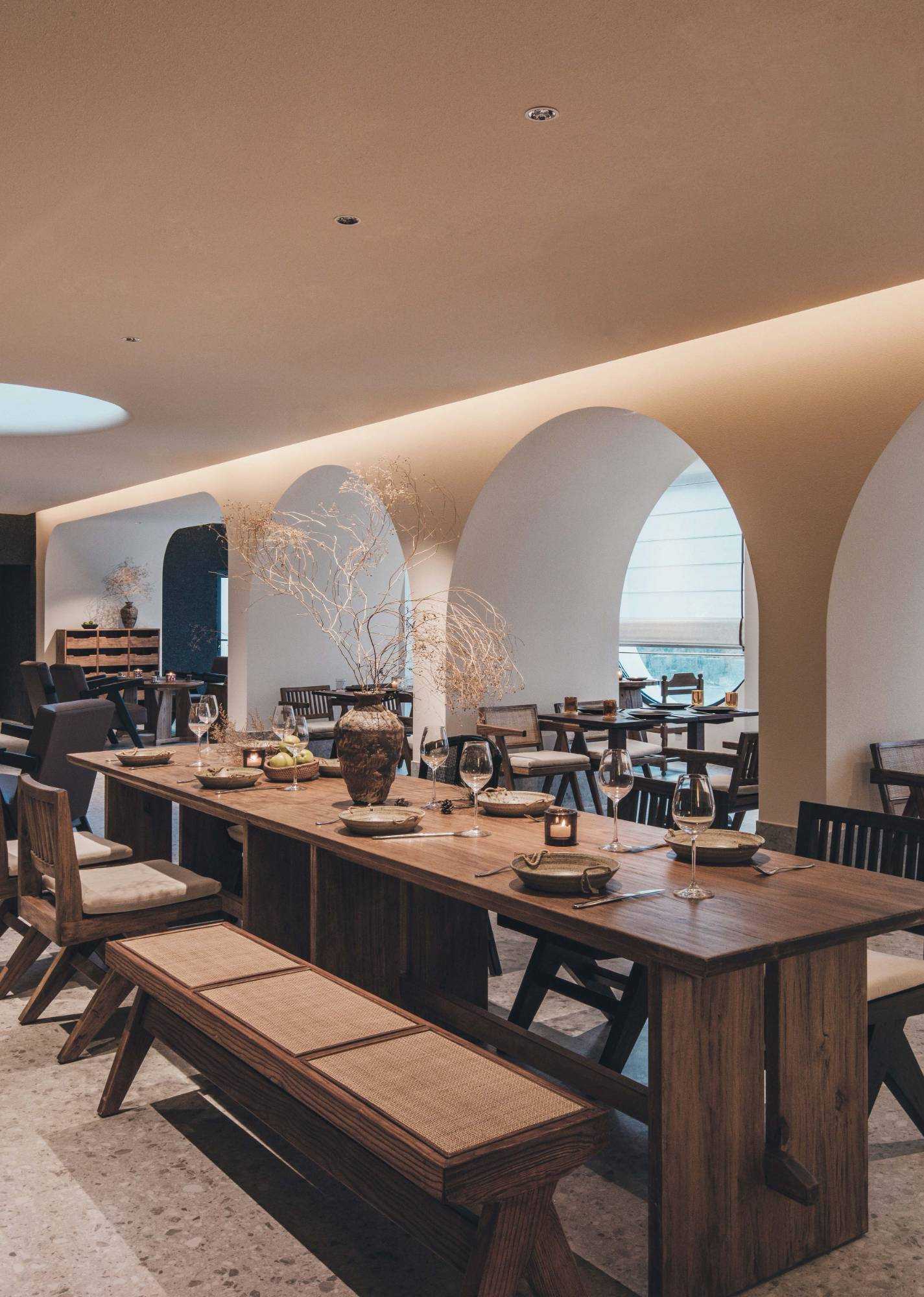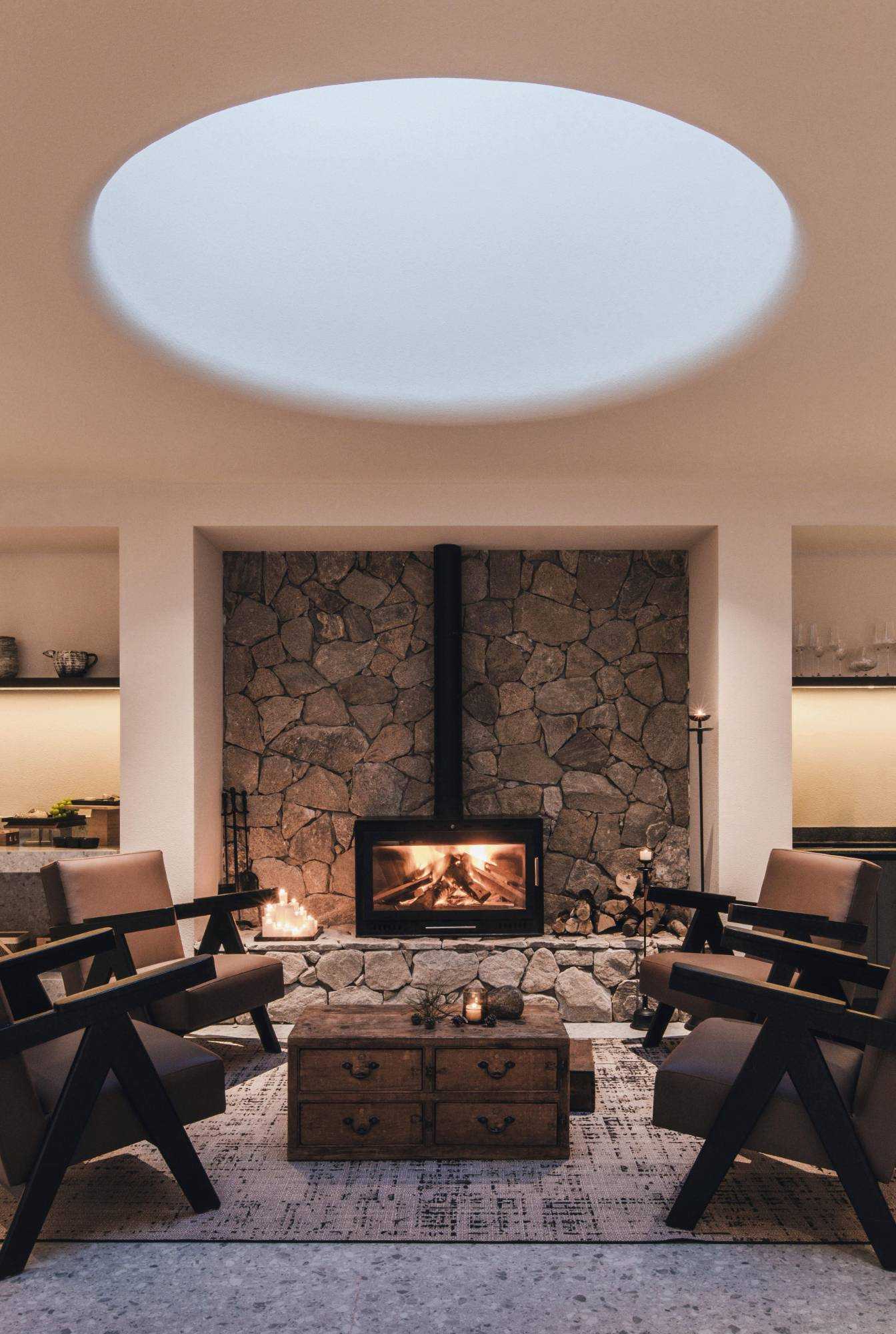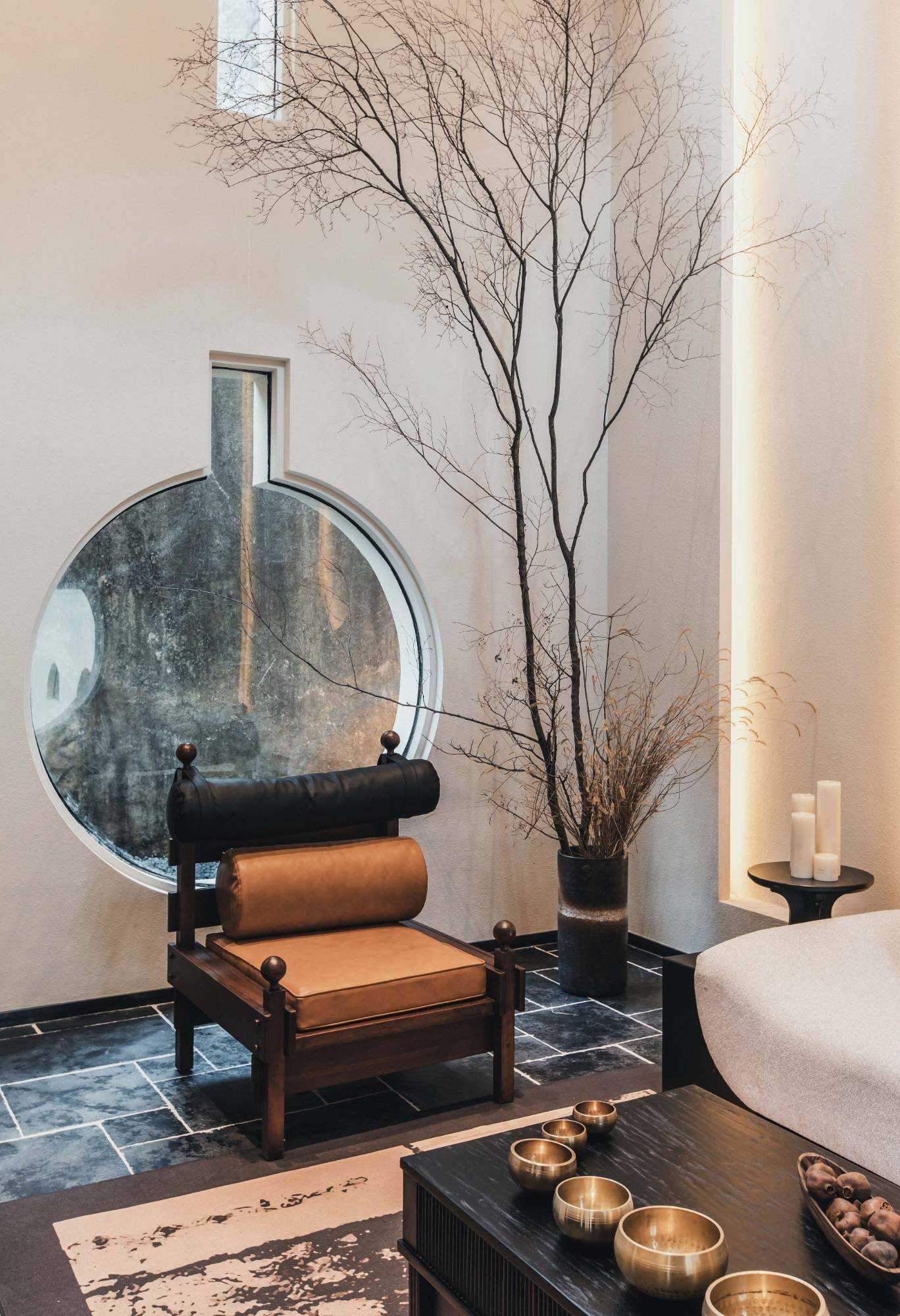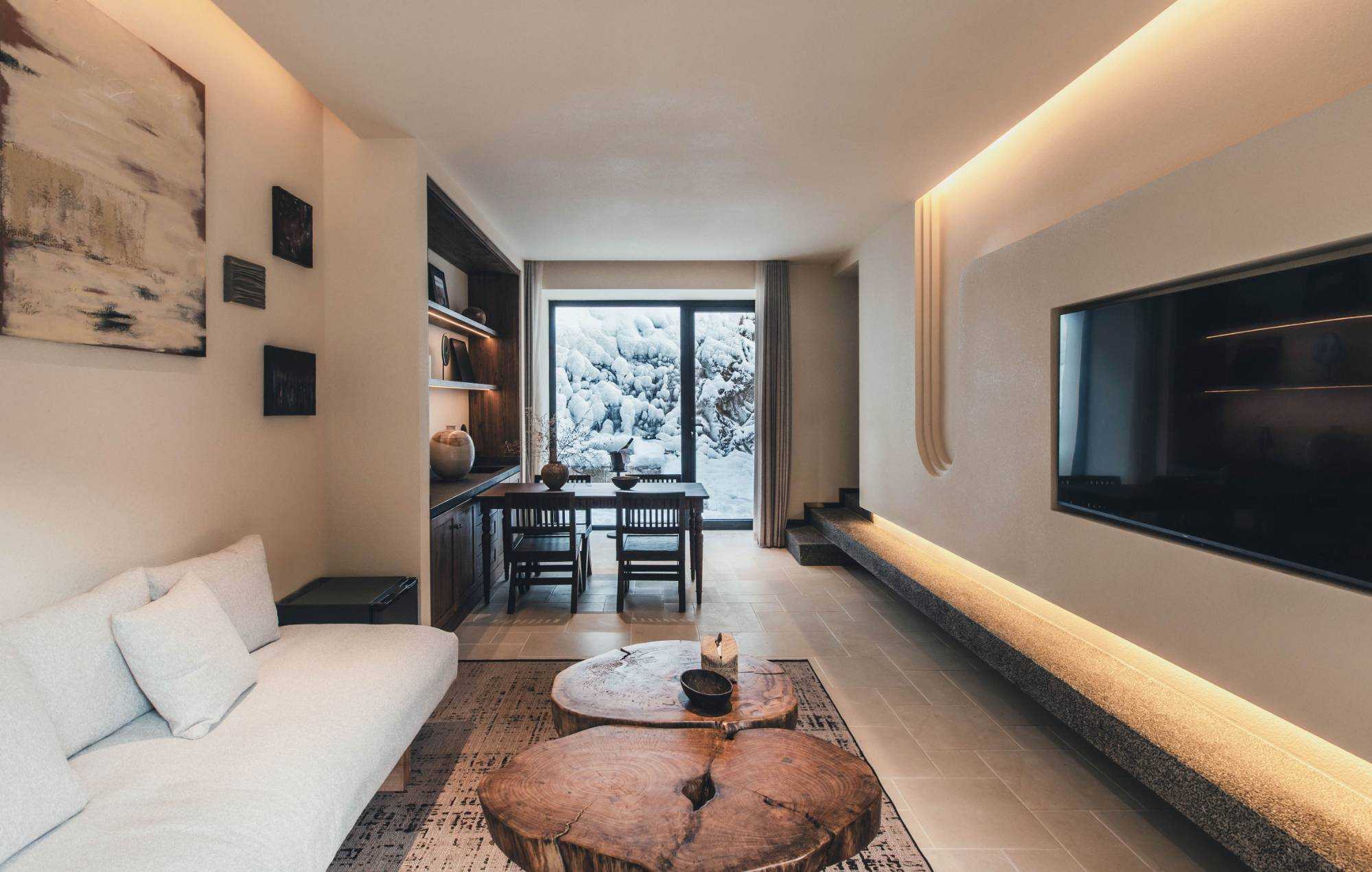 | 京城北方山区的密云,群山之中,素有“北方第一冰瀑”美誉的白河大峡谷-天仙瀑,在料峭冬寒里,呈现出冰瀑奇观。往日涌动的溪流也在四季的最后,化身一条银河,在冷冽的孤寂中,定格冬日的影像。 山麓的原野一展无垠,山前耸立着一座静谧的解构建筑,其名为“嶙庐”Ubaia,意为“嶙峋山间的居所”。暮色苍茫中,山巅残留着淡淡余晖,建筑散发出柔软灯火,仿佛要将冰封融化。 建筑分为三层,向着山体的方向逐层递增,拱形门洞与长方体块穿插的几何解构,让其外形宛若一间山中的艺术馆,亦如一首献给山谷的散文诗。从建筑一层的中线进入到内部,眼前是酒店接待公区,即集合了酒吧、咖啡、西餐、休闲为一体的综合性餐厅。 空间将外部拱形元素沿用,在米色系空间营造的松弛氛围中,原木餐桌椅尽显几分古朴气质,碰撞出独属于山间的野奢风情。建筑大师弗兰克·赖特曾说:“壁炉是生活的中心。”在餐区一旁,以壁炉为中心的休闲区石墙原始粗粝,石块特有的野性被炉火细致勾勒,加之顶部的圆形天光设计,仿佛置身于山野部落。与三五好友于此相聚,推杯换盏之间,暖意在心底蔓延,欢笑在空间响彻,享受世外之地的纯粹时刻。 从一层拾级而上来到二层空中庭院,层次多变的建筑解构,让人再次惊叹自然场域之巧妙,居于二层室内空间入口的黑色球体犹如一颗深邃的明珠,吸纳着人杰地灵的气韵。庭院中心有一方瀑布泳池,在夏季,它会成为供人娱乐的小型浴场,而在冬季,整片庭院则转化为瞭望远山与野长城的观景台。 设计场域之初即融入“蒲芦之地”,蒲芦是古代对葫芦的别称,因此在设计之中引用了葫芦元素,以融入在地文化。由二层庭院进入的冥想空间,因解构的葫芦造型窗景,而极具神秘色彩。两只葫芦对立示人,下方的葫芦框住后院的巨石景色,上方的葫芦则看得见远山与天空,有着“天地运而相通,万物总而为一”的哲学意境。 贯通两层的挑高空间以米色营造雅静,复古石材地面则以黑色营造庄严,在此进行茶艺、插花、冥想等活动,自有一番遁入心流之境的深沉浸式体验。 嶙庐设有多种形式的客房,窗户依着后山巨石的称为观石房,室内以无幕帘淋浴间为特色,可以享受身临其境的“自然野浴”,带有私汤的套房,则能满足多口之家前来就住的需求。 在城市喧嚣中久居,内心总渴望到达一片能让灵魂休憩的净土,而邂逅“嶙庐”,便是踏足一次极致的身心灵之旅,让山林野境的滋养,深刻而绵长。 | |||