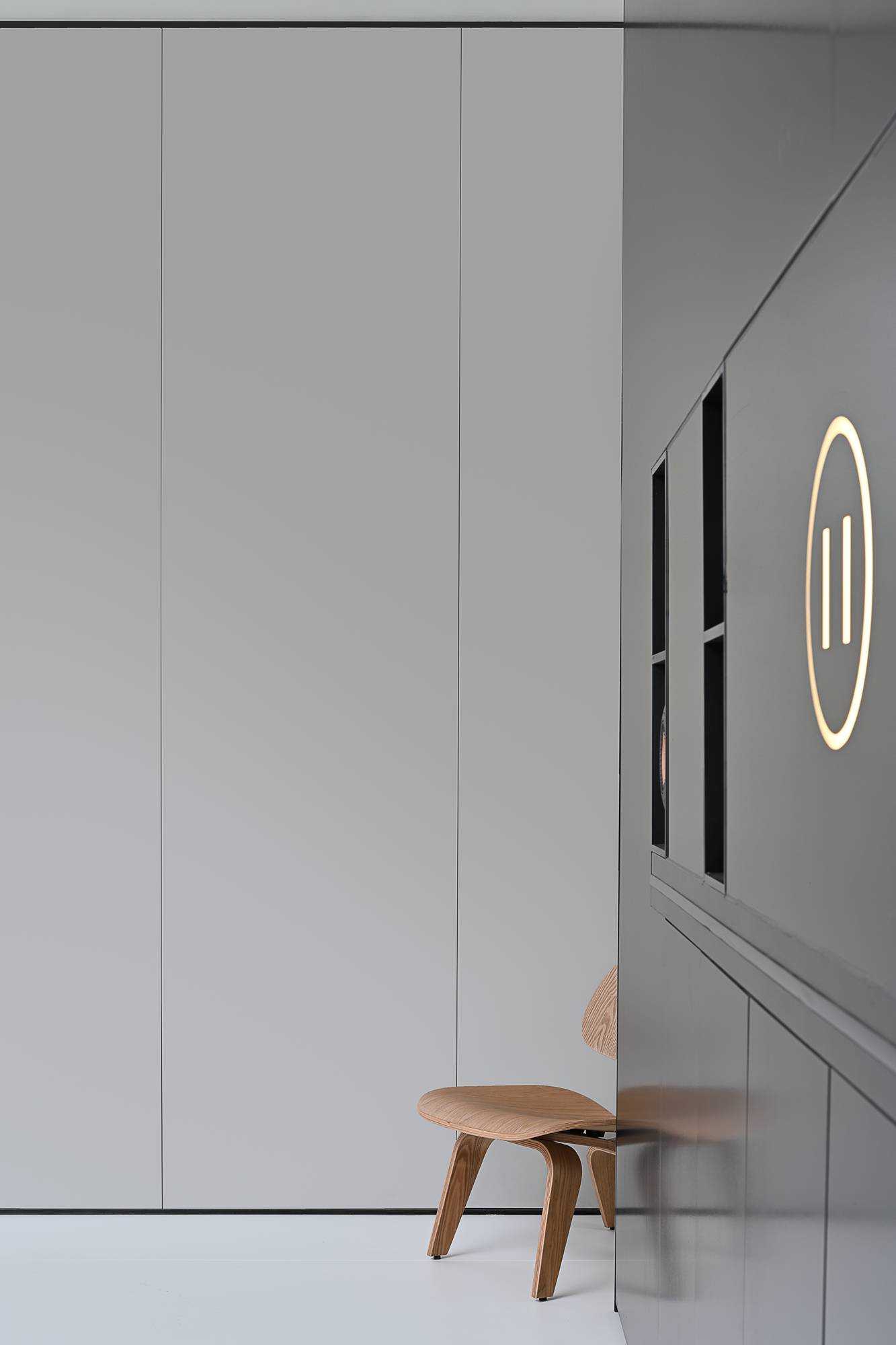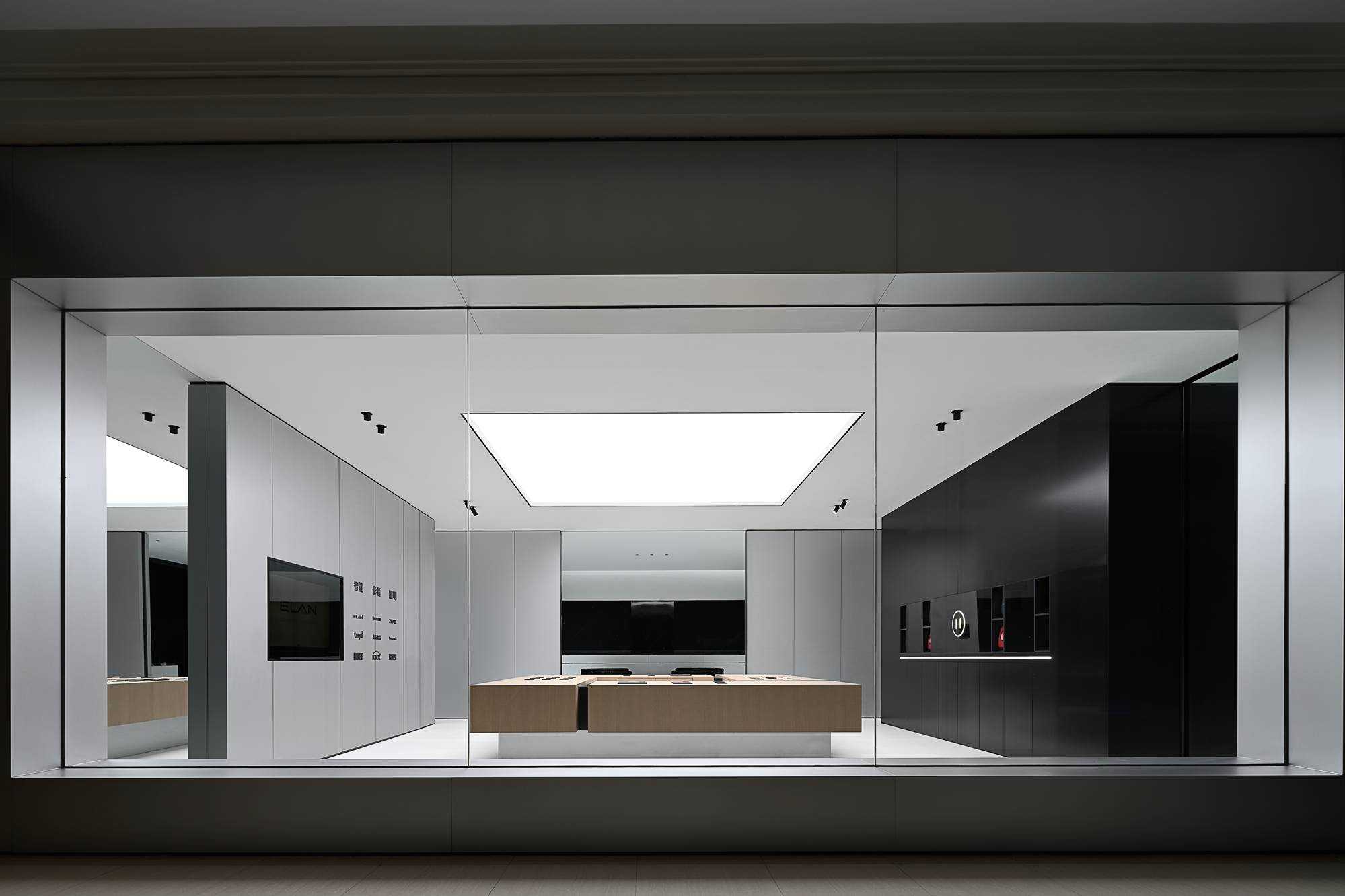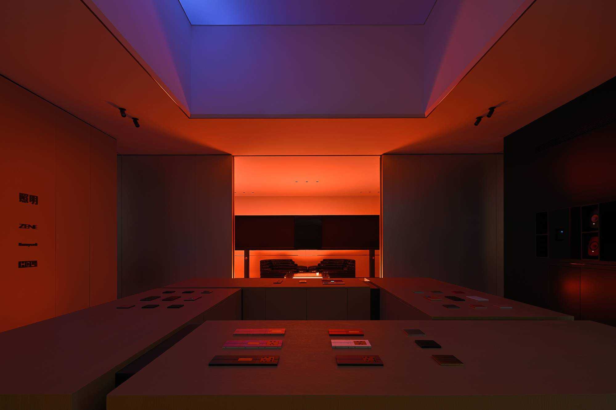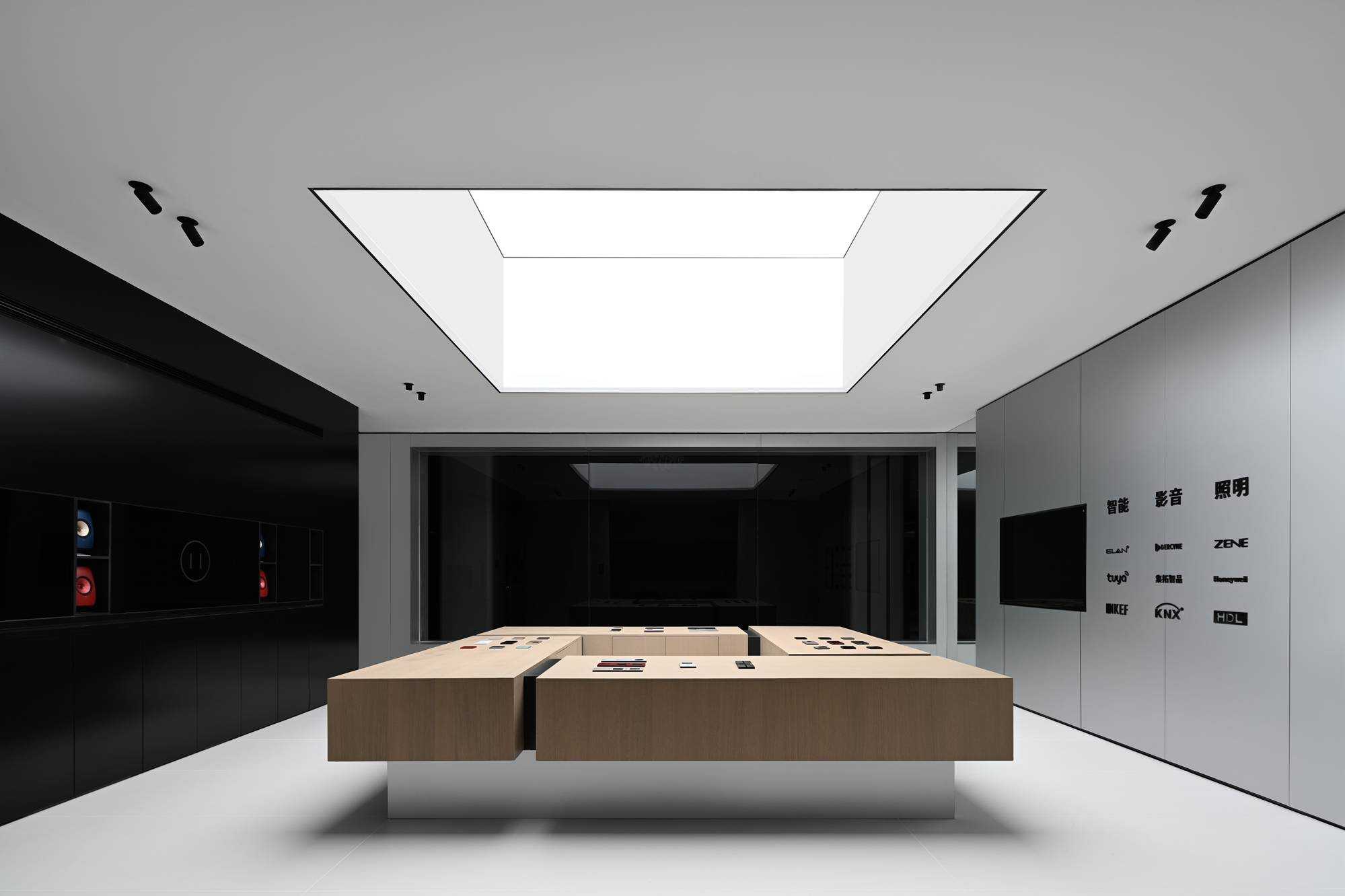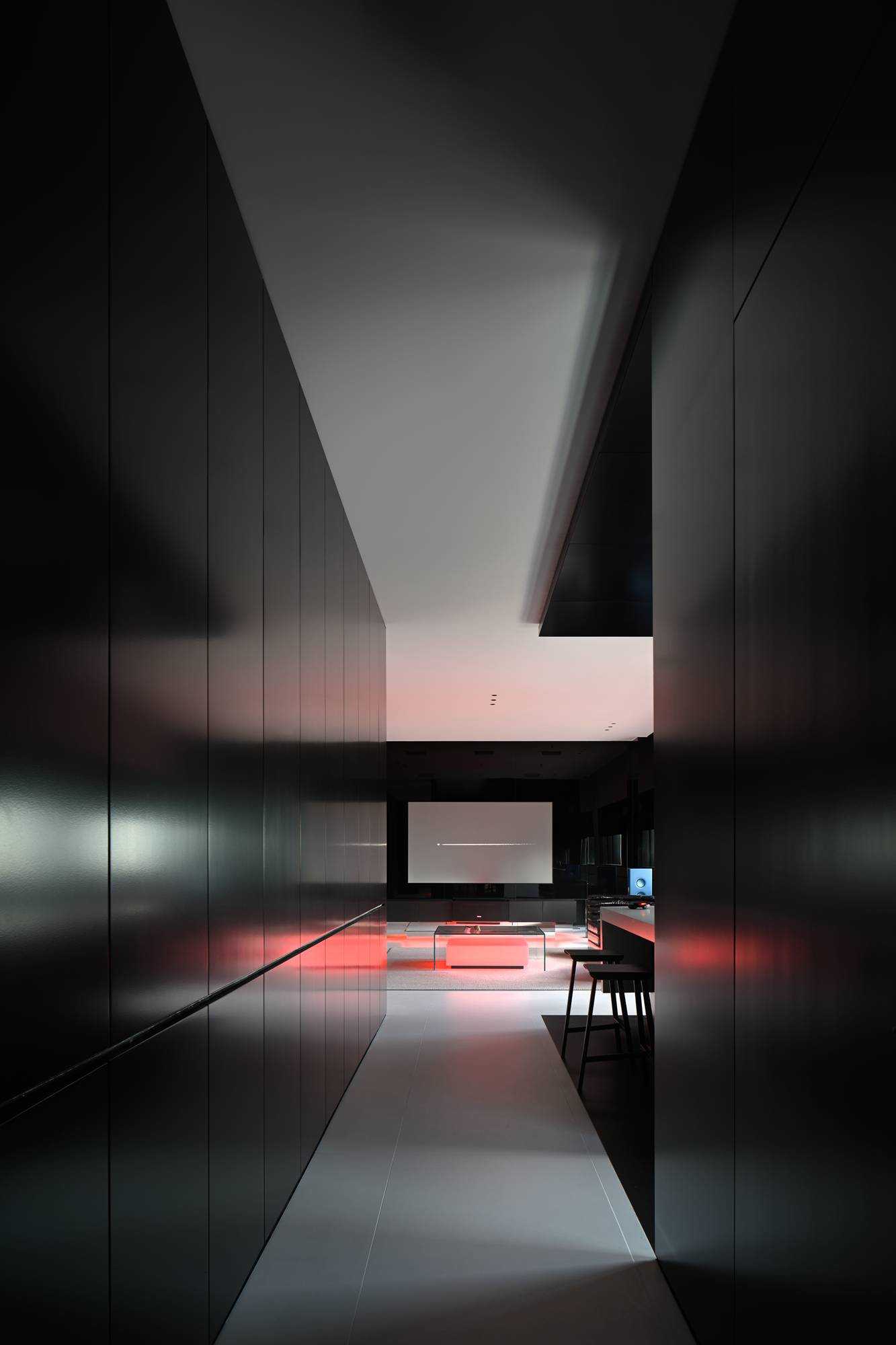 | 本案是集拓智品全屋智能体验馆,项目位于喜盈门(莆田)建材家具广场5F。 展厅由三部分空间区域组成,分别为产品展示体验区,家居智能体验区,接待及办公区。整体以科技元素为主题,通过光的不同建构,表达空间和材料的情绪。 在空间构造上,我们尝试用建筑的手法去表达,通过在空间中构建围合状墙体,将原空间自然分隔出不同的场域。入口的斜墙是一种退让的姿态,也是功能的需求和视觉的引导,墙体的斜切为空间带来了强烈的视觉感官。玄关的墙体起到对办公区的遮挡作用,也承载了封闭影音室的功能需求;通过居中置入的影音空间巧妙地构建出会客区和办公区两个主要的功能空间。 设计希望通过全玻璃幕墙,在较小的展示空间的创造更多的展示面,从展厅外透过玻璃幕墙看进去,就能洞悉整个玻璃盒子中空间的生长,配合渐变效果的灯光系统,让整个展厅仿佛拥有了呼吸和生命。 长桌组织出符合需求的洄游动线,兼顾了实用性美学与自如畅谈的情景。既保障了互动的舒适感,又衍生出了不被强制要求的分序感。讲述空间、质感、情绪的关系,引领人沉浸其中。 展厅智能家居产品体验区,通过智能系统的控制,可实现在不同心境或使用场景下的全屋家居一键联动控制,包括灯光、电视、音箱、投影、窗帘、甚至壁炉等。 纯净无瑕的灯膜顶光,刷新了开敞空间的光感,沿着中轴线望去,唤醒了心中的想象与理想。原木饰面,保留隔断的完整感,结合多元的分区智慧,平衡了收纳空间与展示效果。 休闲区带有灯光效果的玻璃茶几是一个虚幻的载体,它打破了空间的静默,是整个空间中最躁动的存在,既对立而又协调。 通过镜面分割,使得各种区域的交互关系以及独立的意识,构建了灵活又通达的路径,穿梭在空间内,感受灵动的光影层次,满足情趣追求。 在各个空间中,植入不同大小的律动色彩的光膜,让客户在体验游走间完成一场光的演艺。以一团光显现亚克力茶几轮廓,让多层次的“影”辅助光的叙事,令人忘我地起舞。 本案是我们对未来智能家居空间设计的期许和幻想,通过对集拓智品在全屋智能系统的技术展示,包括智能灯光控制的全场景体验,智能窗帘系统的体验,以及智能家庭影院的体验空间,探讨下一代智能居住形式的进化与未来。 | |||