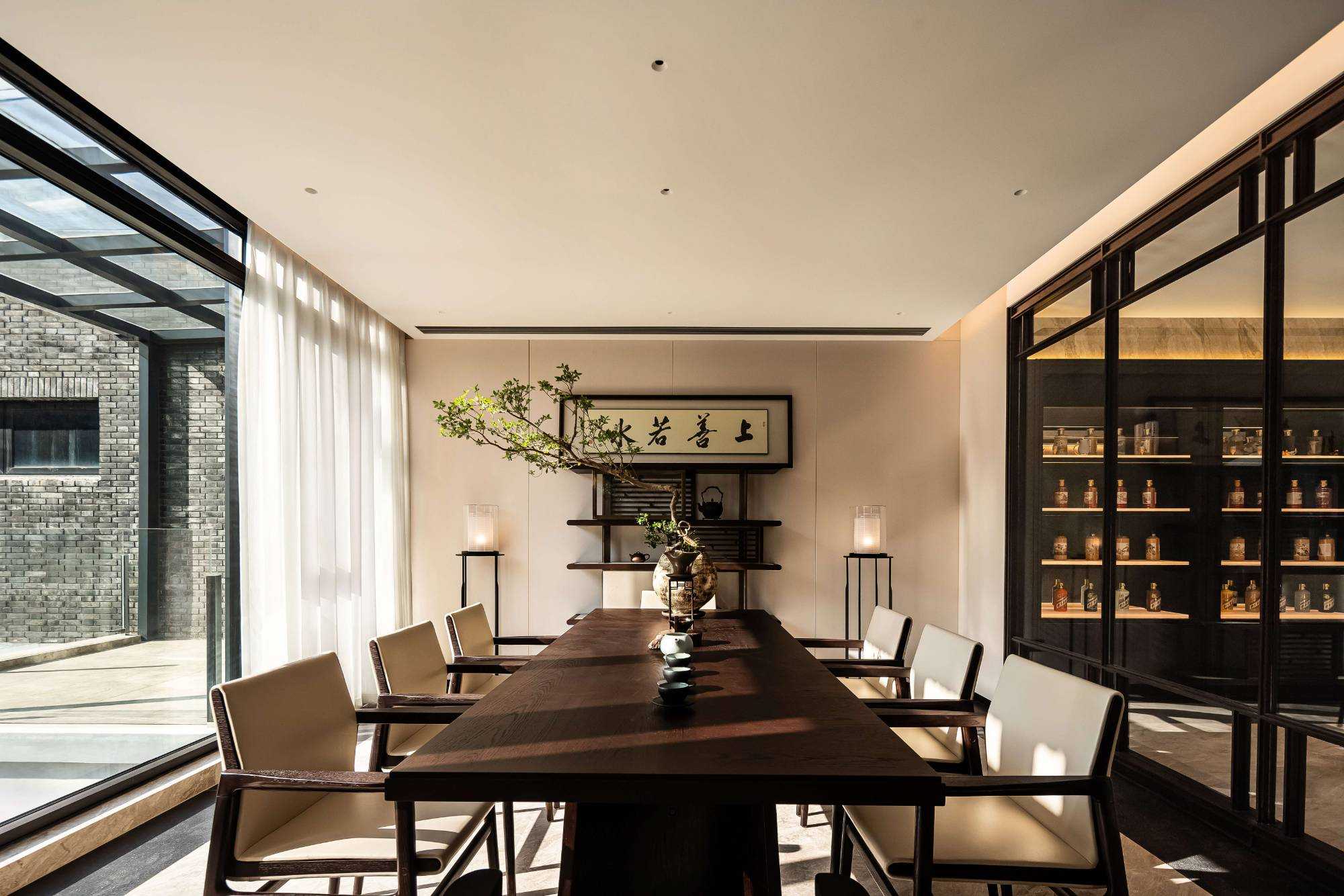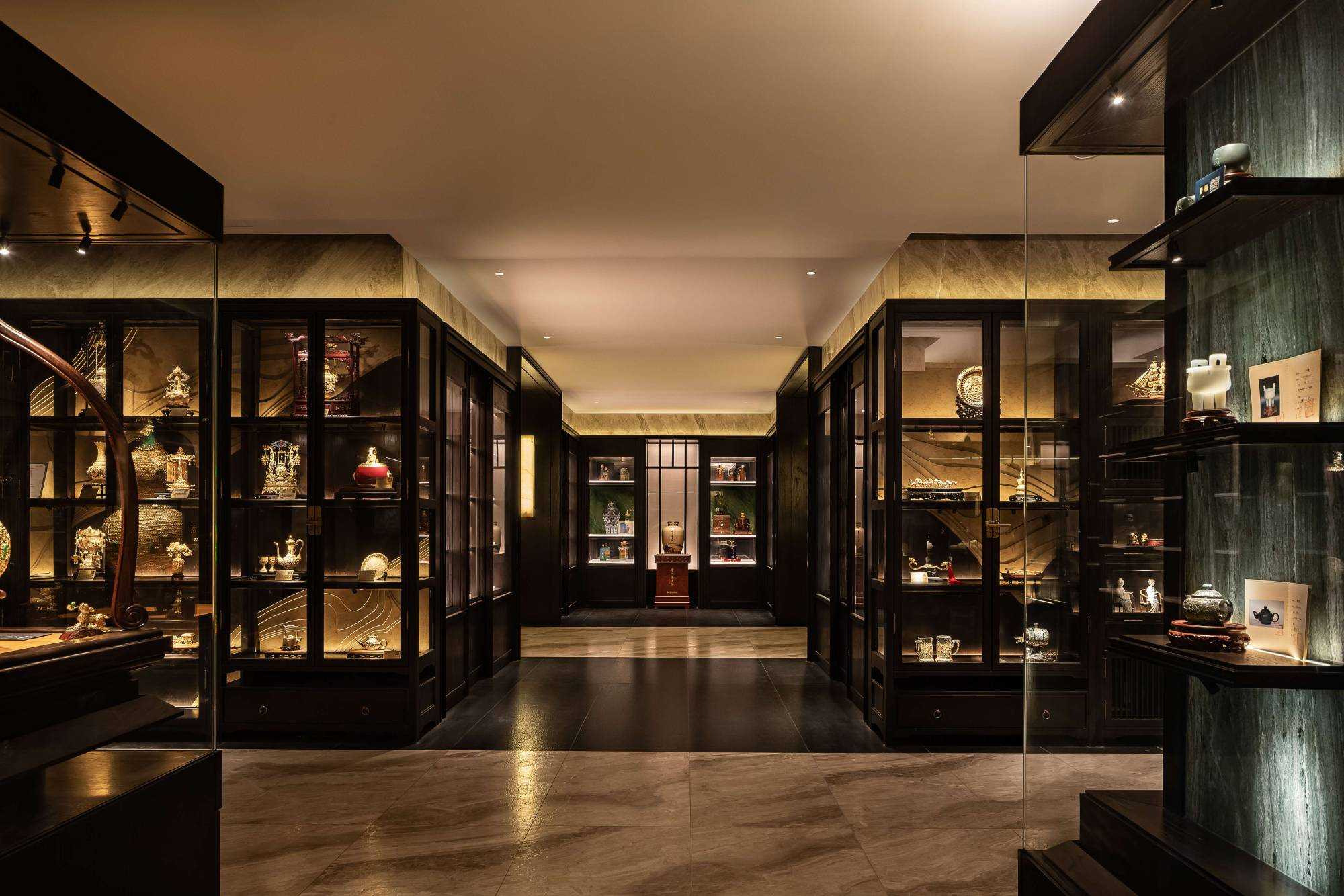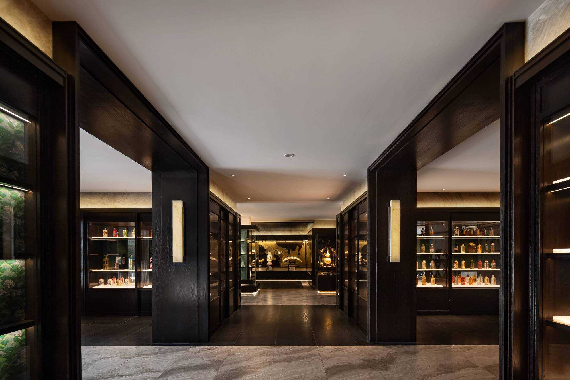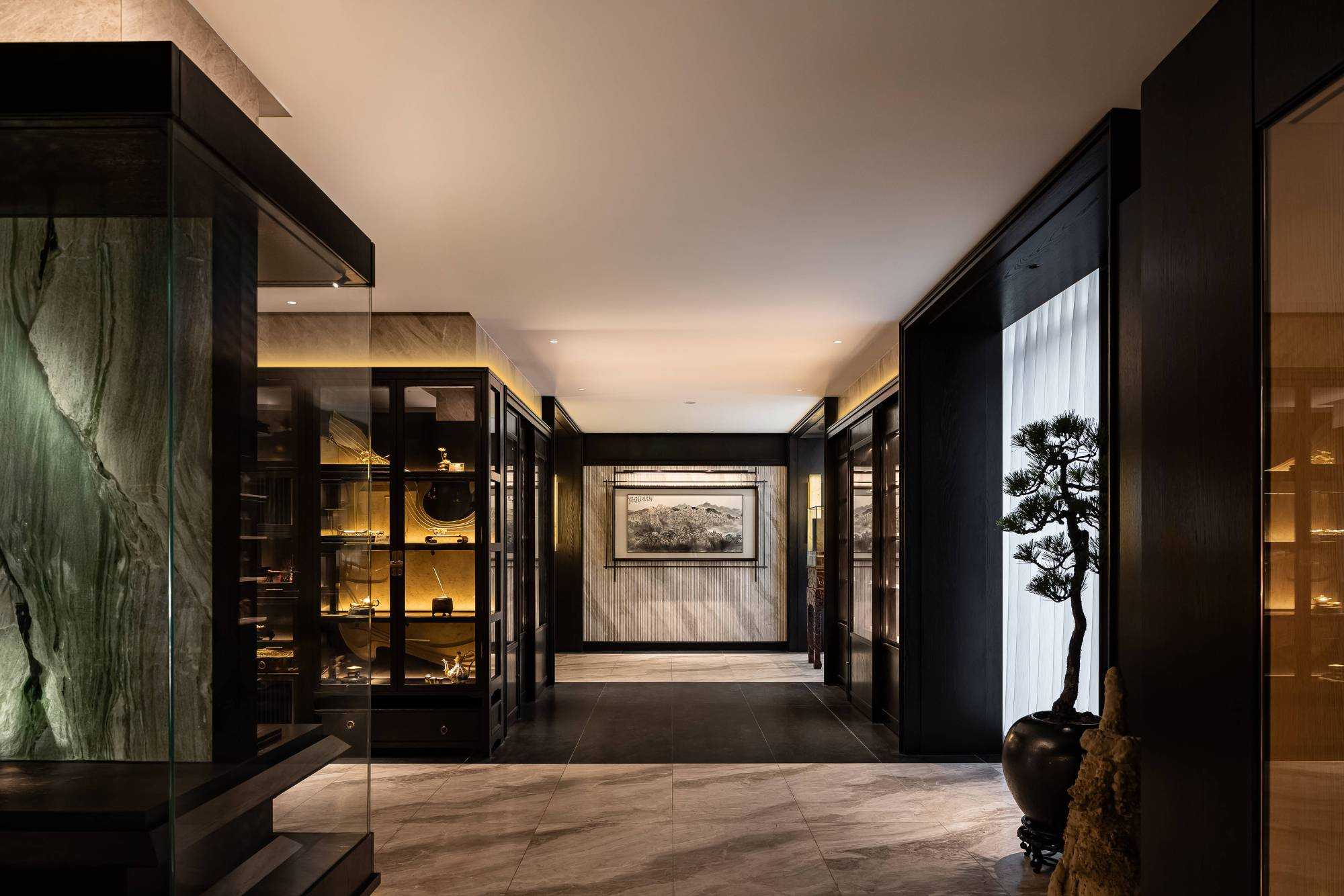 | 东方对称美学是一种在东方文化中广泛应用的审美观念。它强调平衡、秩序和稳定,以中轴线为基准,两侧的元素在形状、大小、位置等方面相互呼应,给人一种和谐、庄重的美感。这种美学观念深深扎根于东方的哲学、宗教和生活方式之中。 介入项目时因甲方热爱藏酒,希望有大面的酒墙可以展示,并且带宾客参观时亦可以大谈中国酒文化,每瓶酒都有自身代表的中国文化。我们在设计酒墙时想到“东方对称美学”这个艺术哲学,主通道的两边均衡的陈列酒墙,这种对称形式有种庄重的秩序感。 每一个酒墙左右两边都是序列的重复,延伸到视觉的中心点在一个特别陈设的酒结束,每个通道的视角感达到了儒家强调 “中正平和”。同样道家的 “阴阳平衡” 理念也与在对称美学中体现,对称的两边可以看作是阴阳的相互映照,相互对立又相互依存,共同构成一个完整的整体。 无论是酒墙、垭口、壁灯、灯光,每个细节的设计元素不停的重复着,视觉语言上不断地加深宾客的记忆,设计语言中在每一处复杂的细节中整体又保持着简洁。 初识珍宝馆主人时,有许多珍藏的艺术品,每一件都是心头好。为了甲方更好的展示这些艺术品,在陈列方面我们想到了博物馆的模式,在博物馆里顺着设计的流线轻松的看完所有展品,且无论灯光的陈列都最大的放大了藏品的美。 于是我们把博物馆的思路用在本案上,为了更大化的凸显艺术品的美,无论是柜体还是顶面、地面均使用黑色木饰面和石材,弱化掉宾客视觉区域,让视觉中心留在柜内,系统的柜内灯管设计,只照艺术品不照柜面,每一处细节都是为了展现艺术品的绚丽。 白居易的《忆江南词三首》“日出江花红胜火,春来江水绿如蓝。”通过对江南春天江水的描写,用 “绿如蓝” 生动地表现出江水的清澈和碧绿。柜内背景使用为本案绘制的水流状木雕,以及绿如蓝流水纹石材,是从诗句中提取的几个设计符号来展现出江南水乡的秀丽风光,以贴合“去饰取素,傥值其心耳”的定位。 在设定空间动线的时候,我们设定了很多转折与过渡。希望用空间的节奏、人的流动、视线的游走,可以达到移步换景。随着人在空间中前行停顿、或上或下的轨迹制造不同的身体感受与体验,以此来回应“空间”、“时间”与“情感”,感知空间的多样性与丰富性。 南朝·宋谢灵运创作的辞赋描写东山山野生活的《山居赋》成为联系古今生活方式的纽带,自序中“去饰取素,傥值其心耳”,意为 “去掉修饰的,不加以雕琢,只有最本质纯粹的,才最接近本心。”正是本项目的定位,也是这座珍宝馆主人的“隐居”之心。 毕竟还是私人场所,除了接待宾客的空间外也要满足办公居住的需求,整体上要具备一定的精神性与松弛感。整体的配色淡雅,墙面的设计符号尽可能的简洁,把复杂的元素用在顶面、地面,视觉的中心永远是安静平淡感,配合的字画也依然是禅意,处处贴合“去饰取素,傥值其心耳”之意。 没有华丽和浮夸的修饰,却在步入这里的时候就能感受到简约和避世的气息。 从进门那一刻起,就能感受到浓厚的艺术氛围。室内的挂画和书法也是甲方的收藏,或者友人赠之,我们为每一幅字画找寻适合它的位置陈列,为宾客带来无与伦比的艺术享受。 | |||