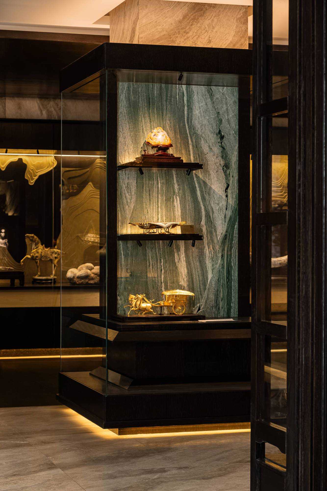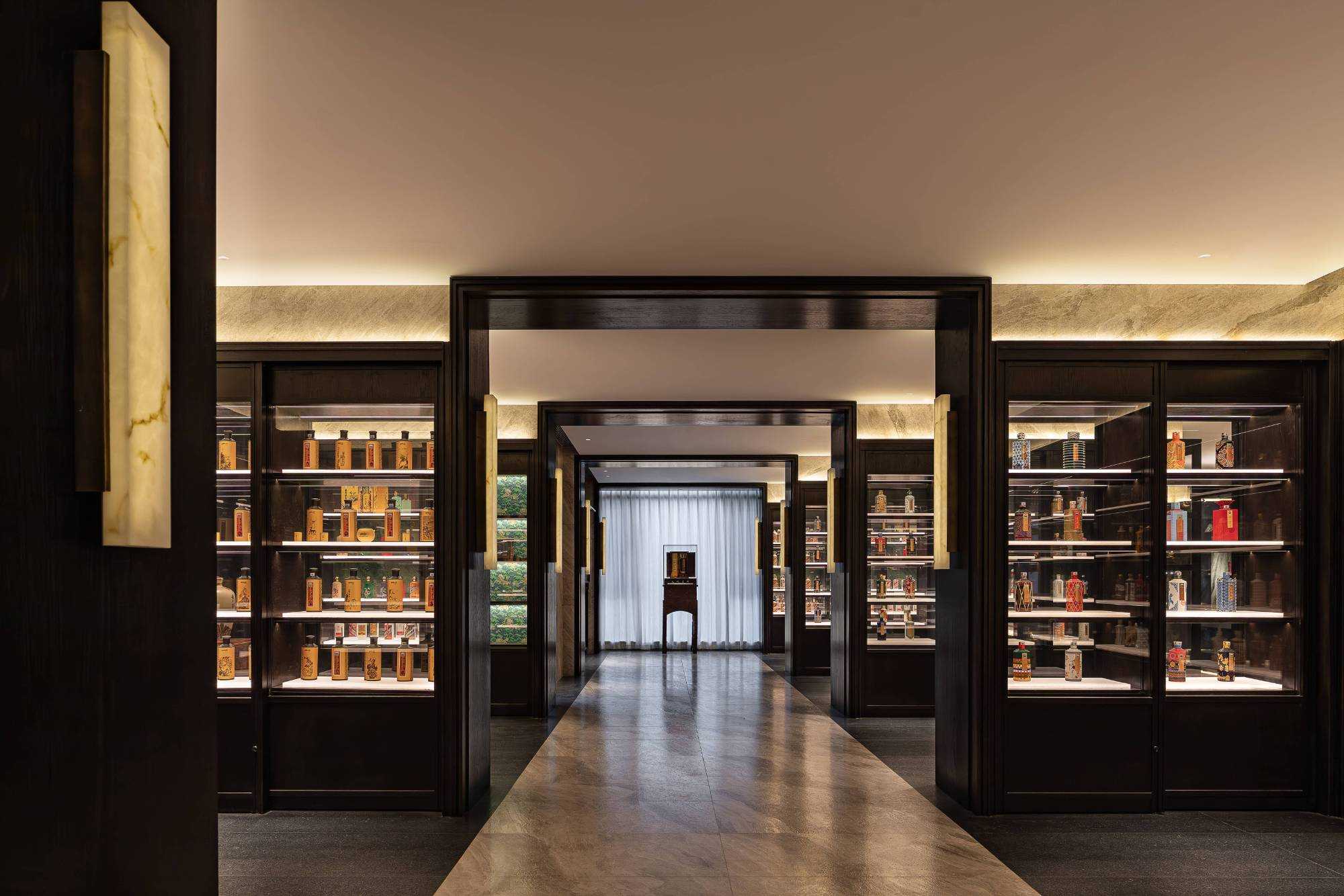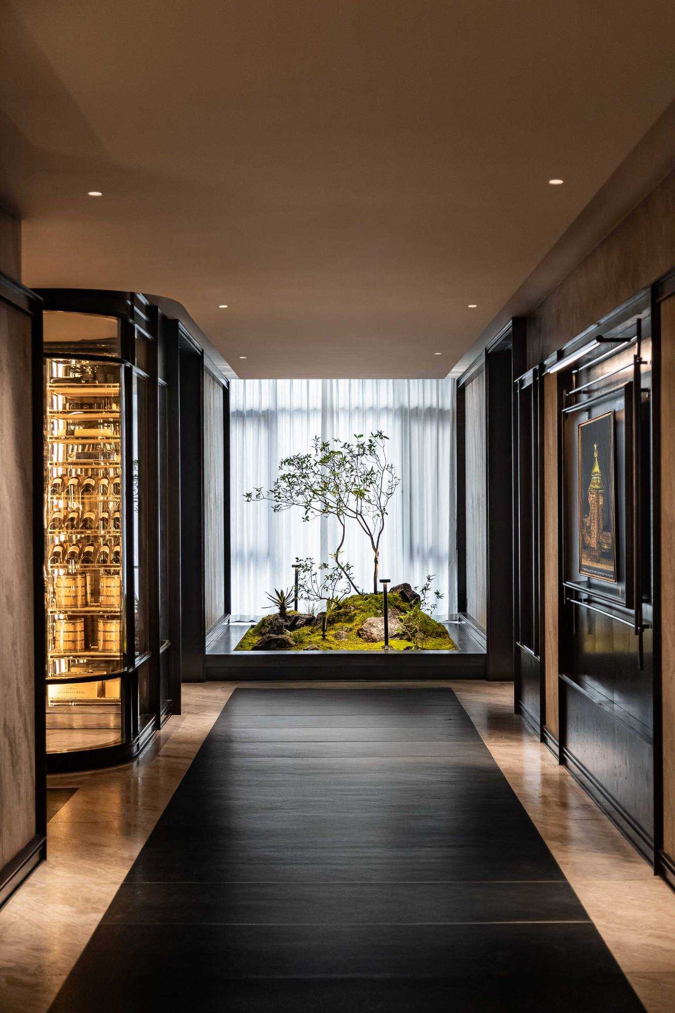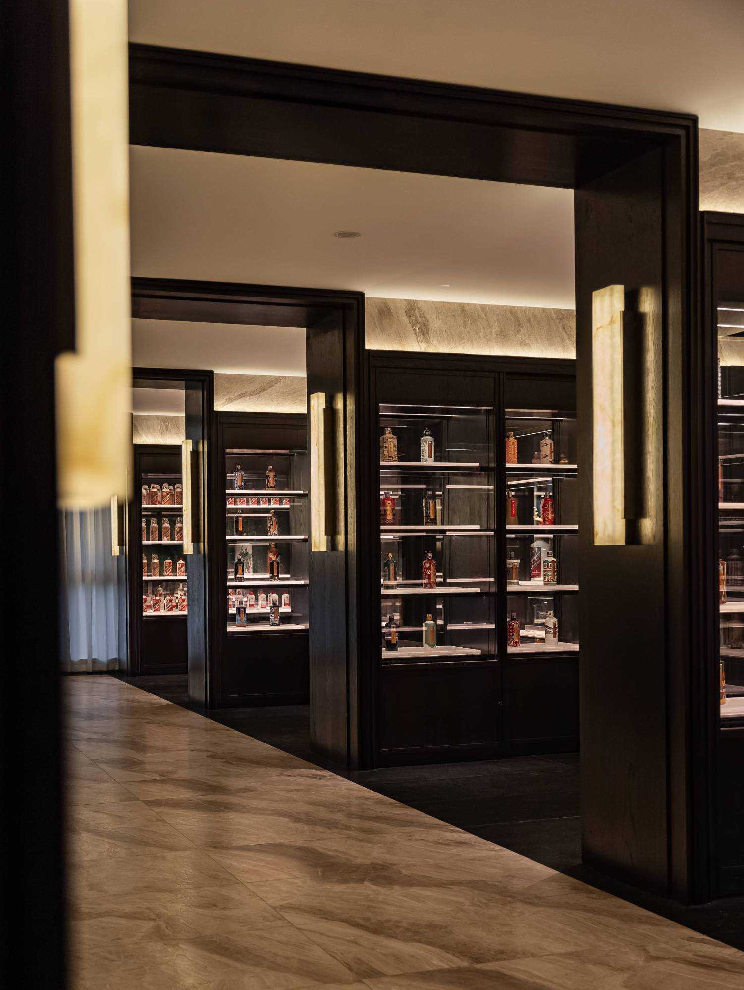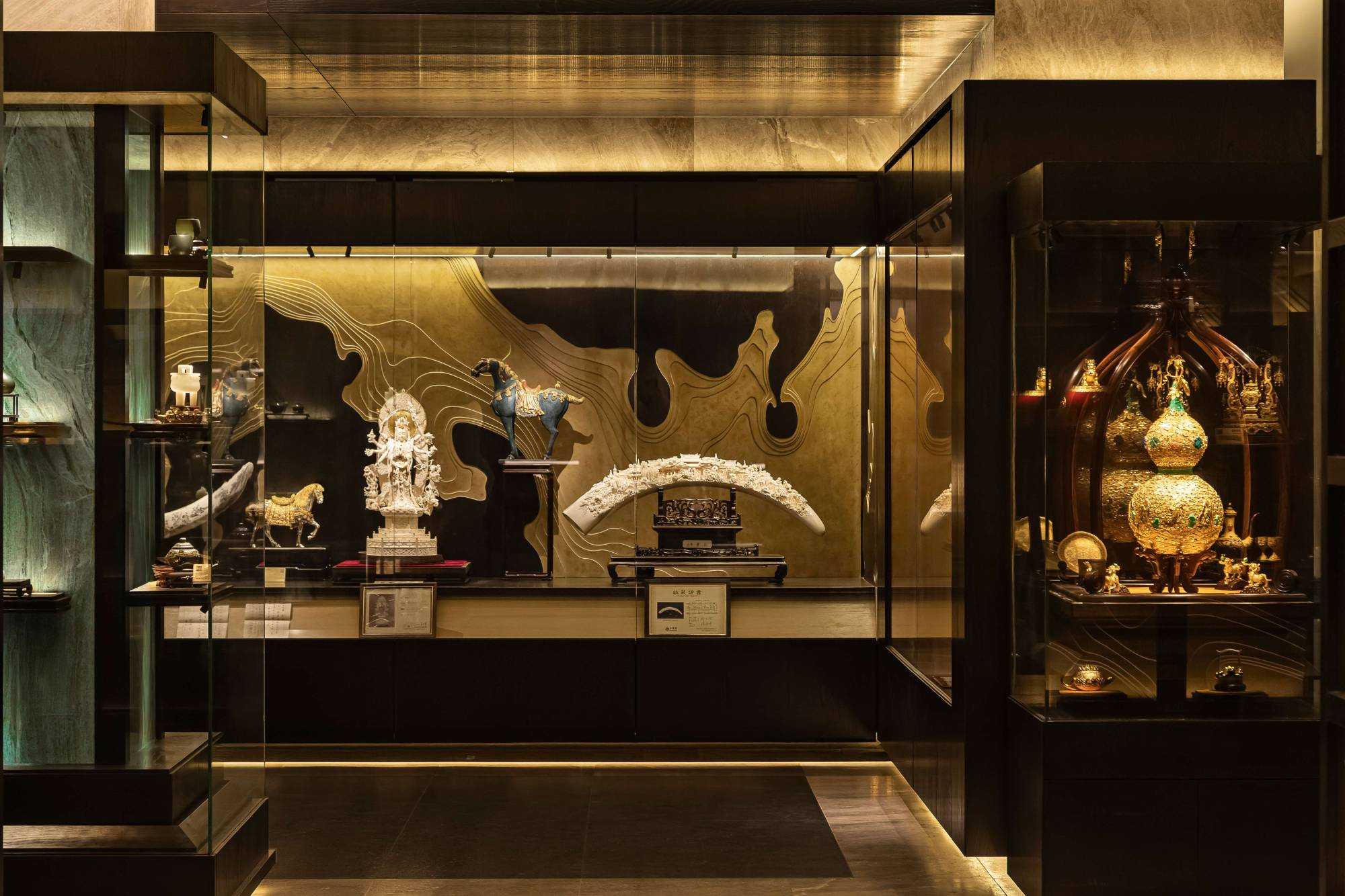 | 东方对称美学是一种在东方文化中广泛应用的审美观念。它强调平衡、秩序和稳定,以中轴线为基准,两侧的元素在形状、大小、位置等方面相互呼应,给人一种和谐、庄重的美感。这种美学观念深深扎根于东方的哲学、宗教和生活方式之中。 介入项目时因甲方热爱藏酒,希望有大面的酒墙可以展示,并且带宾客参观时亦可以大谈中国酒文化,每瓶酒都有自身代表的中国文化。我们在设计酒墙时想到“东方对称美学”这个艺术哲学,主通道的两边均衡的陈列酒墙,这种对称形式有种庄重的秩序感。 每一个酒墙左右两边都是序列的重复,延伸到视觉的中心点在一个特别陈设的酒结束,每个通道的视角感达到了儒家强调 “中正平和”。同样道家的 “阴阳平衡” 理念也与在对称美学中体现,对称的两边可以看作是阴阳的相互映照,相互对立又相互依存,共同构成一个完整的整体。 无论是酒墙、垭口、壁灯、灯光,每个细节的设计元素不停的重复着,视觉语言上不断地加深宾客的记忆,设计语言中在每一处复杂的细节中整体又保持着简洁。 初识珍宝馆主人时,有许多珍藏的艺术品,每一件都是心头好。为了甲方更好的展示这些艺术品,在陈列方面我们想到了博物馆的模式,在博物馆里顺着设计的流线轻松的看完所有展品,且无论灯光的陈列都最大的放大了藏品的美。 于是我们把博物馆的思路用在本案上,为了更大化的凸显艺术品的美,无论是柜体还是顶面、地面均使用黑色木饰面和石材,弱化掉宾客视觉区域,让视觉中心留在柜内,系统的柜内灯管设计,只照艺术品不照柜面,每一处细节都是为了展现艺术品的绚丽。 白居易的《忆江南词三首》“日出江花红胜火,春来江水绿如蓝。”通过对江南春天江水的描写,用 “绿如蓝” 生动地表现出江水的清澈和碧绿。柜内背景使用为本案绘制的水流状木雕,以及绿如蓝流水纹石材,是从诗句中提取的几个设计符号来展现出江南水乡的秀丽风光,以贴合“去饰取素,傥值其心耳”的定位。 在设定空间动线的时候,我们设定了很多转折与过渡。希望用空间的节奏、人的流动、视线的游走,可以达到移步换景。随着人在空间中前行停顿、或上或下的轨迹制造不同的身体感受与体验,以此来回应“空间”、“时间”与“情感”,感知空间的多样性与丰富性。 南朝·宋谢灵运创作的辞赋描写东山山野生活的《山居赋》成为联系古今生活方式的纽带,自序中“去饰取素,傥值其心耳”,意为 “去掉修饰的,不加以雕琢,只有最本质纯粹的,才最接近本心。”正是本项目的定位,也是这座珍宝馆主人的“隐居”之心。 毕竟还是私人场所,除了接待宾客的空间外也要满足办公居住的需求,整体上要具备一定的精神性与松弛感。整体的配色淡雅,墙面的设计符号尽可能的简洁,把复杂的元素用在顶面、地面,视觉的中心永远是安静平淡感,配合的字画也依然是禅意,处处贴合“去饰取素,傥值其心耳”之意。 没有华丽和浮夸的修饰,却在步入这里的时候就能感受到简约和避世的气息。 从进门那一刻起,就能感受到浓厚的艺术氛围。室内的挂画和书法也是甲方的收藏,或者友人赠之,我们为每一幅字画找寻适合它的位置陈列,为宾客带来无与伦比的艺术享受。 | |||