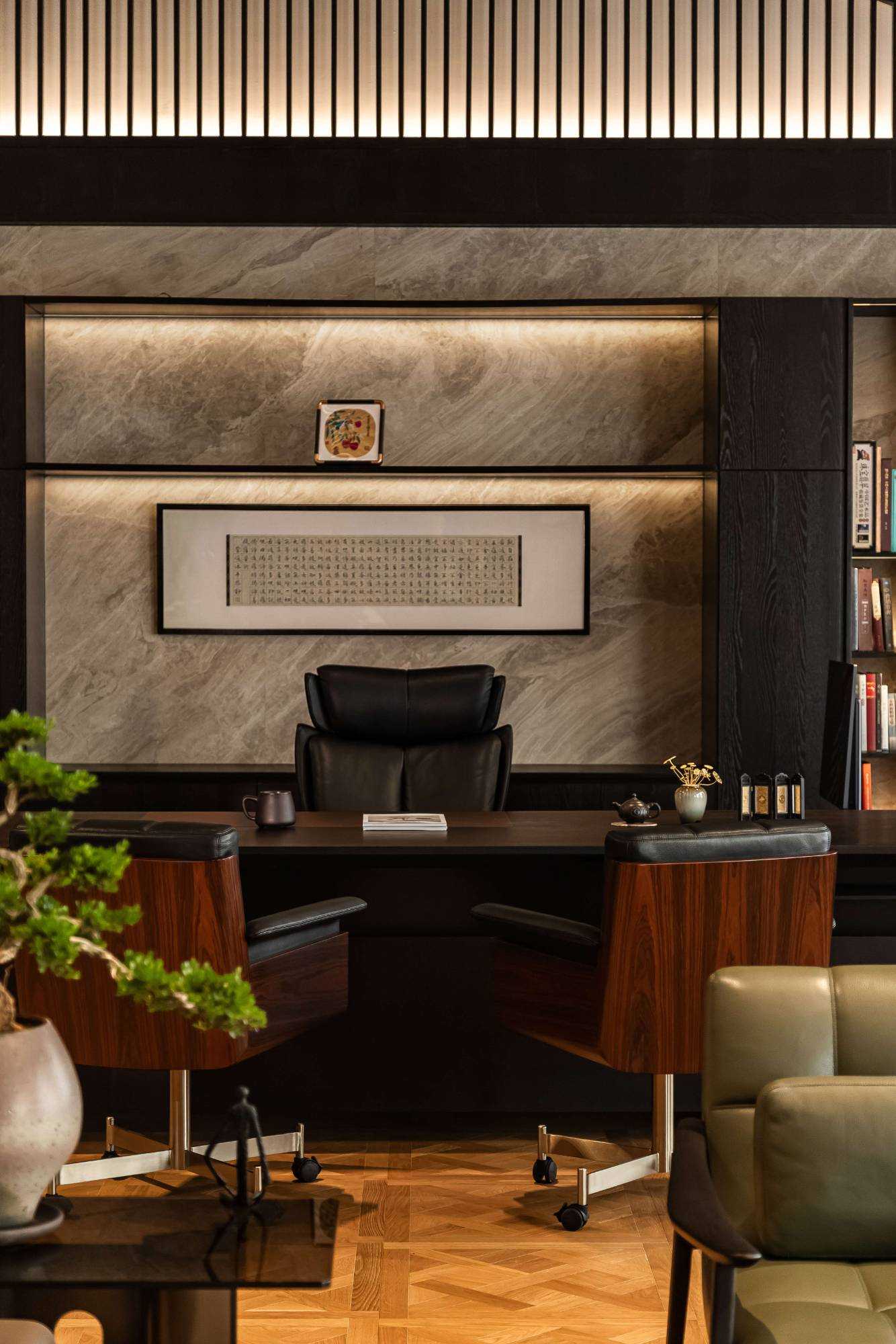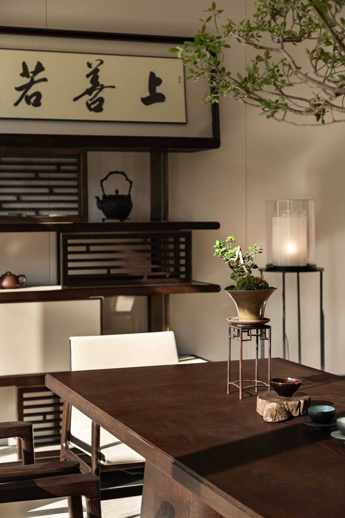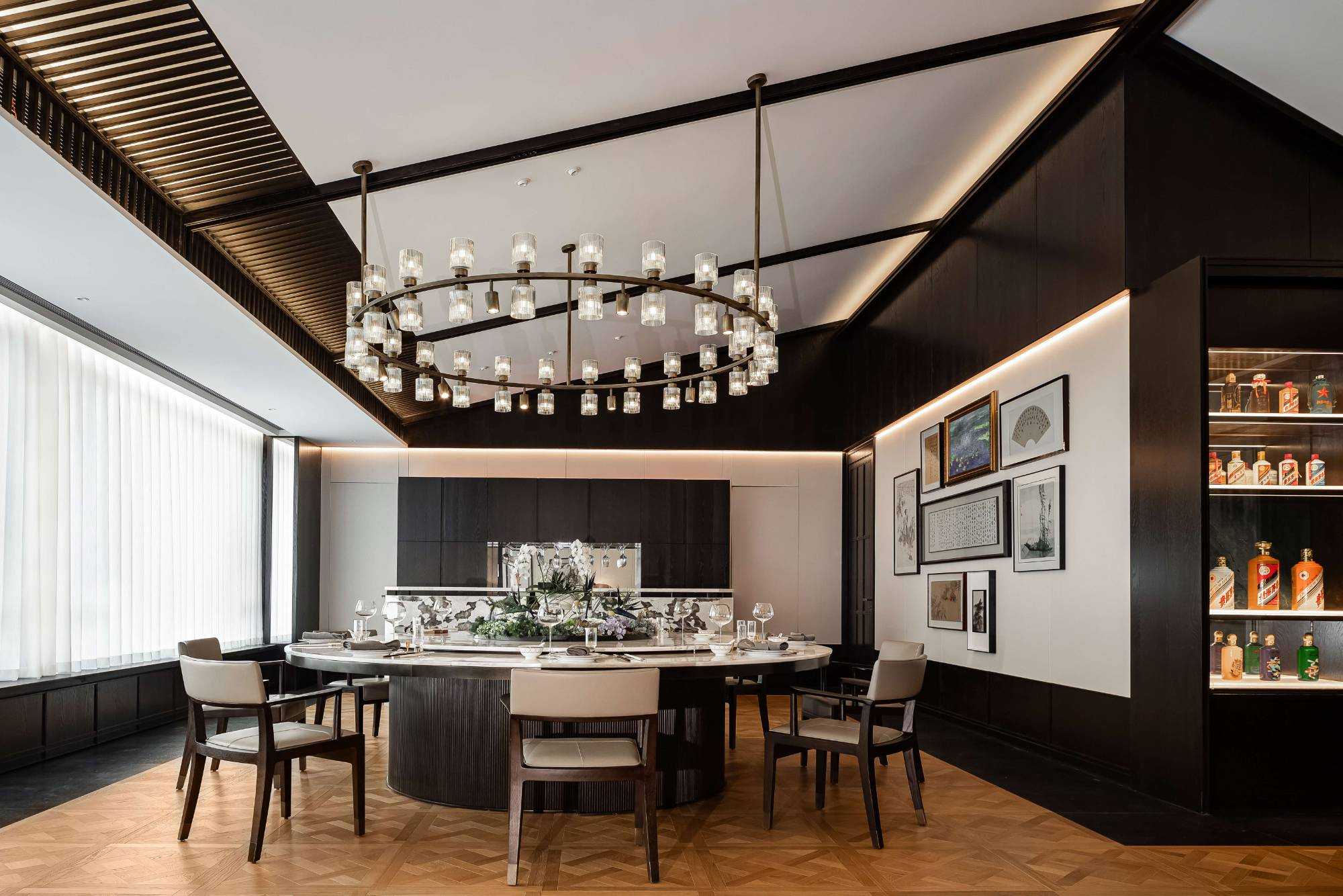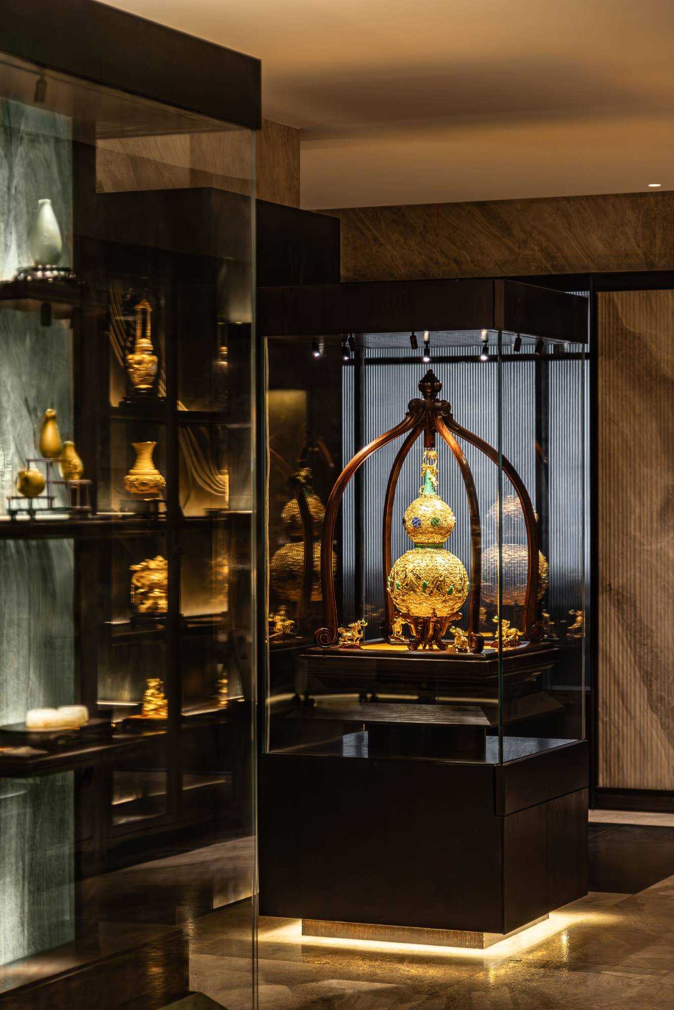 | 东方对称美学是一种在东方文化中广泛应用的审美观念。它强调平衡、秩序和稳定,以中轴线为基准,两侧的元素在形状、大小、位置等方面相互呼应,给人一种和谐、庄重的美感。这种美学观念深深扎根于东方的哲学、宗教和生活方式之中。 介入项目时因甲方热爱藏酒,希望有大面的酒墙可以展示,并且带宾客参观时亦可以大谈中国酒文化,每瓶酒都有自身代表的中国文化。我们在设计酒墙时想到“东方对称美学”这个艺术哲学,主通道的两边均衡的陈列酒墙,这种对称形式有种庄重的秩序感。 每一个酒墙左右两边都是序列的重复,延伸到视觉的中心点在一个特别陈设的酒结束,每个通道的视角感达到了儒家强调 “中正平和”。同样道家的 “阴阳平衡” 理念也与在对称美学中体现,对称的两边可以看作是阴阳的相互映照,相互对立又相互依存,共同构成一个完整的整体。 无论是酒墙、垭口、壁灯、灯光,每个细节的设计元素不停的重复着,视觉语言上不断地加深宾客的记忆,设计语言中在每一处复杂的细节中整体又保持着简洁。 初识珍宝馆主人时,有许多珍藏的艺术品,每一件都是心头好。为了甲方更好的展示这些艺术品,在陈列方面我们想到了博物馆的模式,在博物馆里顺着设计的流线轻松的看完所有展品,且无论灯光的陈列都最大的放大了藏品的美。 于是我们把博物馆的思路用在本案上,为了更大化的凸显艺术品的美,无论是柜体还是顶面、地面均使用黑色木饰面和石材,弱化掉宾客视觉区域,让视觉中心留在柜内,系统的柜内灯管设计,只照艺术品不照柜面,每一处细节都是为了展现艺术品的绚丽。 白居易的《忆江南词三首》“日出江花红胜火,春来江水绿如蓝。”通过对江南春天江水的描写,用 “绿如蓝” 生动地表现出江水的清澈和碧绿。柜内背景使用为本案绘制的水流状木雕,以及绿如蓝流水纹石材,是从诗句中提取的几个设计符号来展现出江南水乡的秀丽风光,以贴合“去饰取素,傥值其心耳”的定位。 在设定空间动线的时候,我们设定了很多转折与过渡。希望用空间的节奏、人的流动、视线的游走,可以达到移步换景。随着人在空间中前行停顿、或上或下的轨迹制造不同的身体感受与体验,以此来回应“空间”、“时间”与“情感”,感知空间的多样性与丰富性。 南朝·宋谢灵运创作的辞赋描写东山山野生活的《山居赋》成为联系古今生活方式的纽带,自序中“去饰取素,傥值其心耳”,意为 “去掉修饰的,不加以雕琢,只有最本质纯粹的,才最接近本心。”正是本项目的定位,也是这座珍宝馆主人的“隐居”之心。 毕竟还是私人场所,除了接待宾客的空间外也要满足办公居住的需求,整体上要具备一定的精神性与松弛感。整体的配色淡雅,墙面的设计符号尽可能的简洁,把复杂的元素用在顶面、地面,视觉的中心永远是安静平淡感,配合的字画也依然是禅意,处处贴合“去饰取素,傥值其心耳”之意。 没有华丽和浮夸的修饰,却在步入这里的时候就能感受到简约和避世的气息。 从进门那一刻起,就能感受到浓厚的艺术氛围。室内的挂画和书法也是甲方的收藏,或者友人赠之,我们为每一幅字画找寻适合它的位置陈列,为宾客带来无与伦比的艺术享受。 | |||