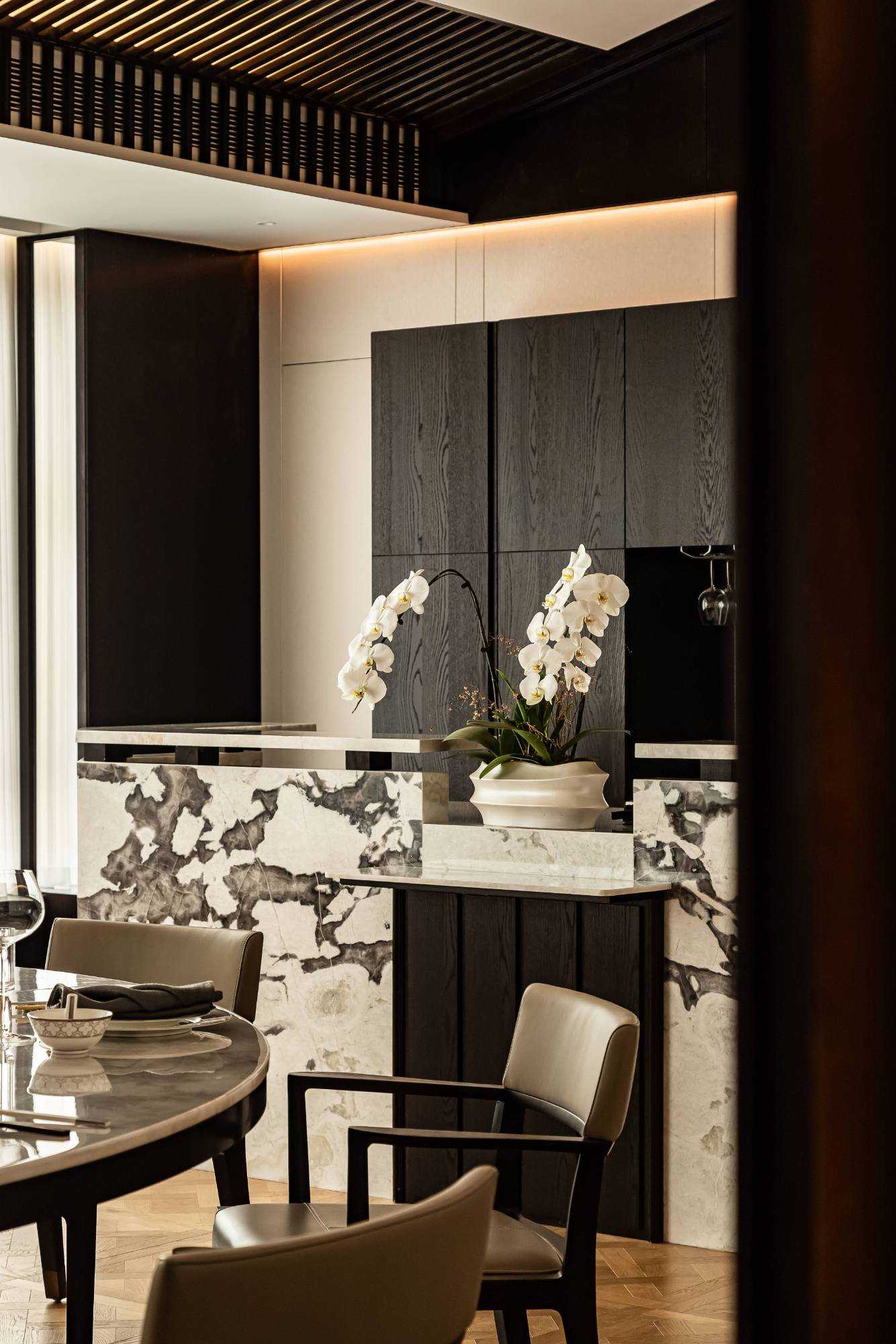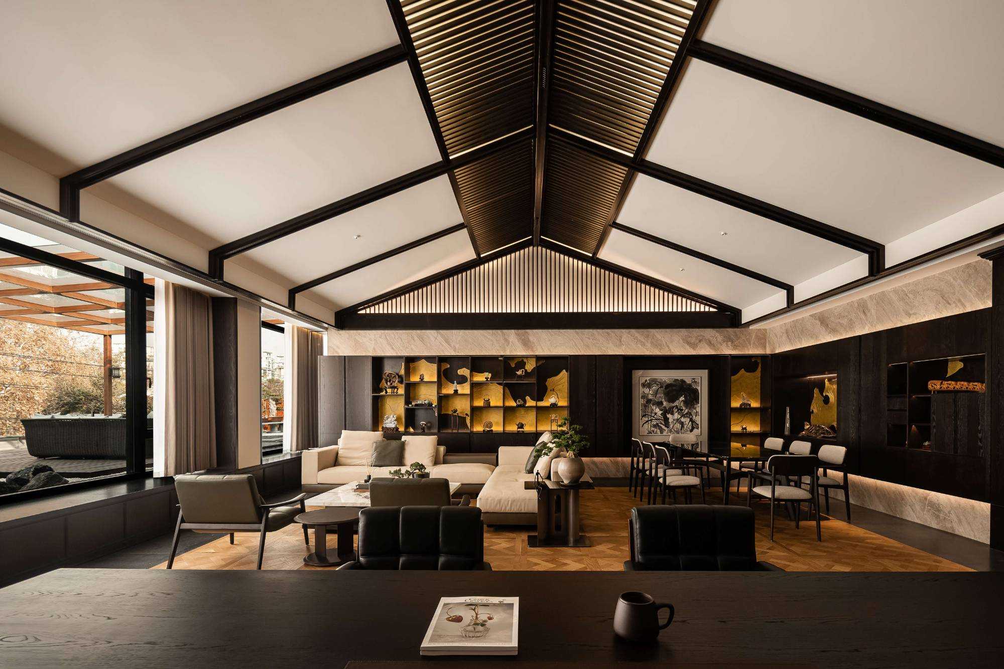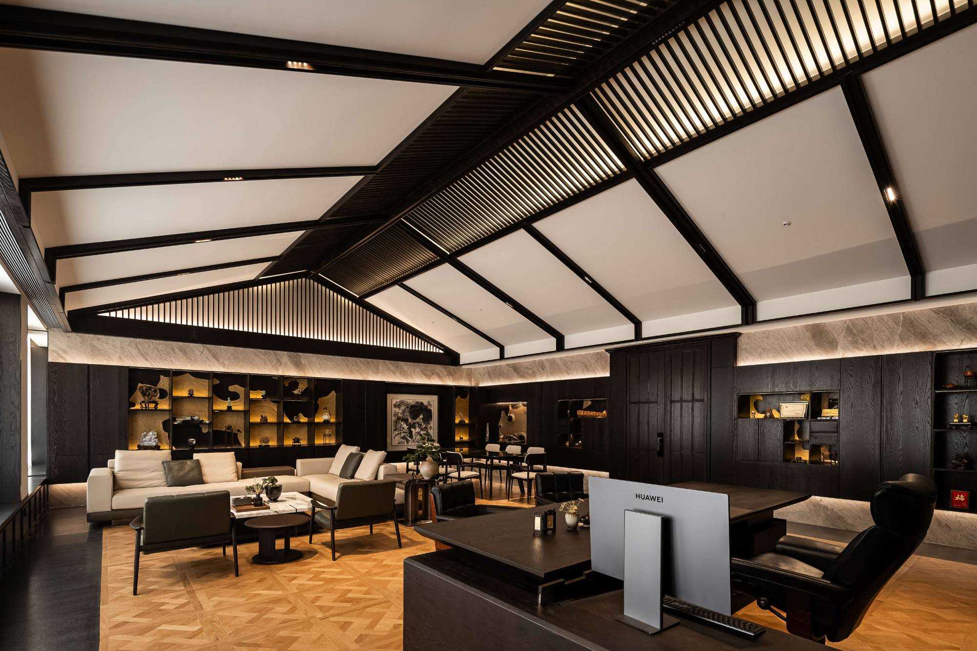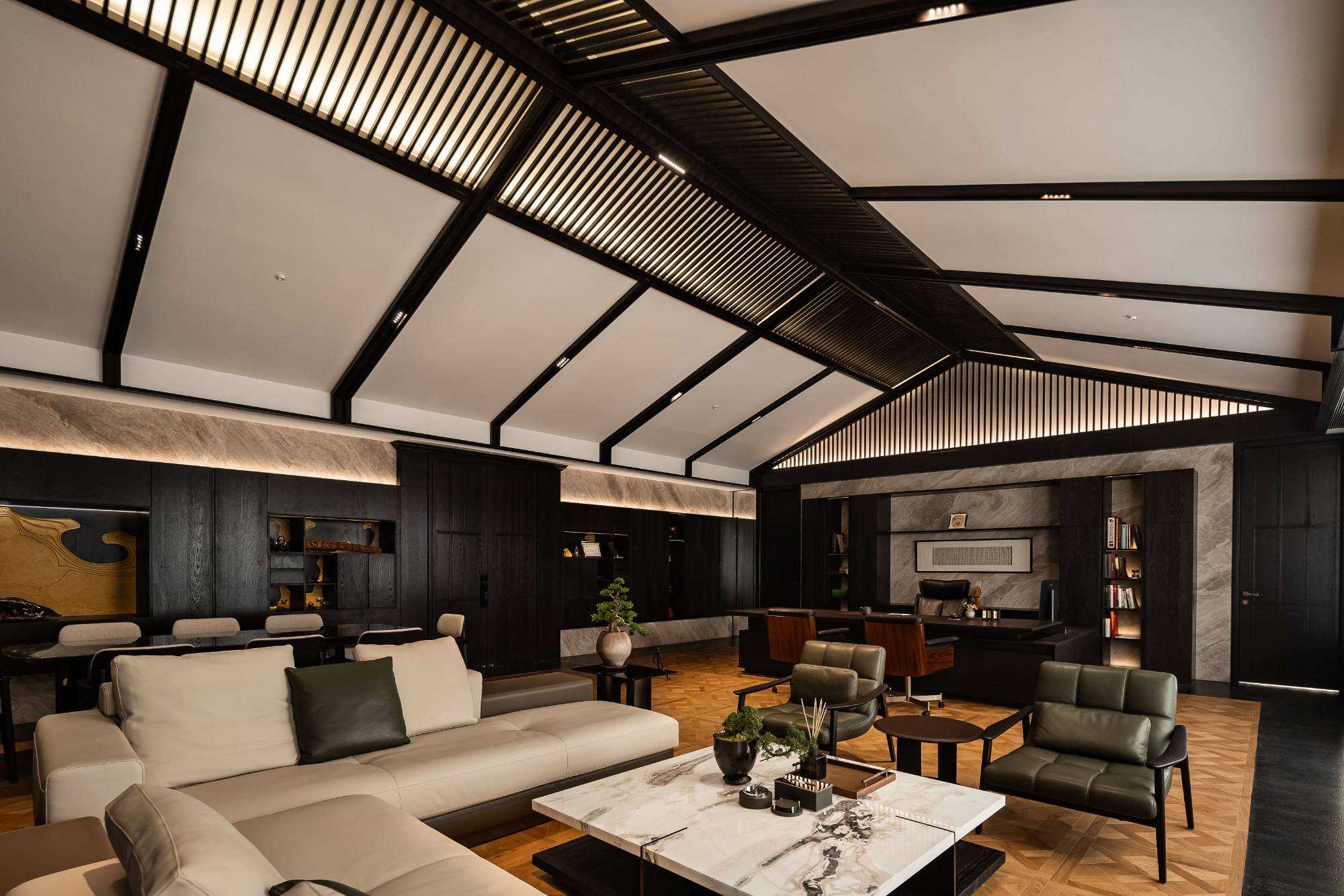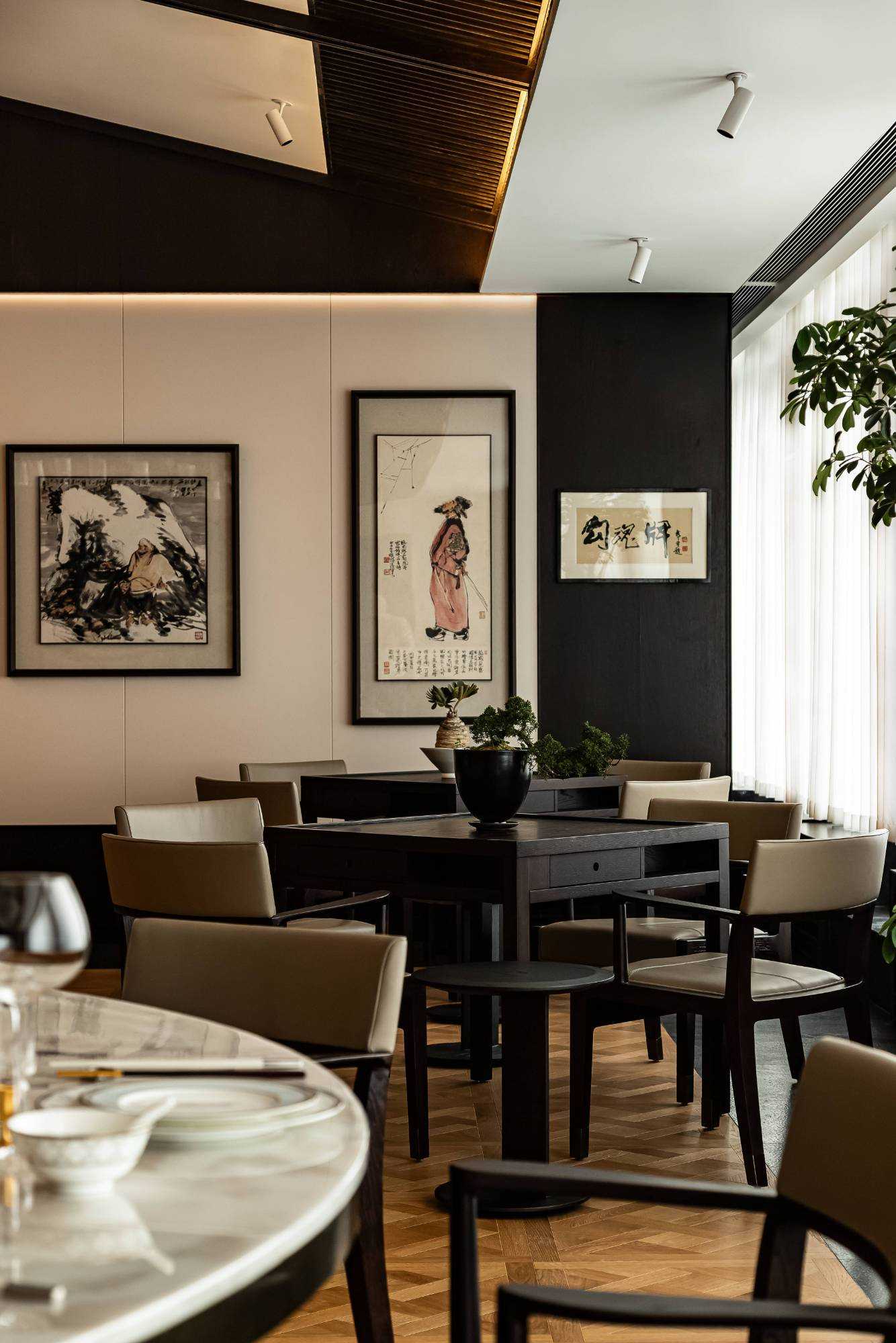 | 东方对称美学是一种在东方文化中广泛应用的审美观念。它强调平衡、秩序和稳定,以中轴线为基准,两侧的元素在形状、大小、位置等方面相互呼应,给人一种和谐、庄重的美感。这种美学观念深深扎根于东方的哲学、宗教和生活方式之中。 介入项目时因甲方热爱藏酒,希望有大面的酒墙可以展示,并且带宾客参观时亦可以大谈中国酒文化,每瓶酒都有自身代表的中国文化。我们在设计酒墙时想到“东方对称美学”这个艺术哲学,主通道的两边均衡的陈列酒墙,这种对称形式有种庄重的秩序感。 每一个酒墙左右两边都是序列的重复,延伸到视觉的中心点在一个特别陈设的酒结束,每个通道的视角感达到了儒家强调 “中正平和”。同样道家的 “阴阳平衡” 理念也与在对称美学中体现,对称的两边可以看作是阴阳的相互映照,相互对立又相互依存,共同构成一个完整的整体。 无论是酒墙、垭口、壁灯、灯光,每个细节的设计元素不停的重复着,视觉语言上不断地加深宾客的记忆,设计语言中在每一处复杂的细节中整体又保持着简洁。 初识珍宝馆主人时,有许多珍藏的艺术品,每一件都是心头好。为了甲方更好的展示这些艺术品,在陈列方面我们想到了博物馆的模式,在博物馆里顺着设计的流线轻松的看完所有展品,且无论灯光的陈列都最大的放大了藏品的美。 于是我们把博物馆的思路用在本案上,为了更大化的凸显艺术品的美,无论是柜体还是顶面、地面均使用黑色木饰面和石材,弱化掉宾客视觉区域,让视觉中心留在柜内,系统的柜内灯管设计,只照艺术品不照柜面,每一处细节都是为了展现艺术品的绚丽。 白居易的《忆江南词三首》“日出江花红胜火,春来江水绿如蓝。”通过对江南春天江水的描写,用 “绿如蓝” 生动地表现出江水的清澈和碧绿。柜内背景使用为本案绘制的水流状木雕,以及绿如蓝流水纹石材,是从诗句中提取的几个设计符号来展现出江南水乡的秀丽风光,以贴合“去饰取素,傥值其心耳”的定位。 在设定空间动线的时候,我们设定了很多转折与过渡。希望用空间的节奏、人的流动、视线的游走,可以达到移步换景。随着人在空间中前行停顿、或上或下的轨迹制造不同的身体感受与体验,以此来回应“空间”、“时间”与“情感”,感知空间的多样性与丰富性。 南朝·宋谢灵运创作的辞赋描写东山山野生活的《山居赋》成为联系古今生活方式的纽带,自序中“去饰取素,傥值其心耳”,意为 “去掉修饰的,不加以雕琢,只有最本质纯粹的,才最接近本心。”正是本项目的定位,也是这座珍宝馆主人的“隐居”之心。 毕竟还是私人场所,除了接待宾客的空间外也要满足办公居住的需求,整体上要具备一定的精神性与松弛感。整体的配色淡雅,墙面的设计符号尽可能的简洁,把复杂的元素用在顶面、地面,视觉的中心永远是安静平淡感,配合的字画也依然是禅意,处处贴合“去饰取素,傥值其心耳”之意。 没有华丽和浮夸的修饰,却在步入这里的时候就能感受到简约和避世的气息。 从进门那一刻起,就能感受到浓厚的艺术氛围。室内的挂画和书法也是甲方的收藏,或者友人赠之,我们为每一幅字画找寻适合它的位置陈列,为宾客带来无与伦比的艺术享受。 | |||