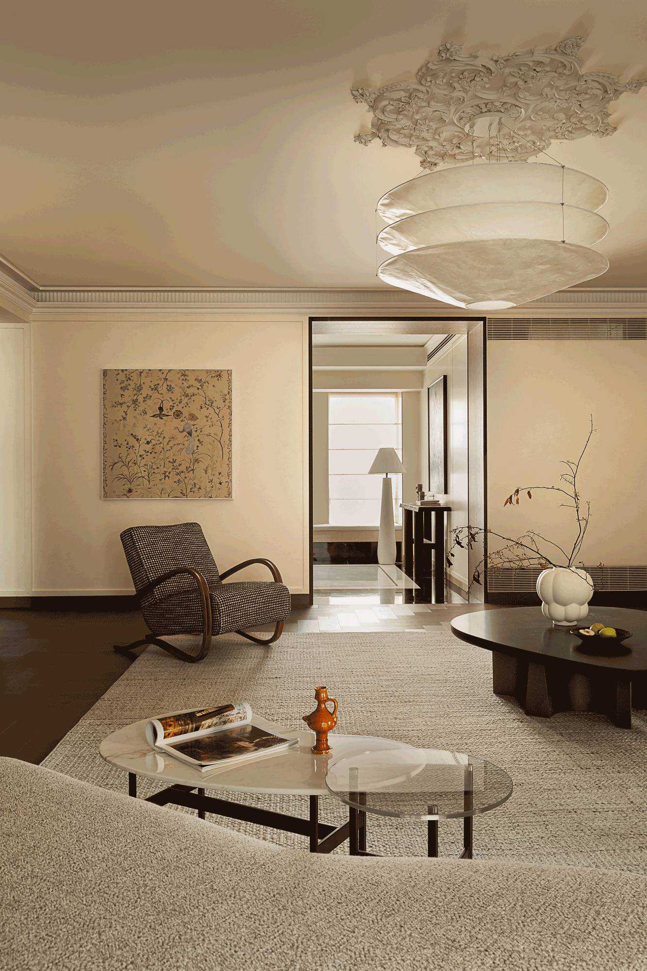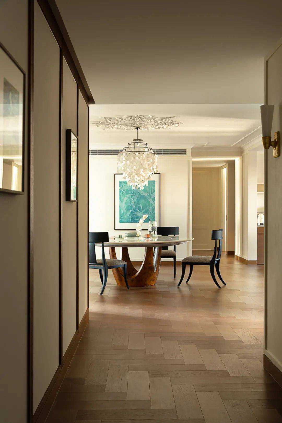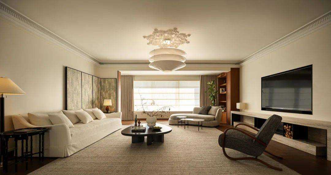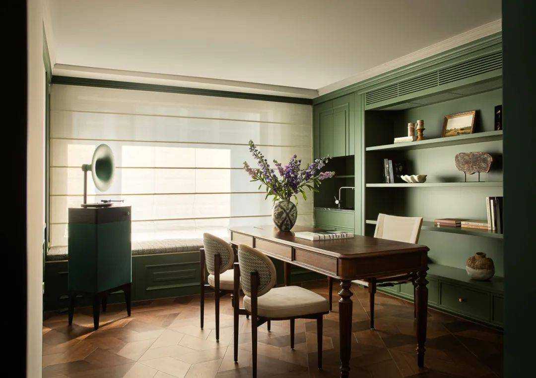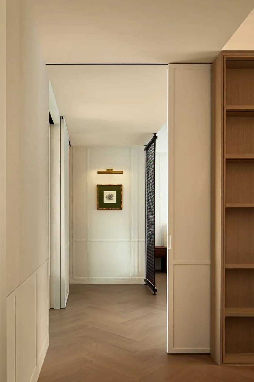 | 焕新的时代语境 在快节奏的现代都市语境下,我们将探究的目光落于现实主义生活本身,又纳入回归式的情境思考方向,希望家宅空间在经久的使用中,保持着常住常新的魅力,也为业主喜欢的法式风格,减去厚重冗余的线条,置入现代式审美意趣。 客厅空间作为场景予人的最直观印象,定调现代复古主义设计基调,以简约平直的现代感线条与纯白的墙面漆色彩展露明晰清爽的空间底色,而繁复的复古元素设计被隐匿于视线的边角,从灯光后方透出的结构式线条,如交错的藤蔓随光影悄然生长,座椅后方的复古风格装饰画应和着茶几上的绿植,如花在野。设计在当下审美方向的前提下,提供具有人文气息与经得起时间沉淀的视觉体验。 两向入口,结构重生 设计东西两向入口,东向作为主入口通过过道链接客餐厅空间,形成两大功能分区,成为贯通场景间的必经之路,为动线脉络提供最优的解决方案。 而此处作为空间初印象,设置集中的法式复古元素强调空间的整体风格特点。 璀璨的灯饰如引领的灯火,在过道的尽头揭示此行的目的地,迎合国人习惯的圆桌作为中厨空间的主角,将视线归集。 西厨吧台与烹饪空间藏身于移门后方,形成家人日常更为频繁使用的便捷就餐场景,在亲友来访时,敞开式结构亦能满足更复杂的场景需求,承载部分会客功能,衍生出场景间的串联与辅助关系。 文艺复兴的空间诗学 以深邃的墨绿铺陈基底,石膏线条勾勒优雅的立体轮廓,书房空间以更为浓厚的文艺复兴色彩呈现优雅且深厚的空间诗学。 功能与审美的有机结合 寝居空间的色彩选择更为克制,纯白搭配零星的木元素,仅以墙面出现的石膏线回应空间的主题,确保空间叙事的整体性与流畅性。在功能性的考量中,在卧室空间置入多重功能关系,通过沙发与电视的组合,延展空间的使用状态,打造更温情的生活场景。 同时,将电竞房设置于主卧套间内,电视背景墙后方,形成与主卧空间互不打扰又贯通联结的状态,在不同的时间满足夫妻双方交流与独处的双重需求。 设计希望空间不仅仅是作为居住场景那样简单的存在,而是在经年的使用中,不断吸纳居住者的习惯与情绪,成为一个具有反哺作用的载体,在需要的时候,为生活提供情感的支撑。 而此刻,华灯初上,影影瞳瞳的光将枝叶的纹理打散,生活就是这样,日复一日,看似寻常,而其走过的痕迹早已浸润在家的边角缝隙,拾起来又是一番纸短情长。 | |||