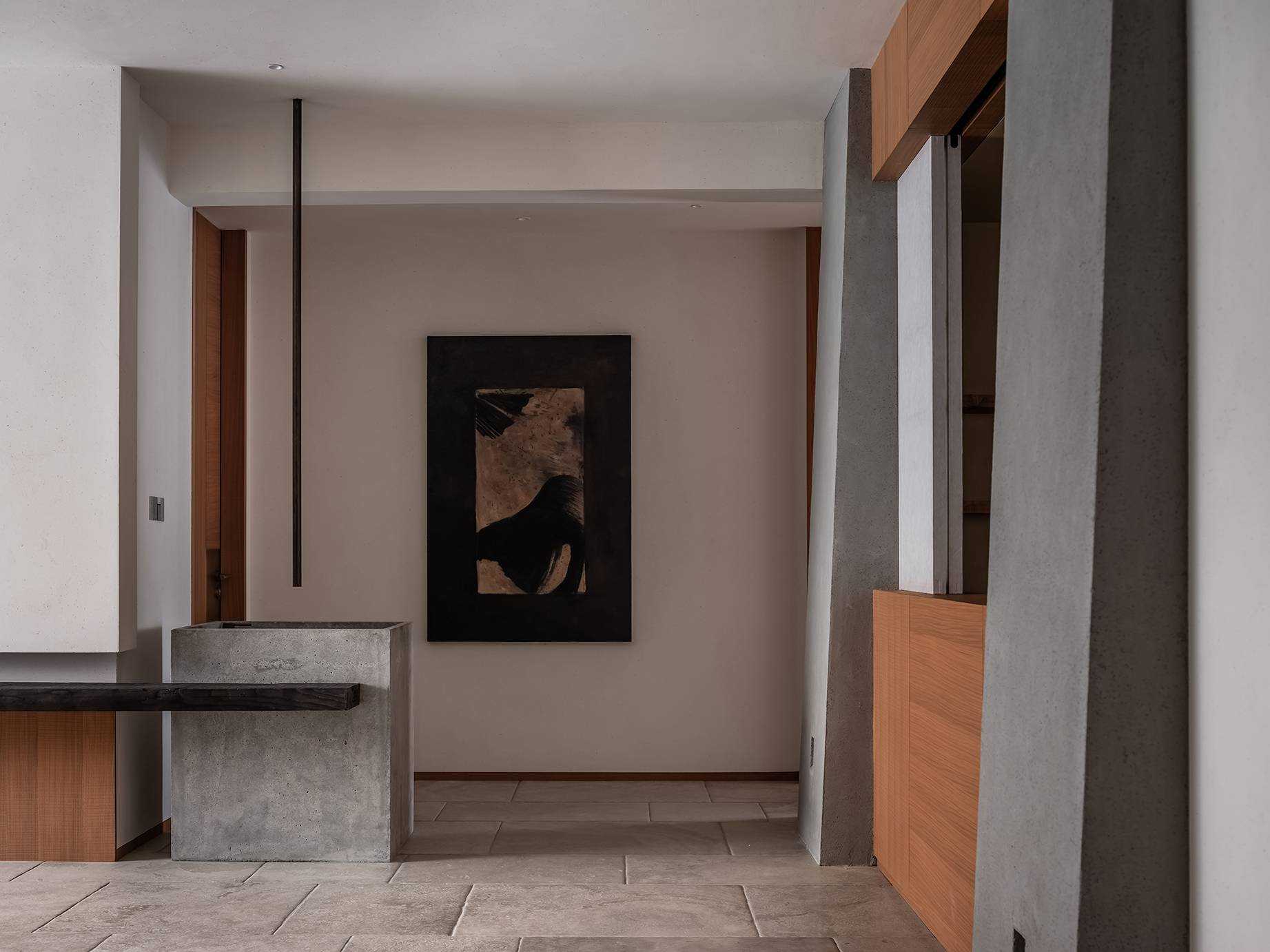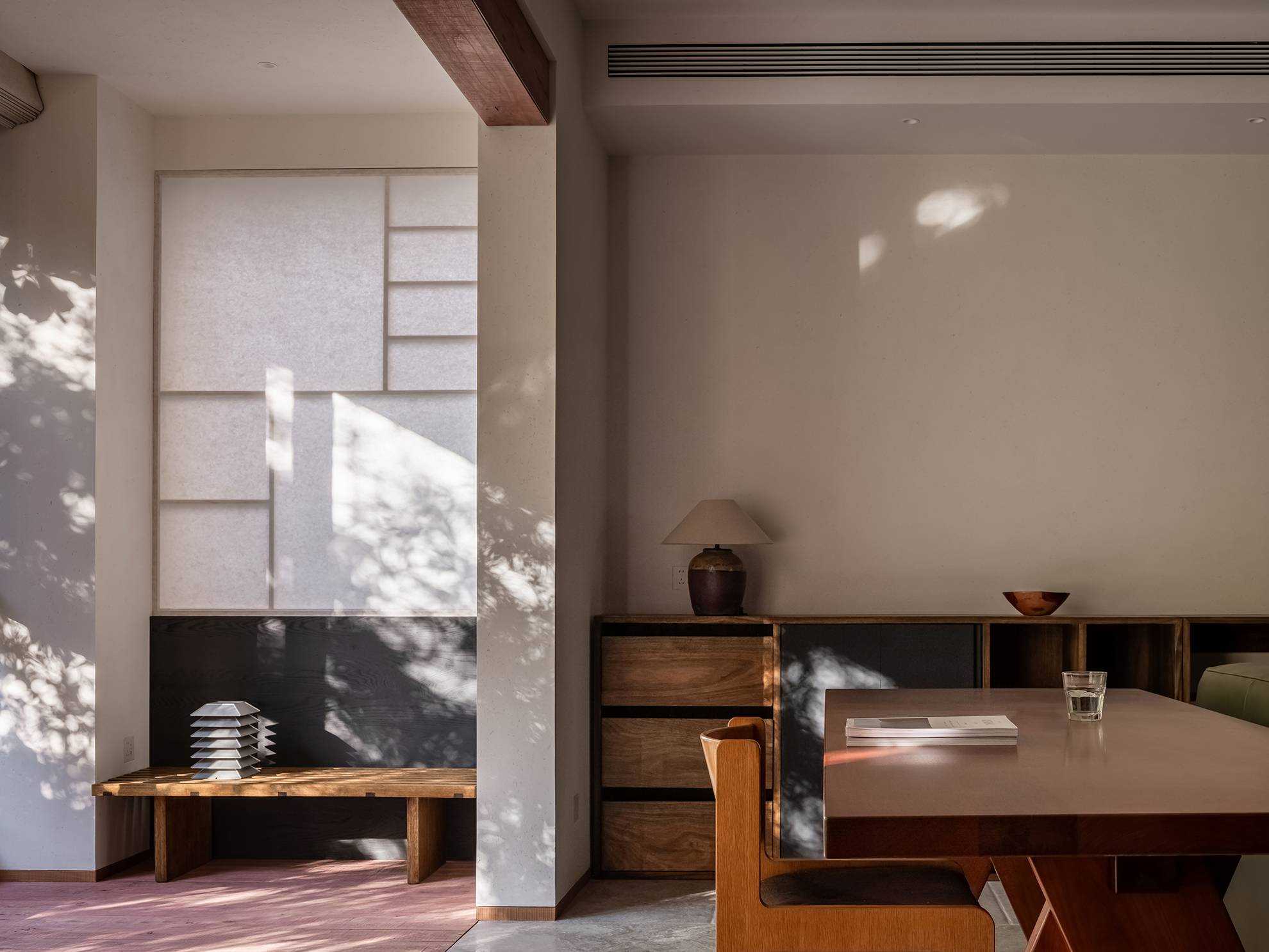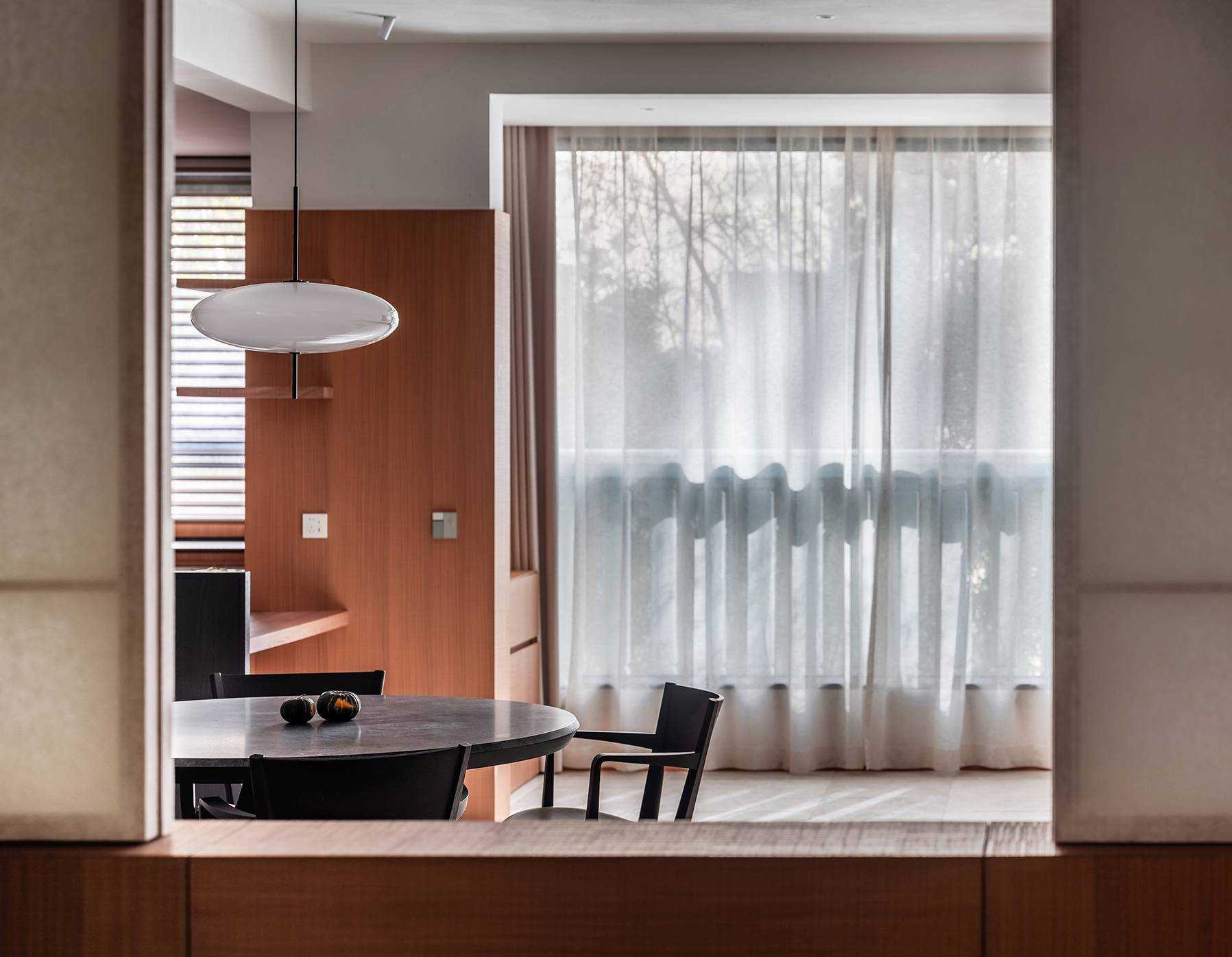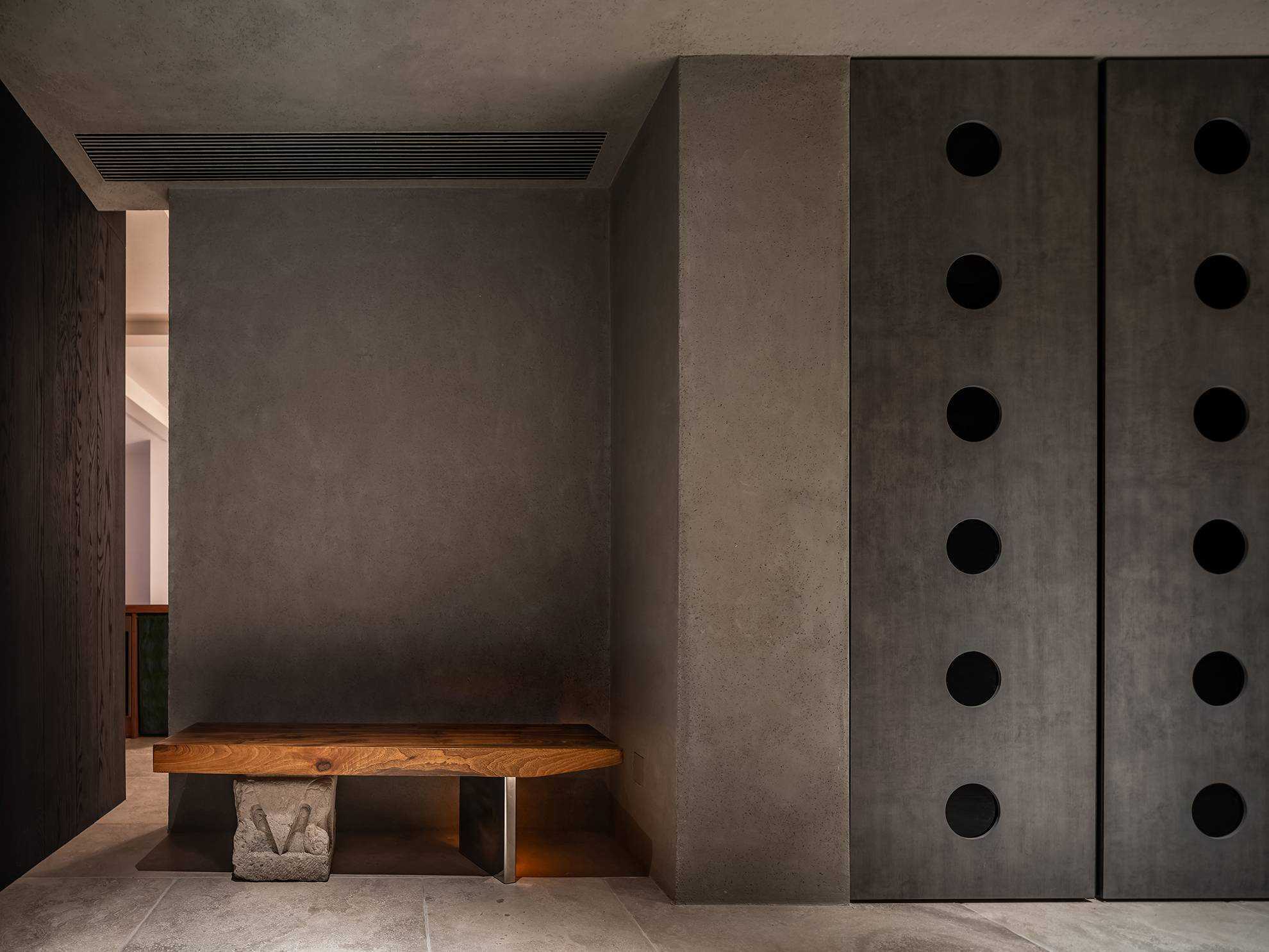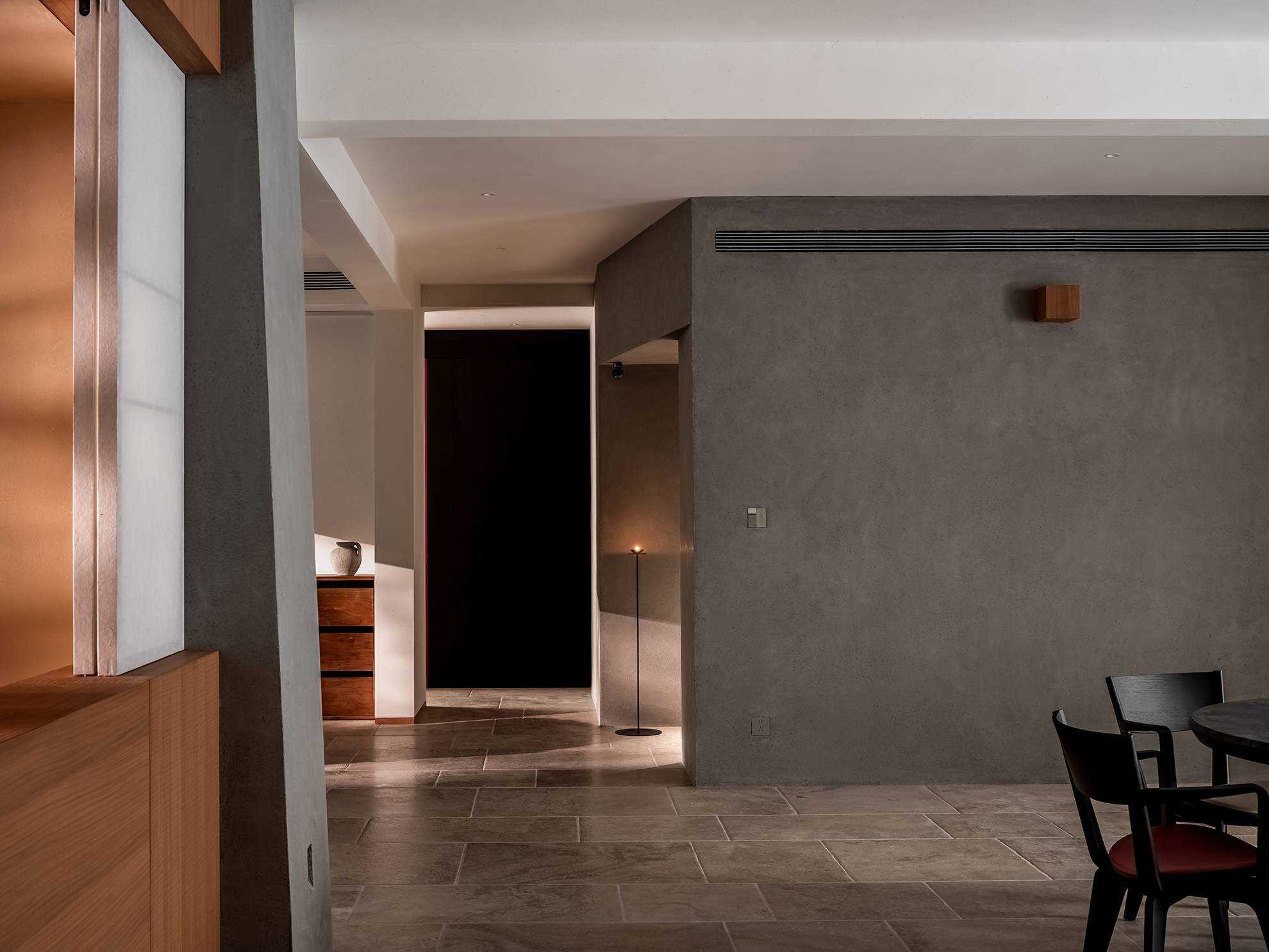| 本案是一个位于西安曲江池畔的旧房翻新项目。空间设计以探讨现代住宅文化中的自然与人文关系为出发点,将感知体验与禅理佛道的意境相结合,洞悉空间感知之道。 住宅的原始空间划分较为琐碎,且位于一层,采光条件不佳,因此,我们在结构上进行了多处的拆改和优化,显著提升了空间的通透性和流动性。平面规划的重点在于不同功能区域在同一空间中的融合与独立,营造出一个即开放又具层次感的生活场域。 入口玄关区是作为整个空间的过渡区域,我们取消了原始结构中紧邻入口的客卫,并将其改造为一个独特的通过体验区。使归家的过程仿佛从石洞中穿行,用空间尺度的克制表达出独特的通过体验,在行进中完成由外至内的情绪转换,最终抵达豁然开朗的起居区域。 进入客厅,对称的布局模式使备靠阳台的沙发休闲区成为空间的核心,将空间自然分解为自由环绕的流动格局。传统的电视墙被取消,取而代之的是一排实木书架,赋予空间更多的文化氛围与功能性。 竹影解构光线,越过边界去探索未知。木与石的肌理重组阴影,温柔的抵抗着平庸与光滑。剥离脆弱的装饰性外壳,露出自然的纯粹感悟时间。 原始结构中的书房被改造成禅修室,为信佛的业主提供了一个在家修行的静谧空间。禅修室的南侧设计了取景框式的造型,将阳台外的竹景引入室内,营造出一种宁静而深远的氛围。 餐厅区域混凝土浇筑的洗手池与禅室空间可移动的和纸窗扇均在现场完成,厨房空间的部分实木橱柜与阳台区域的木地板均为关中地区的老榆木再加工完成,搭配扎染的布帘与木门上铜版也是为了重现那份温暖与熟悉。烹饪区前侧的铜版更是“时间的记录着”,每一次烹饪,蒸汽与油脂都会在铜版上留下痕迹,时间将会把它变得斑驳和富有质感。 作为空间中的线形雕塑,做旧钢管以锈蚀的痕迹在混凝土水池表面书写时间。 卧室是我们栖居时间最久的空间,我们的策略是保持适度的退让,床头区域未做过多的造型处理,希望通过留白来保持空间的包容性和宁静感,同时确保足够的舒适度。 本案整体设计侧重对人与空间对自然的感知,并理性的融入禅意,以现代生活方式的语言呈现出素雅并富有生机的东方美学。 | |||