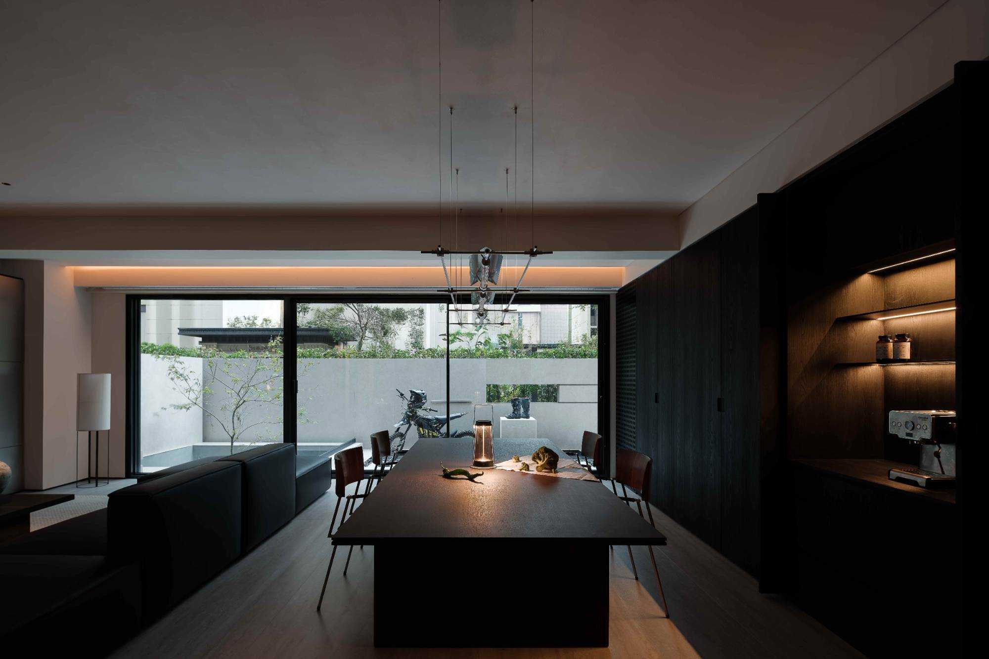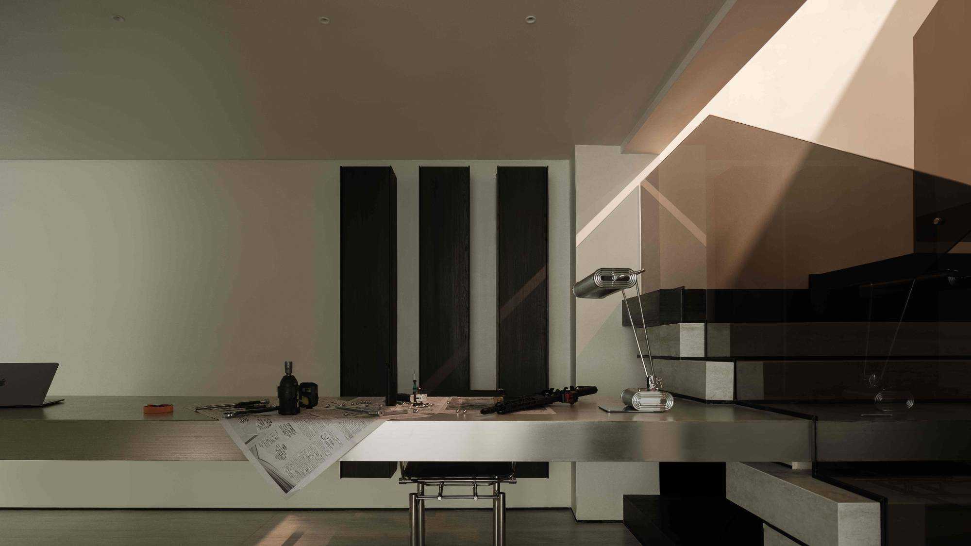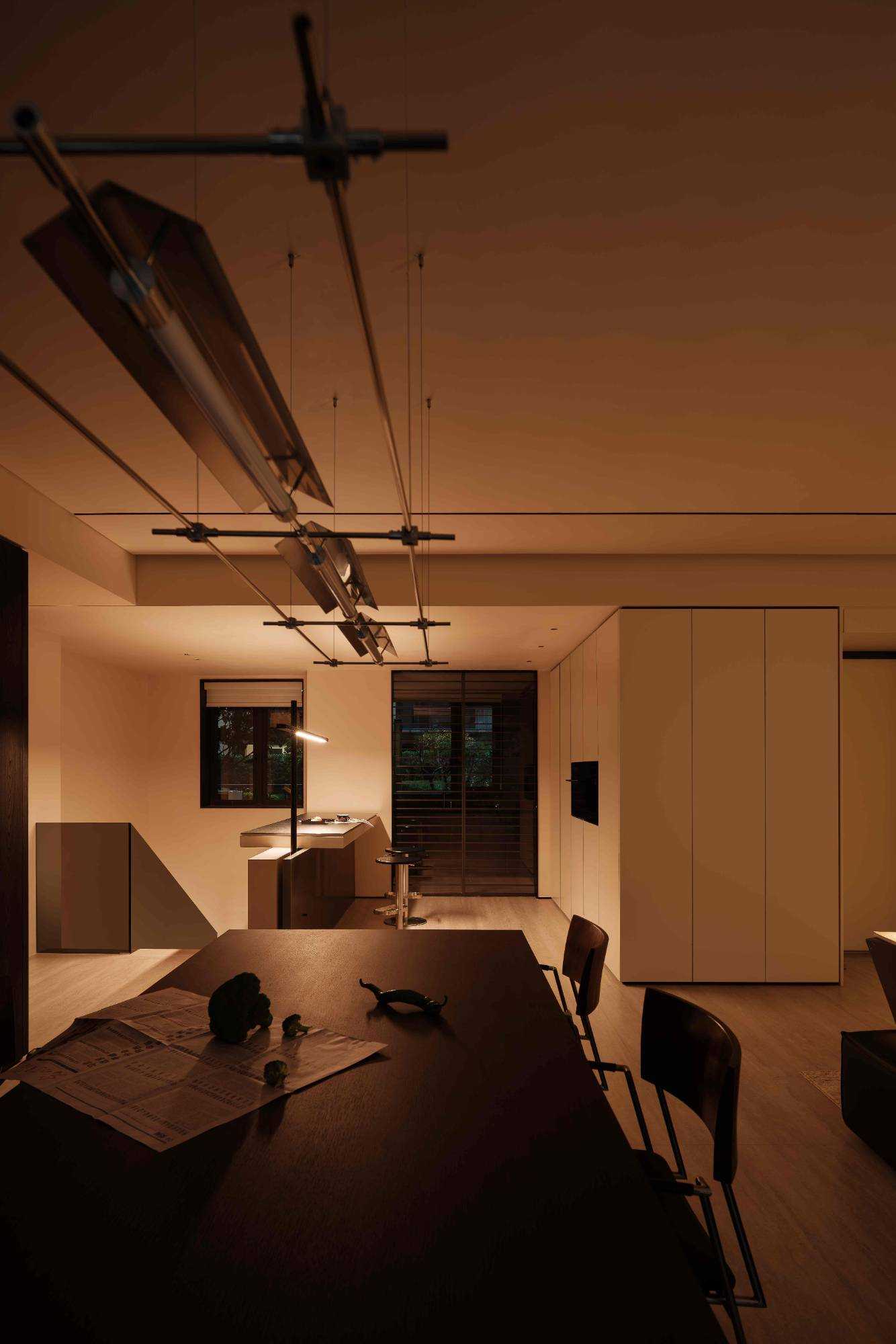 | 私宅 | 向光生长 01打开光的视界 设计希望呈现一个安静的空间,居住在此的是一对年轻夫妇与一个十岁的孩子,因有二胎计划,所以在空间设计计划中,不仅需要考虑外观的呈现符合居者审美,在功能上也需要满足未来的生活状态。 项目拥有地上地下共两层空间,在冗杂的立面结构中分离出明晰的动线,规划布局结构,导向光线,是此次设计的重中之重。 原空间的地下室相对封闭,四面都是墙壁,采光较为不足,作为居住空间来说,显然是不够舒适的。 于是设计的第一步是考虑如何将光线向下渗透,设计通过打开一二层空间的平面状态,形成贯通的场景,如此一来,自然光得以透入地下空间,形成明暗交错的视觉关系,也为原显闭塞的地下空间带来向上的张力。 打破传统密闭影音室与独立休闲区,在地下空间设计敞开式的交融性场景搭建,以不同的地面材质或是高低错落的顶面处理完成功能性的分割,如此形成交流的闭环,使人在场景中的各处,都可以完成目光与氛围的互动。 业主喜欢机械的拼搭,享受刺激冒险的生活状态,需要一处可以沉浸式享受个人趣味,但同时能够满足家庭沟通的场景作为工作区域。 这个区域被归置于楼梯的转角,由楼梯的踏步延伸出不锈钢的工作台面,冷硬的金属光泽,回应机械装置的精密与流畅感。长条的桌面与敞开式的构造,既能满足使用功能,又可以在拼搭过程中,与孩子一同探讨合作,享受亲子互动的氛围感。 02以光为引,联动空间 在复式空间中,不同楼层间的交流感一直是设计思考的命题。从地下空间来看,自上倾泻而下的自然光代表着两层间的交流,而如何在地上空间合理强调地下室的存在,设计师选择用一处绿植做出回答。 栽植于地下花园的绿植,一路向上攀升,在地面展开枝丫,郁郁生长。隐喻空间随生活而成长的状态,也暗示多层空间中的并联关系。 客餐厅空间相互交融的同时,消解与室外的界限,形成内外联动的视觉效果,光线自然地随着空间的深入而渐次黯淡,层次分明的同时引导人们活动轨迹的汇聚,提供自由的交互场所。 03收束光线,创造氛围感 选择镂空的隔断引导光线的侵入,百叶窗挡住来自室外的打扰却并不影响窗外的绿意葱茏,在城市中居住,也能享受片刻所居山野的乐趣。 本案空间,围绕着光在室内的走势,规划空间存在的可能性,引导光线下倾,也引导目光上扬,在冷硬的建筑里探寻勃勃的生机,在四方的结构里寻找家的归途,设计以人为镜,以光为引,化形为生活的无限可能。 | |||