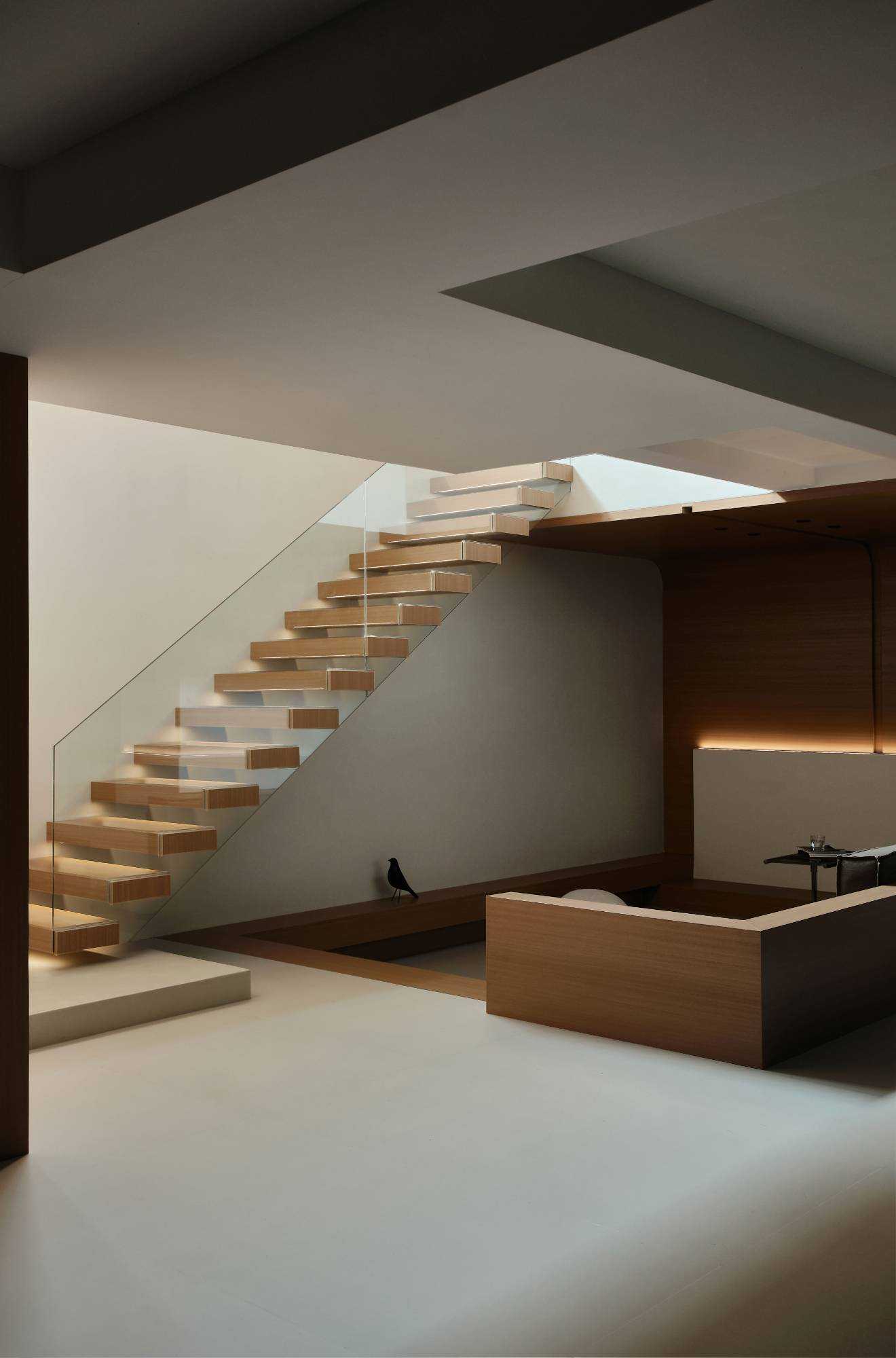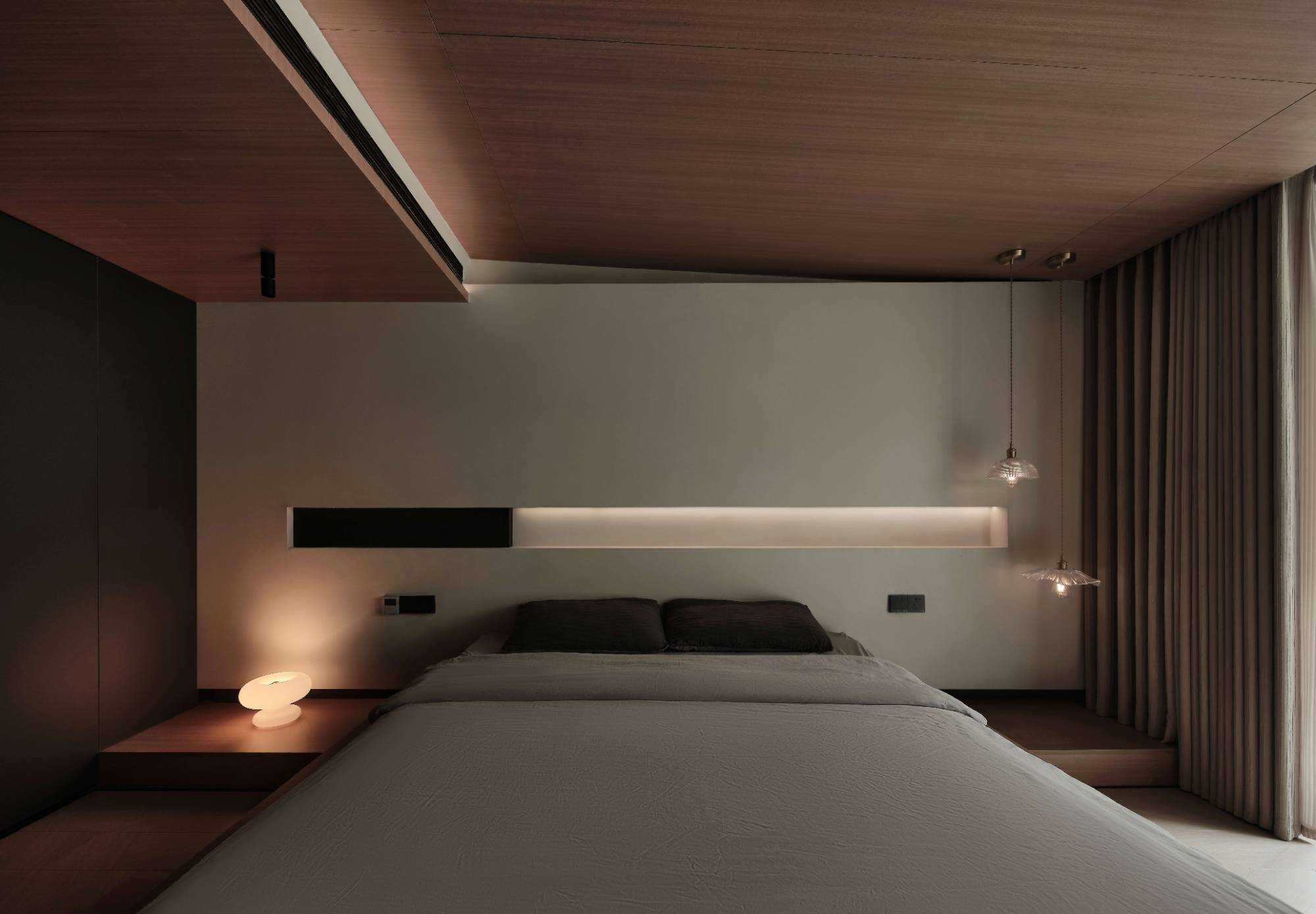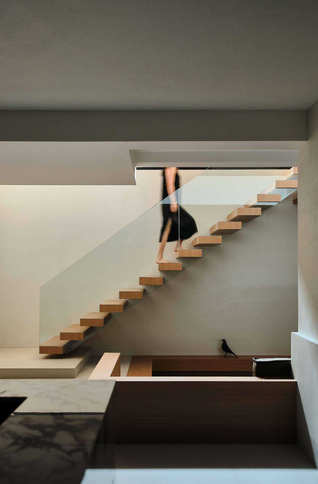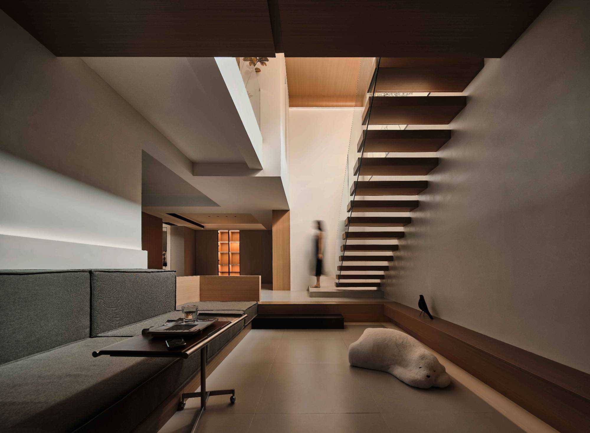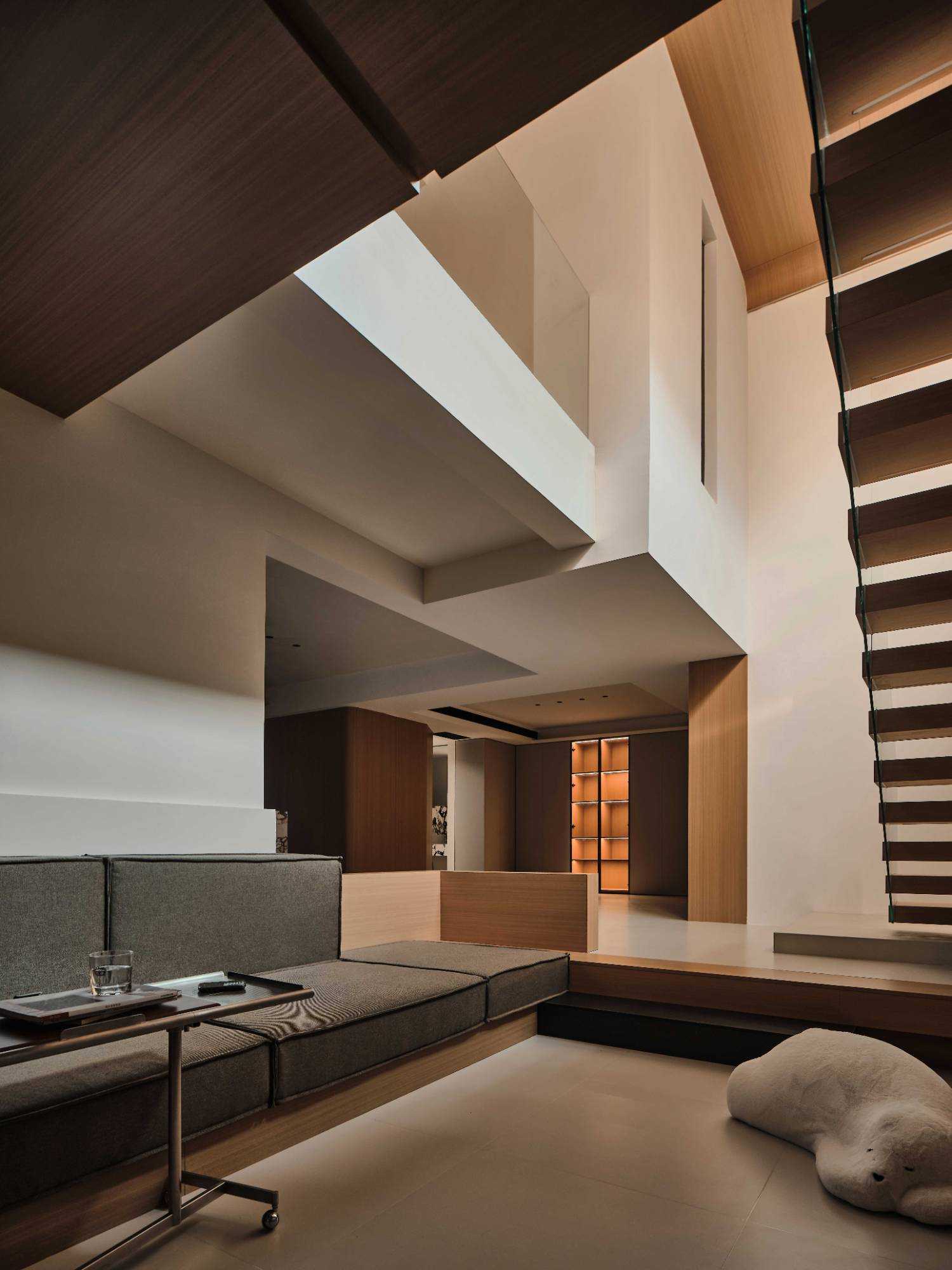 | 负二层空间概览 下叠因为其特殊的建筑特性,光线扮演着关键角色,经过多次推敲后,将原本闭塞的楼梯位置改置南面挑空区域,增加负二层的采光。 下沉式客厅在传统的平面空间中创造出独特的视觉和使用效果,在视觉上划分了空间,清晰的区分了不同生活区域,由于地面降低,从而改善了层高受限带来的空间局促,更加舒适和私密,提供了一个温馨的聚会空间,让人们可以放松和享受家庭时间。 餐厨区域整体紧靠北面天井,天井不仅仅是为了美观或者提供一个独特的建筑元素,它的重要性远远超出了这些,通过天井解决了中厨的排烟问题。 天井引入自然光和新鲜空气,极大地提升了地下层的居住质量,使其成为一个多功能的生活空间,无论是作为家庭娱乐中心、一个舒适的餐厨空间,还是一个充满自然光的工作区域,都能满足现代居住的多样需求。 客卧的落地窗和书桌的结合,不仅解决了采光问题,形成一个小造景,两个空间交互形成对话。在这盏灯下,在这一刻的静谧中,找到生活的深度和宁静的力量。 负一层空间概览 负一层作为日常起居,需要足够的私密性,将功能性的分区融入结构,让新的空间具有通透感... 负一层主卧区域现浇出一个挑空悬浮的“盒子”,并设置窗洞,在增加主卧采光的同时增加与负二层的交互性。 卧室通过色彩、材质和照明的巧妙运用,以及对细节的关注,创造出一个既具有美感又兼顾功能的私密空间。木制的斜面吊顶增加层高的同时,又增添了温暖和层次感。 衣帽间的折叠门保持了墙面的连续性,使用空间不被打断。 通过大片玻璃门与南面天井相连,既保持了私密性,又通过透明的界面引入了自然光线。 卧室不仅是休息的地方,更是一个逃离日常喧嚣、恢复精神和体力的避难所。在这里,每个细节都经过精心设计,确保居住者能够在这个空间中找到平衡和宁静,享受生活中的简单乐趣。 卫生间通过移位放置在天井区域,最大程度的提升泡澡的舒适性! 在这个繁忙的世界里,有一个角落属于静谧和自我思考——书房。半高的玻璃隔断,自然光透过天井洒落使得长时间的停留变得更加舒适... | |||