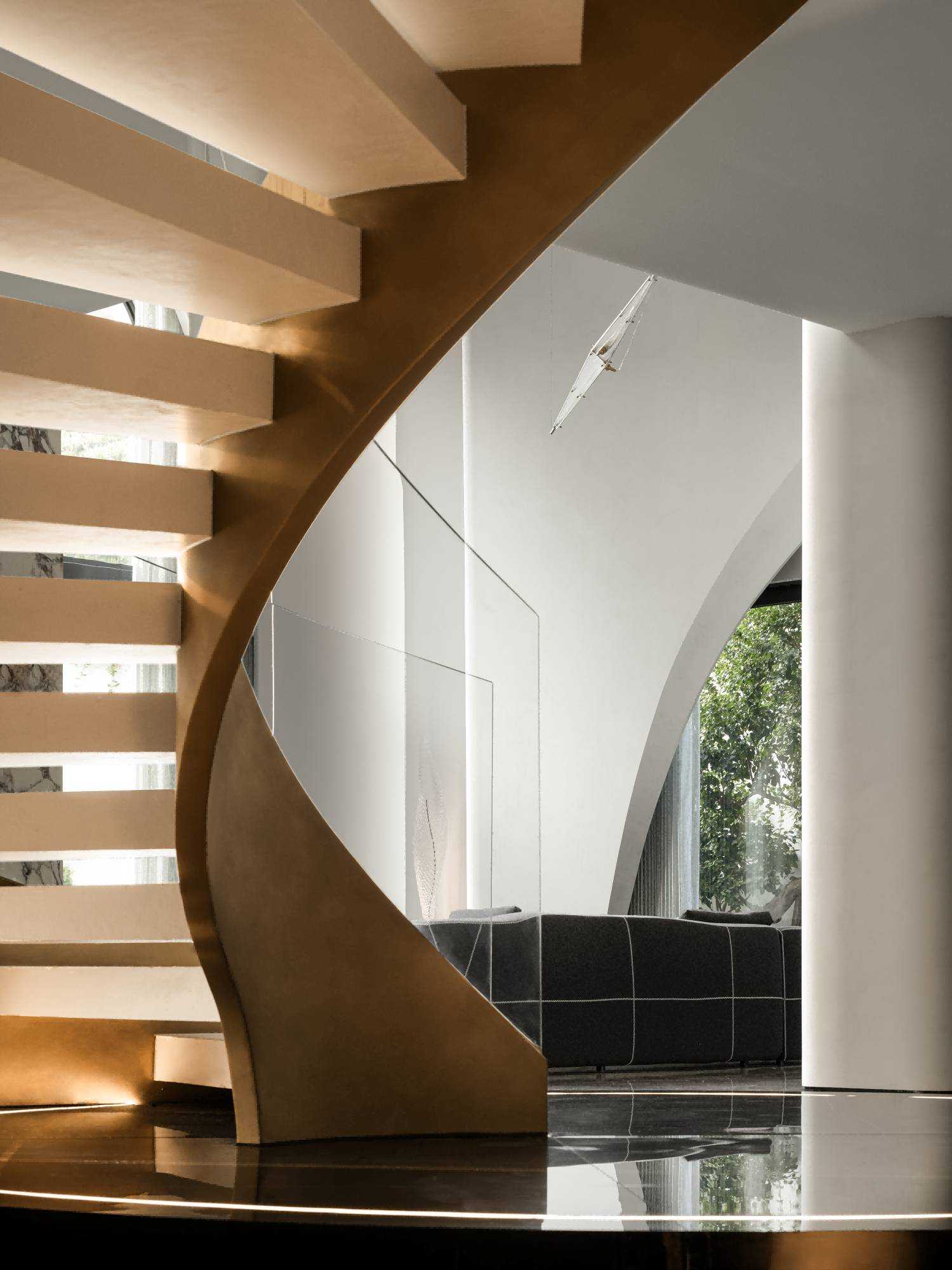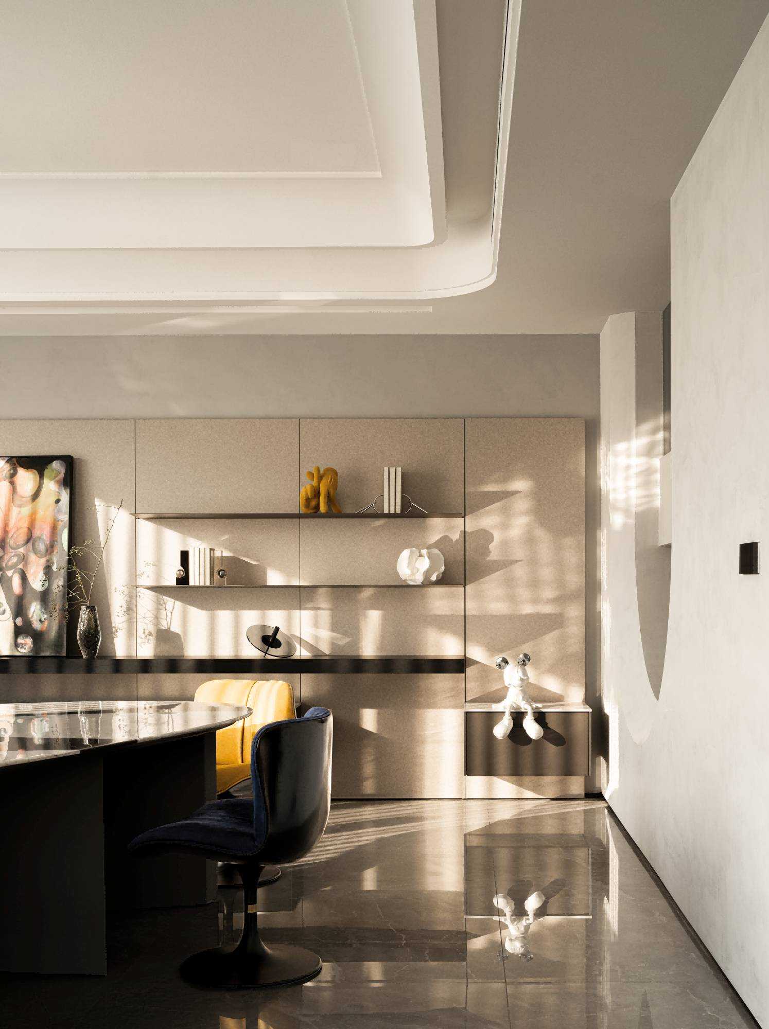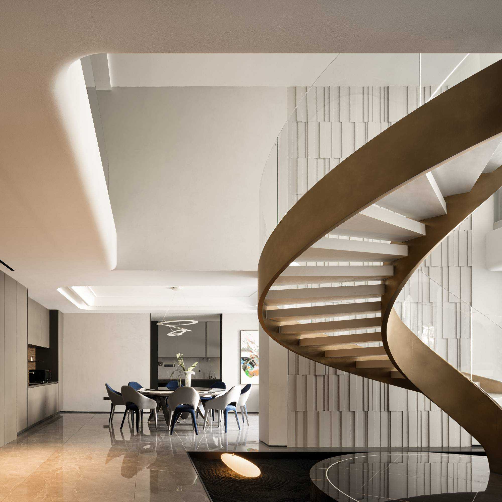 | 设计不应仅局限于空间的舒适感,更应提供与居者相匹配、甚至更高阶的生活方式,实现居者自我个性表达的同时,也能回归内心的宁静与安稳。这是设计师与业主达成的共识。 该项目位于重庆的半山之上,面朝嘉陵江和远山,室外是就山势、借远景、引溪水,顺势而为形成的外部环境,室内也以此为思路,依托建筑、围绕需求、营造场景,通过顺势演变的形态,突破传统的设计思路,并实现不可复制,是这个项目最大的特点。 借势原始通透的建筑结构,设计师将楼梯重新规划在负二层入户位置,一则形成极具装置艺术感的玄关,隔而不断且给人入户仪式感,二则无形中将空间分割,形成洄游动线,增加空间的探索性。 这一改动让负一层空间自然作为转换界面,可承载多条动线切换,两层空间因动线转换而完全开放,成为整个居所的活动中心. 在解决空间异形上,审美同样顺势而为。原始空间里两大承重柱,均以弧形包裹成柔和的柱体,与旋转楼梯和圆形地台相呼应,消弭在空间的建筑艺术感中。 以此整个空间开始延续弧形语言,半弧形态弱化方形窗体的突兀,顶面与墙面的转角以弧形过渡,线性灯光勾勒出建筑形态,让空间具有整体性与流畅性。 弧形元素贯穿到健身房,提取现代时尚的格栅造型,没有多余的设计,仅以流动的线条和极简质感的材质,将理性、克制、留白的空间留给运动的家人。 设计师聚焦居所的每个成员,既有各自涵养内心的归所,又有家人间亲密互动的场域,生活的诗意与家人间的爱意相融。 茶室与花园相接,极简的线条、轻盈的色调、当代的材质,都让茶室更显纯粹与轻松,在这里或一人独酌,或与友对饮,亦或与家人促膝交谈,都是最好的慢时光。 阳光朗朗,清风徐徐,琴声悠悠,琴房是居所的精神领地,伴随光影谱写着空间的节奏韵律。 户外花园映射着四时交替,室内处处标记着三餐烟火与日常印记。一楼阅读区贯穿超大落地窗景,为室内营造丰富的自然采光,光影斑驳在室内游走,让空间瞬间灵动。 简餐区和阅读空间相互延伸,位置上相对独立又完全开放,拥有极强的连贯性与包容性。 家最终的使命,是承载和陪伴。休闲区迎合当下孩子的童趣,选择简单且有趣味的软装,同时聚焦未来可适性,尽可能使用可灵活组合、调整的活动家具,以根据孩子的成长变化而适时改变空间属性。 书房的布置简约雅致,光透过百叶帘演绎空间的动与静,一盏舒适的台灯,一个精心挑选的书桌,在这个安静的小角落,是最沉浸的时光。 寝居,是涵养身心的归所,也是家人情感的凝聚点。三个孩子房聚集在同一层,各自拥有独立套房又有公共社交区供孩子共同玩耍,保证每个孩子独立性的同时,给予相互陪伴成长的空间。 大女儿选择自己最爱的白与灰作为空间主色调,形式简约、材质纯粹,明亮的光照进房间更显轻盈利落的质感。 儿子房选择蓝色作为点缀,正如男孩拥有稳定、淡然、勇敢的性格,特别的角落装饰也让他在专属空间里表达着个性的自己。 小女儿房利用墙面的弧度嵌入圆形床,与建筑墙体围合形成天然的包裹感;视线所及之处都是柔和的圆弧造型和软绵的材质,增加童趣的同时,也在细节中感知对家人的爱护。 主卧打开大大的落地窗,将户外露台的自然景观纳入室内,合上窗帘是静谧舒适的休憩空间,拉开窗帘是感受四时变化景致、弥漫自然气息的诗意世界。 延续动线的顺畅引导,洗漱、泡澡、淋浴、护理等流程都贴合着居者日常习惯,所有微小细节都将在日常中被感知到,从而由内生发出对美好生活的期待与欣喜。 | |||