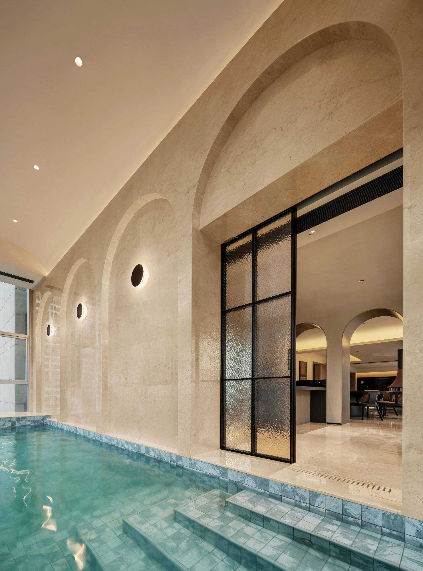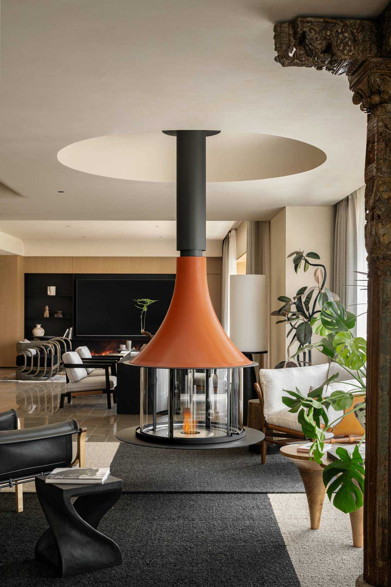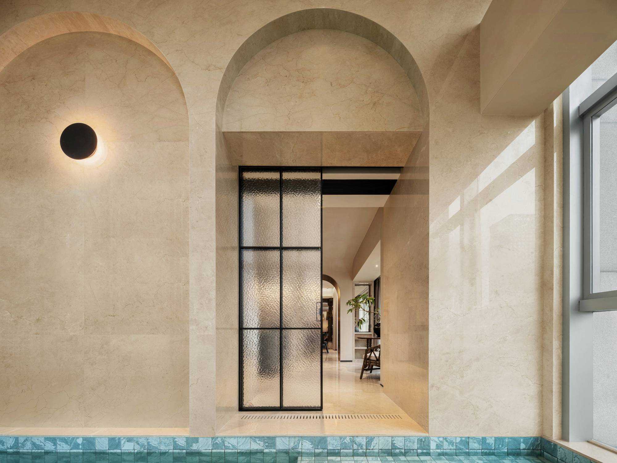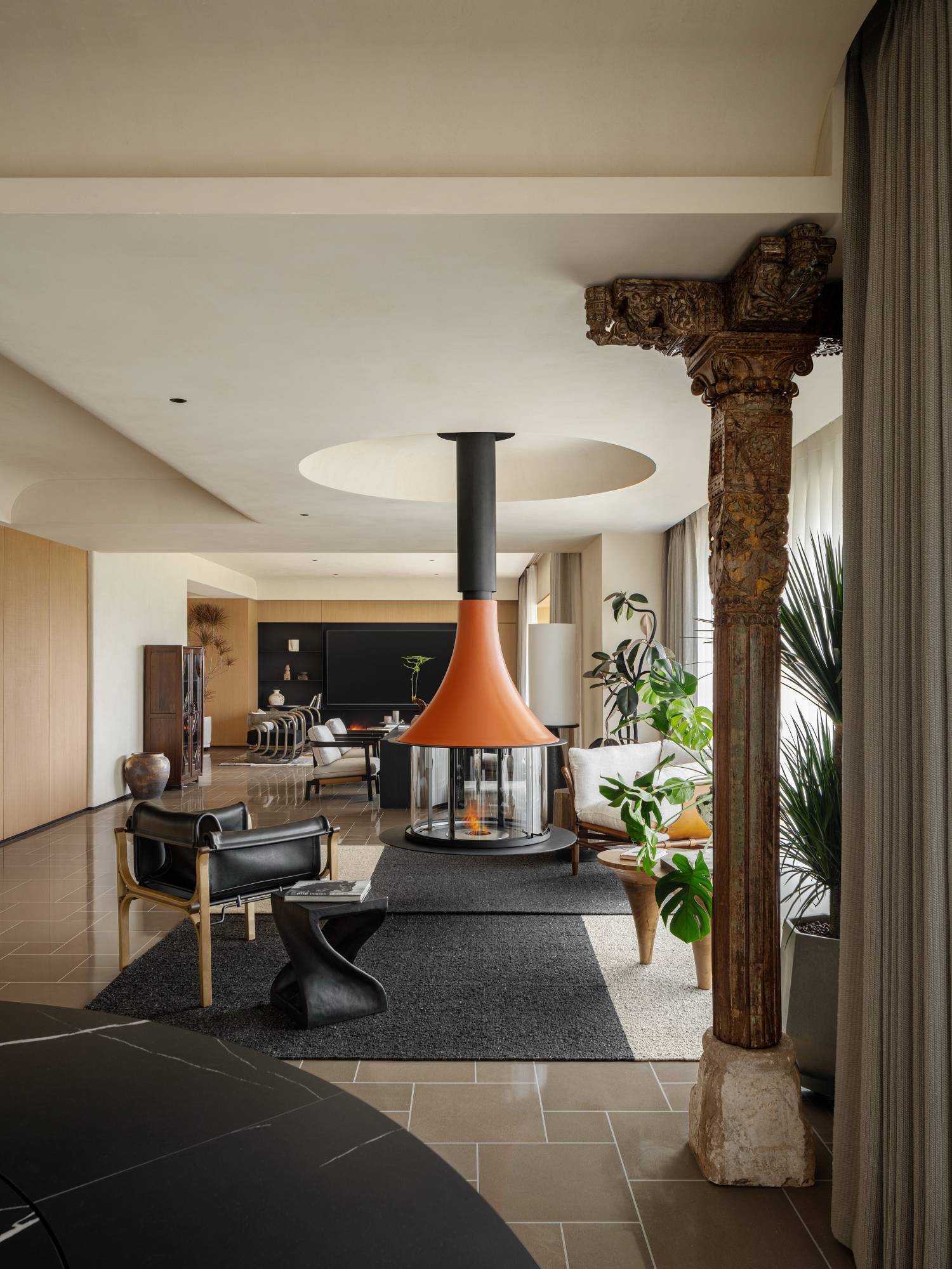| “侘是在简洁安静中融入质朴的美,寂是时间的光泽。” “复古”是一种存在于语言之外的美感,是一种需要用心去体验,用心去追随的宁静。是无需繁复修饰,在残缺中看见完整,在有限中感受无限的精神境界。正因如此,复古、侘寂、松弛感成为当下一剂疗愈人心的良药,在钢筋水泥铸造的城市广厦中,带给人凝固时间的闲适感。 以光为引 以意为境 “我把握住的,全变成光。我丢弃的,全变成灰烬。我是火焰,确实无疑。”——尼采 初入空间,便能感知场域的精神力量,循着一缕金丝猴蕨所指,火光构筑的诗意客厅映入眼帘。以带有圆弧天花的场景为叙始,垂吊壁炉为中心,窗边会客厅一如“空中花园”,勾勒全案视觉焦点。 空间黑色材质、不锈钢等现代元素的运用,以克制、精妙的手法展现,结合来自丹麦、法国、印度、东南亚等世界各地的家具,营造具有国际化符号,同时具备厚重感的空间特质。 生生灯火 明暗无辄 “人生忽如寄,莫辜负茶、汤和好天气。”——汪曾祺 设计师将平面布局进行了新的构思与布局,原先封闭的客厅被打开,获得更大的开放式宽敞社交空间。壁炉旁长案茶台接应客人、友人,不疾不徐地进入下一环节的感官之旅。 在一览城市风景的“空中庭院”旁侧,比邻茶台的另一方客厅,为好友相聚增加了延展空间,黑色体块解构雾化壁炉嵌入原木色电视背景墙,避免场域压抑,棕色牛皮沙发与藤编家具的混搭,则丰厚了空间的艺术层次,同时带来几分仿佛度假般的野趣。 幽微深处 其乐无穷 “生活可爱而光明,生活拥有黄金巷,我们想要更紧抓住生活,我们并不畏惧生活。”——里尔克 爱这人间,就该更爱这朝朝暮暮的烟火气。可围坐十二人的巨大圆形餐桌,会客宴请尽显大方优雅的气度,如逢喜宴,亦能寓意圆融、圆满,生活的好兆头由餐区开启。 餐厅的复古柱式来自印度百年古建构建,充满了人工雕琢与时光雕琢之美,将复古侘寂的精神安放,顶天立地,充斥整个空间。 悉听生命 无尽流动 “若更无山天地溷,纵还有石水云空。”——胡缵宗 室内泳池是松弛感私宅的亮眼一笔,使得居住感受更丰富,推开黑色隔扇拉门,别有洞天,碧蓝的柔波更增强了度假的代入感。夏日的闲暇午后,在私家泳池惬意放松,眺望远处光景,是无限奢侈的乐事。 一个房子的容量是有限的,而设计所创造的可能性却是无穷尽的。“克制”带来长情的满足感,“惜物”带来与时间抗衡的哲学。有别于传统豪宅,设计师试图创建一间有着“永恒回归”概念的家宅,提醒居者记忆与情感将在轮回中会不断被唤起。 | |||