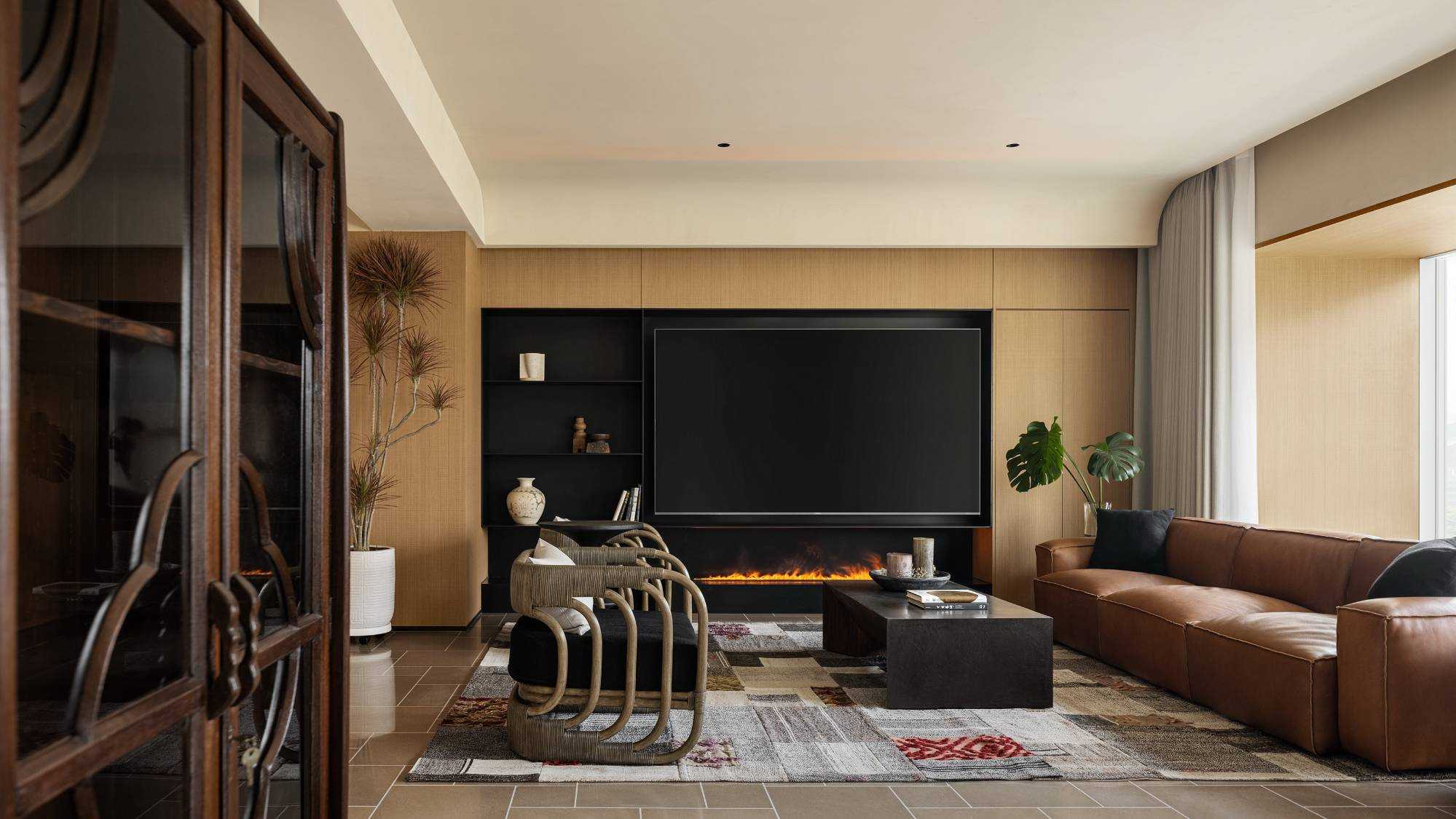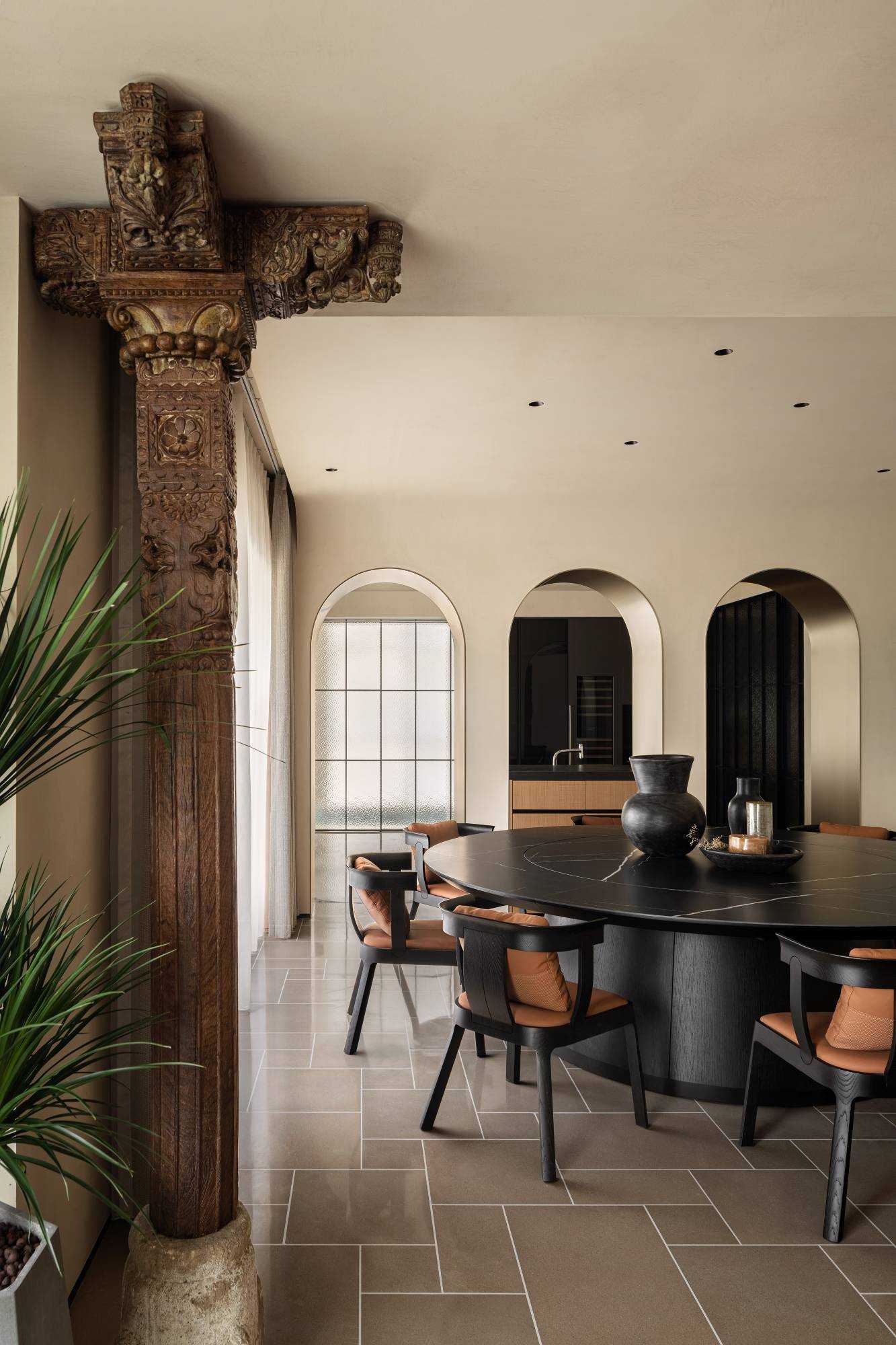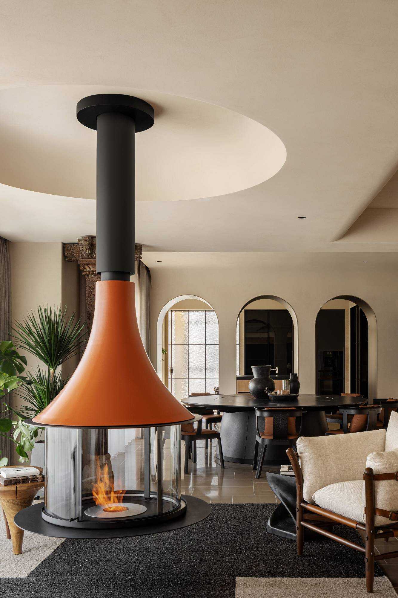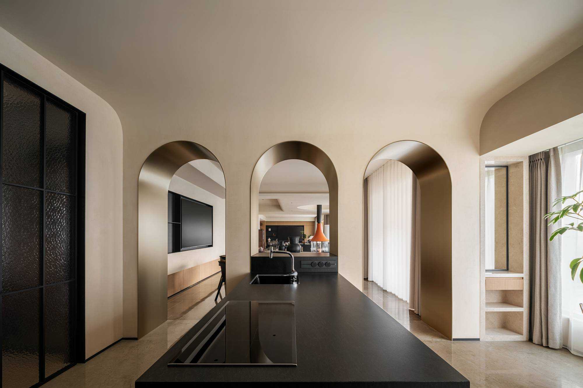 | “侘是在简洁安静中融入质朴的美,寂是时间的光泽。” “复古”是一种存在于语言之外的美感,是一种需要用心去体验,用心去追随的宁静。是无需繁复修饰,在残缺中看见完整,在有限中感受无限的精神境界。正因如此,复古、侘寂、松弛感成为当下一剂疗愈人心的良药,在钢筋水泥铸造的城市广厦中,带给人凝固时间的闲适感。 以光为引 以意为境 “我把握住的,全变成光。我丢弃的,全变成灰烬。我是火焰,确实无疑。”——尼采 初入空间,便能感知场域的精神力量,循着一缕金丝猴蕨所指,火光构筑的诗意客厅映入眼帘。以带有圆弧天花的场景为叙始,垂吊壁炉为中心,窗边会客厅一如“空中花园”,勾勒全案视觉焦点。 空间黑色材质、不锈钢等现代元素的运用,以克制、精妙的手法展现,结合来自丹麦、法国、印度、东南亚等世界各地的家具,营造具有国际化符号,同时具备厚重感的空间特质。 生生灯火 明暗无辄 “人生忽如寄,莫辜负茶、汤和好天气。”——汪曾祺 设计师将平面布局进行了新的构思与布局,原先封闭的客厅被打开,获得更大的开放式宽敞社交空间。壁炉旁长案茶台接应客人、友人,不疾不徐地进入下一环节的感官之旅。 在一览城市风景的“空中庭院”旁侧,比邻茶台的另一方客厅,为好友相聚增加了延展空间,黑色体块解构雾化壁炉嵌入原木色电视背景墙,避免场域压抑,棕色牛皮沙发与藤编家具的混搭,则丰厚了空间的艺术层次,同时带来几分仿佛度假般的野趣。 幽微深处 其乐无穷 “生活可爱而光明,生活拥有黄金巷,我们想要更紧抓住生活,我们并不畏惧生活。”——里尔克 爱这人间,就该更爱这朝朝暮暮的烟火气。可围坐十二人的巨大圆形餐桌,会客宴请尽显大方优雅的气度,如逢喜宴,亦能寓意圆融、圆满,生活的好兆头由餐区开启。 餐厅的复古柱式来自印度百年古建构建,充满了人工雕琢与时光雕琢之美,将复古侘寂的精神安放,顶天立地,充斥整个空间。 悉听生命 无尽流动 “若更无山天地溷,纵还有石水云空。”——胡缵宗 室内泳池是松弛感私宅的亮眼一笔,使得居住感受更丰富,推开黑色隔扇拉门,别有洞天,碧蓝的柔波更增强了度假的代入感。夏日的闲暇午后,在私家泳池惬意放松,眺望远处光景,是无限奢侈的乐事。 一个房子的容量是有限的,而设计所创造的可能性却是无穷尽的。“克制”带来长情的满足感,“惜物”带来与时间抗衡的哲学。有别于传统豪宅,设计师试图创建一间有着“永恒回归”概念的家宅,提醒居者记忆与情感将在轮回中会不断被唤起。 | |||