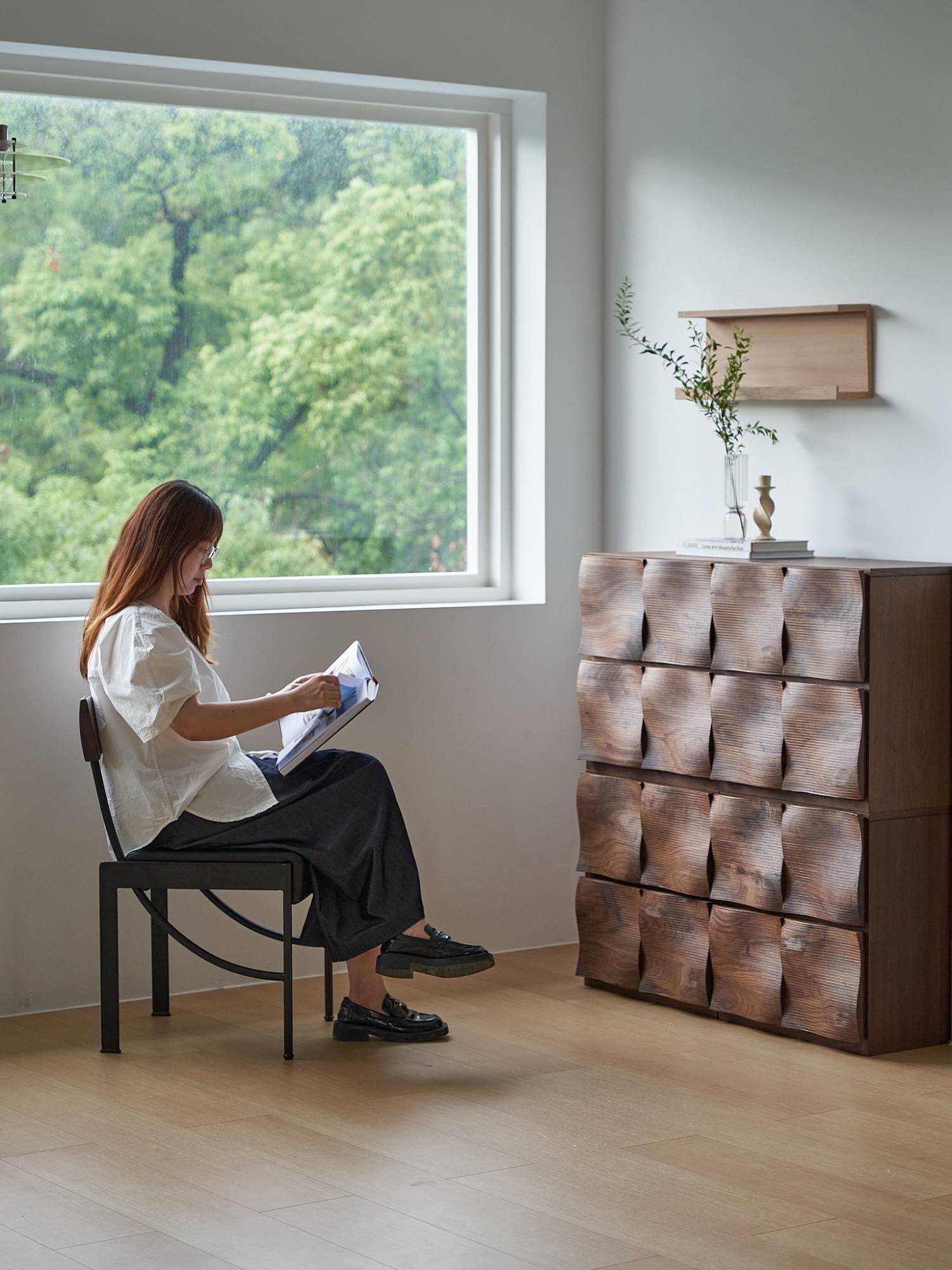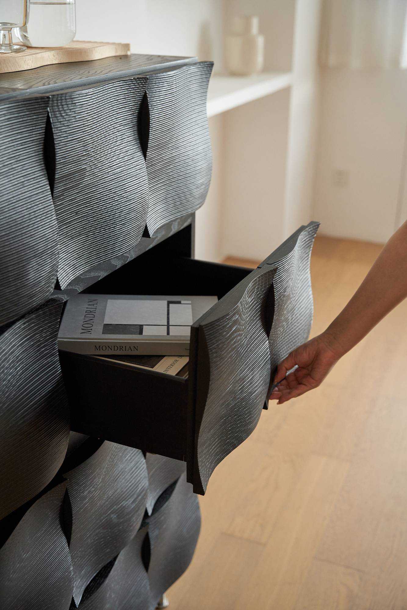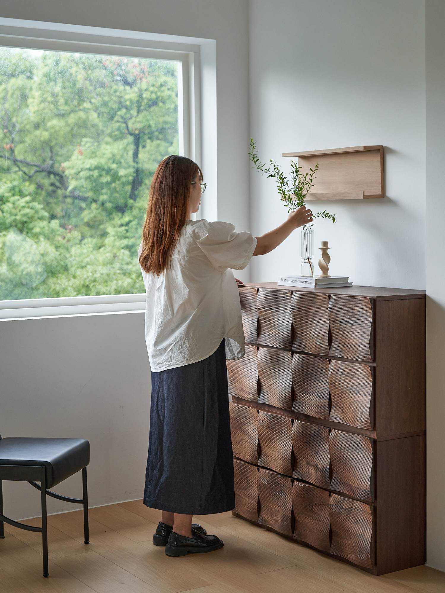 | 涟漪柜从水波的柔美形态中汲取灵感,将动态的涟漪凝固为优雅的曲面造型。使用数控雕刻实现涟漪层层荡漾的曲面造型,保留自然的切割痕迹,赋予柜门如水纹般流动的韵律。光线流转间,曲面呈现出优雅的光影变化,呈现波光粼粼的立体美感。涟漪柜能实现自由组合系统,模块化设计支持无限延展,既可独立作为边几、床头柜使用,也能通过金属构件稳固拼接,灵活适应电视柜、餐边柜、储物柜等多样场景。柜门采用无界拉手设计,四边位凹槽设计,无论从哪个角度都能轻松开启,兼顾美观与实用。涟漪柜以现代技术诠释自然意象,让家具成为融合艺术性与功能性的生活风景。 | |||