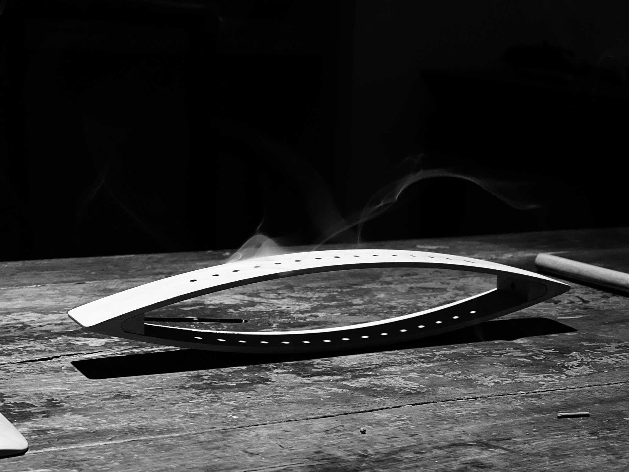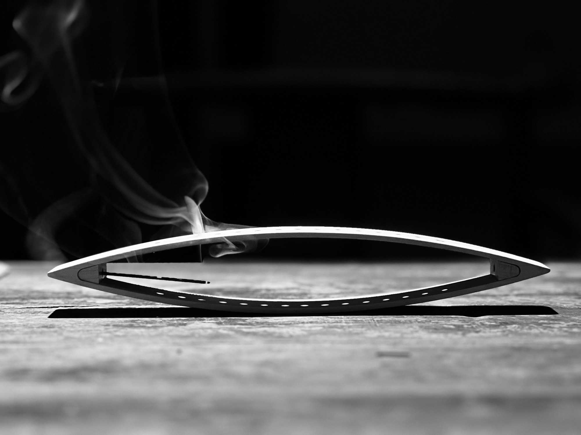 | 香器灵感来源于古时织布机所用“梭子”,以梭为型,倒立呈现,化尖角为香口,线香横挂悬空于梭中,香器表面均衡密布细孔,引烟透韵,顾取名“如影” | |||