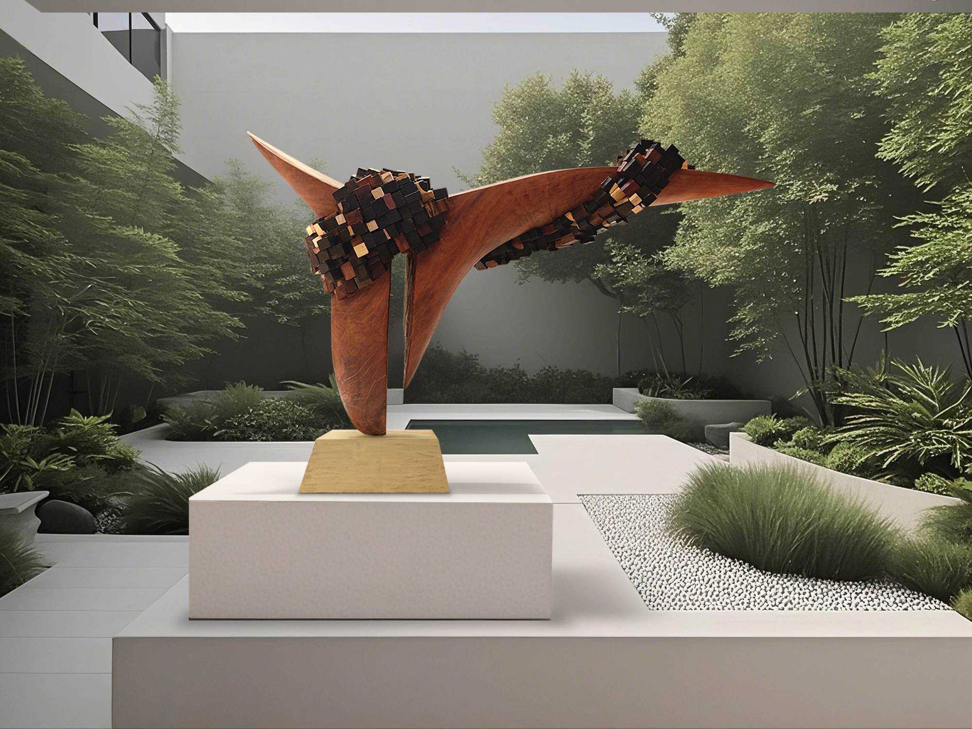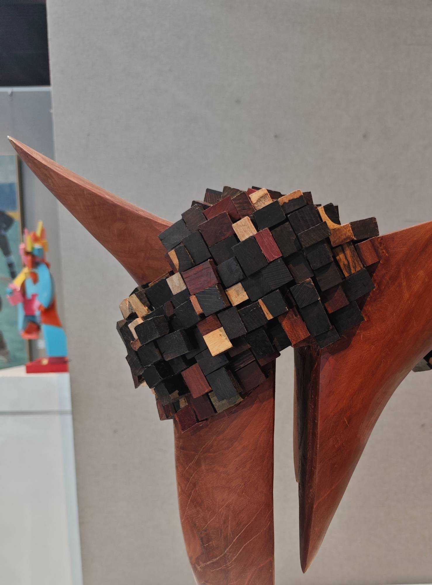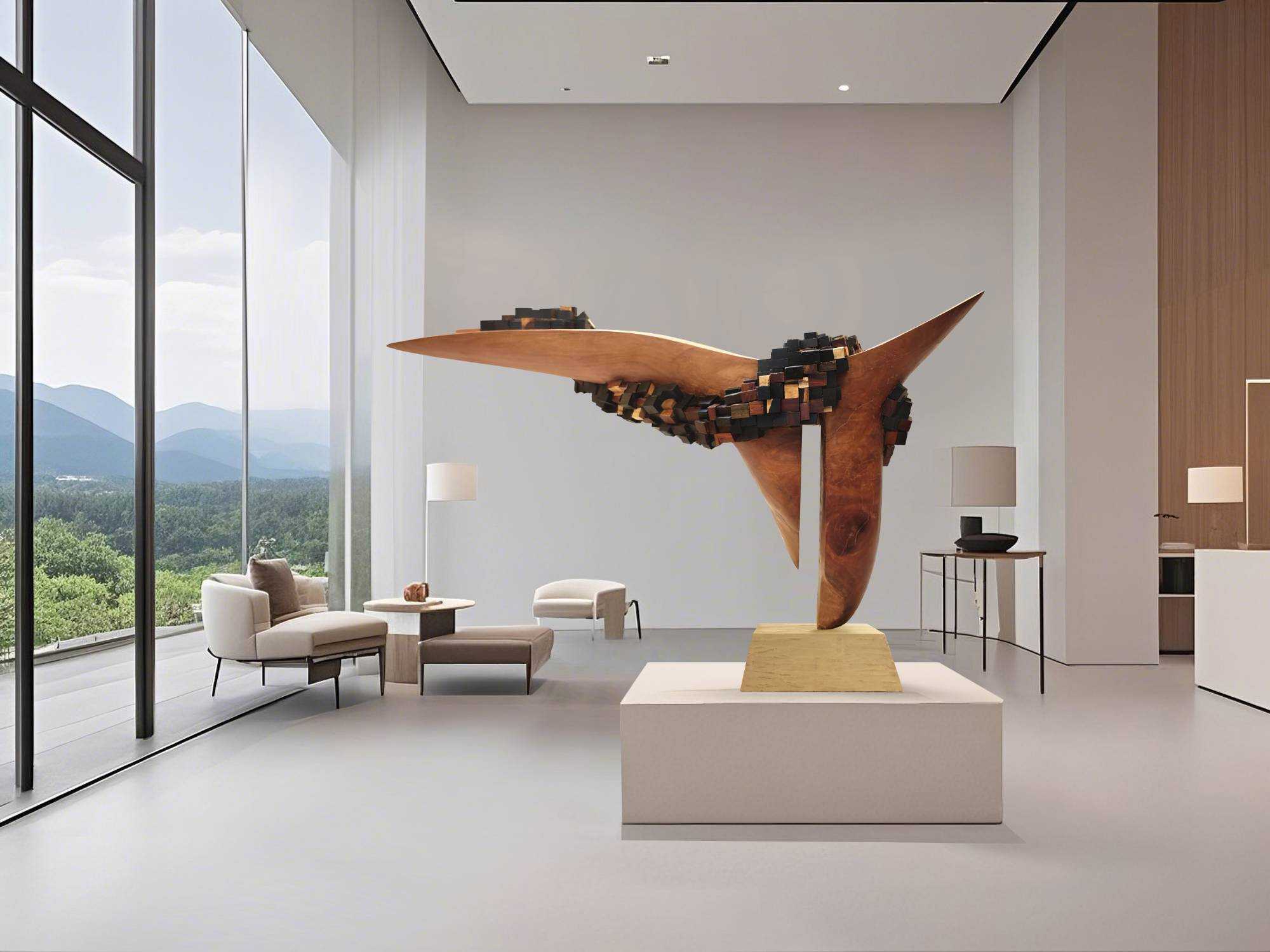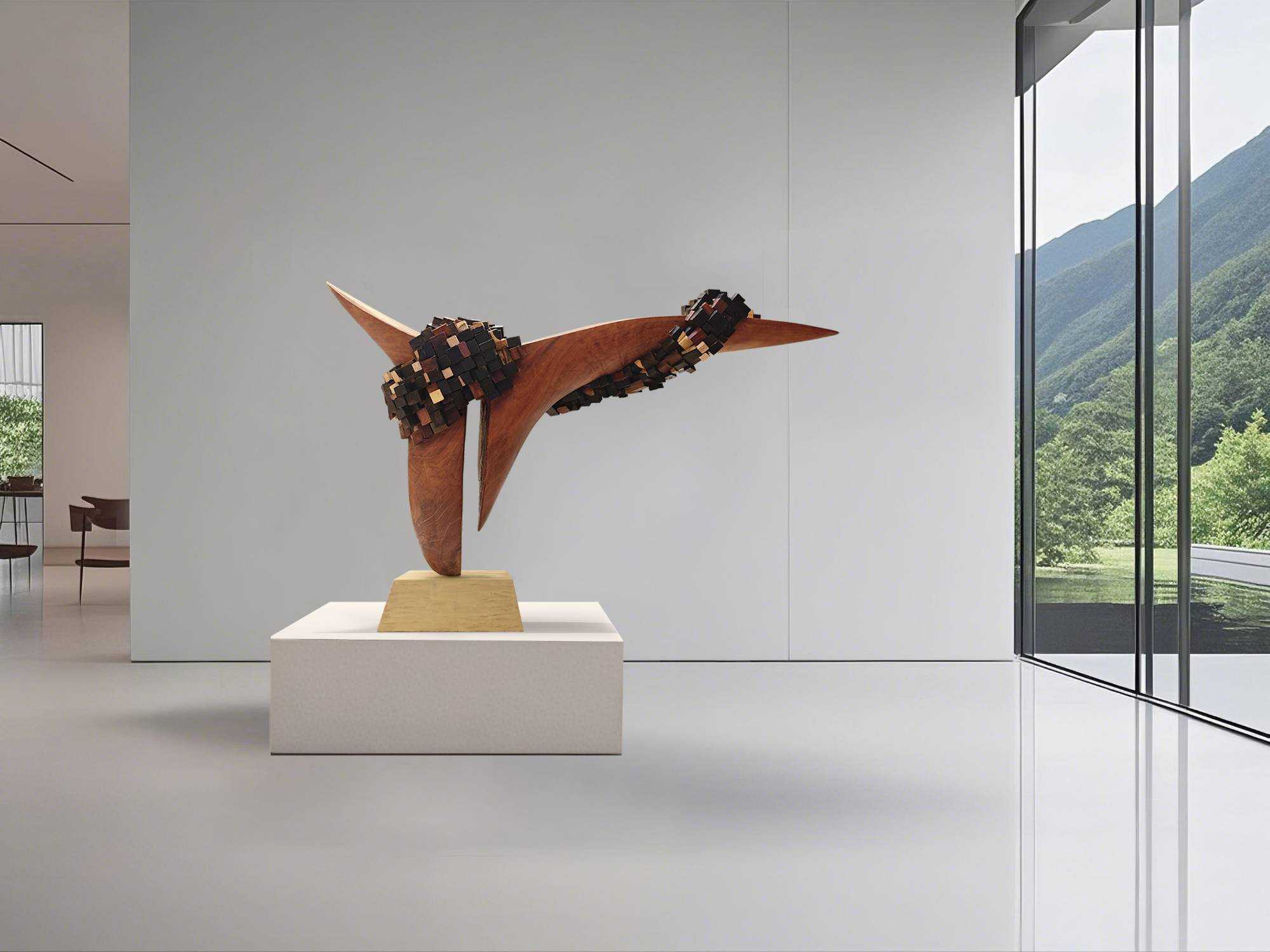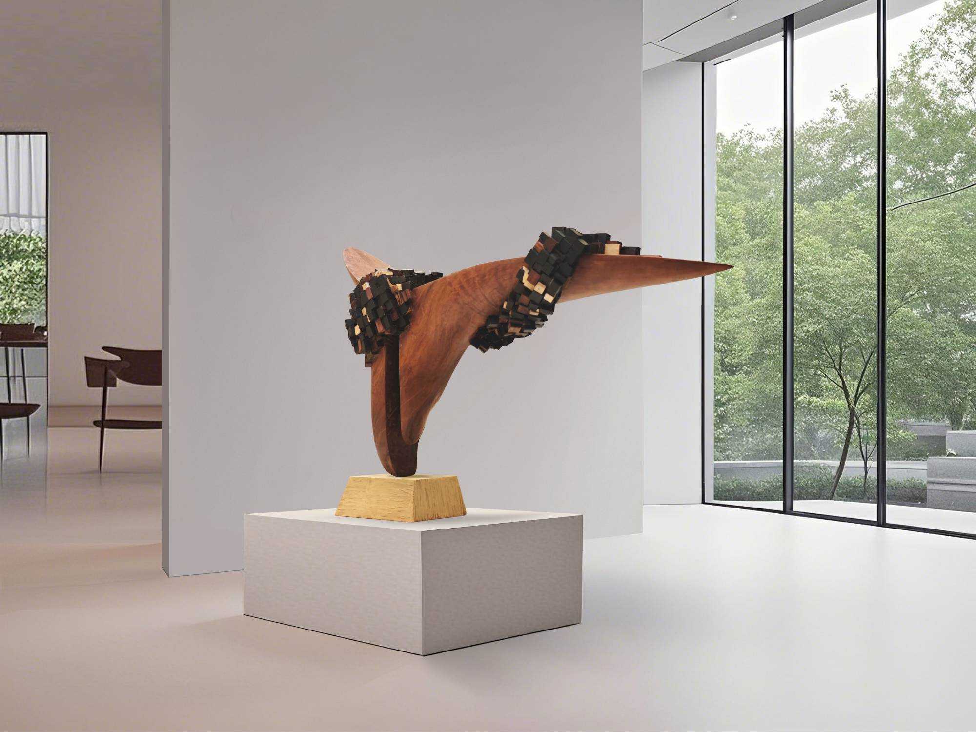 | 作品以木材为核心媒介,探索秩序与混沌的永恒博弈。主体流畅的实木造型,象征宇宙初始的简洁秩序,如自然法则般清晰、舒展,代表着世界本源的规整与统一,是稳定态的视觉化呈现。 缠绕其上的小块异色木构件,如同熵增作用下的无序碎片,以多元形态、色彩,隐喻宇宙发展中逐渐涌现的复杂与多样。它们打破主体单一性,既呼应现实世界因“熵变”产生的丰富性,又借缠绕姿态,诠释无序对有序的“冲击”与“重塑”——有序是基础框架,承载规律与稳定;无序是发展动力,赋予变化、创造与无限可能。 | |||